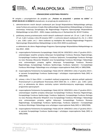 OŚWIADCZENIE UCZESTNIKA PROJEKTU W związku z przystąpieniem do projektu pn. „Postaw na przyszłość – postaw na siebie” nr RPMP.08.04.02-12-0038/15 oświadczam, że przyjmuję do wiadomości, iż: 1. administratorem moich danych osobowych jest Zarząd Województwa Małopolskiego pełniący swoje funkcje przy pomocy Urzędu Marszałkowskiego Województwa Małopolskiego w Krakowie, stanowiący Instytucję Zarządzającą dla Regionalnego Programu Operacyjnego Województwa Małopolskiego na lata 2014 – 2020, mający siedzibę przy ul. Racławickiej 56, 30-017 Kraków; 2. podstawę prawną przetwarzania moich danych osobowych stanowi art. 23 ust. 1 pkt 2 lub art. 27 ust. 2 pkt 2 ustawy z dnia 29 sierpnia 1997 r. o ochronie danych osobowych (t.j. Dz. U. z 2014 r. poz. 1182 z późn. zm.) – dane osobowe są niezbędne dla realizacji Regionalnego Programu Operacyjnego Województwa Małopolskiego na lata 2014-2020 na podstawie: w odniesieniu do zbioru Regionalnego Programu Operacyjnego Województwa Małopolskiego na lata 2014 - 2020: 1) rozporządzenia Parlamentu Europejskiego i Rady (UE) Nr 1303/2013 z dnia 17 grudnia 2013 r. ustanawiające wspólne przepisy dotyczące Europejskiego Funduszu Rozwoju Regionalnego, Europejskiego Funduszu Społecznego, Funduszu Spójności, Europejskiego Funduszu Rolnego na rzecz Rozwoju Obszarów Wiejskich oraz Europejskiego Funduszu Morskiego i Rybackiego oraz ustanawiające przepisy ogólne dotyczące Europejskiego Funduszu Rozwoju Regionalnego, Europejskiego Funduszu Społecznego, Funduszu Spójności i Europejskiego Funduszu Morskiego i Rybackiego oraz uchylające rozporządzenie Rady (WE) nr 1083/2006; 2) rozporządzenia Parlamentu Europejskiego i Rady (UE) Nr 1304/2013 z dnia 17 grudnia 2013 r. w sprawie Europejskiego Funduszu Społecznego i uchylające rozporządzenie Rady (WE) nr 1081/2006; 3) ustawy z dnia 11 lipca 2014 r. o zasadach realizacji programów w zakresie polityki spójności finansowanych w perspektywie finansowej 2014–2020 (Dz. U. z 2014 r. poz. 1146 z późn. zm.); w odniesieniu do zbioru centralny system teleinformatyczny wspierający realizację programów operacyjnych: 4) rozporządzenia Parlamentu Europejskiego i Rady (UE) Nr 1303/2013 z dnia 17 grudnia 2013 r. ustanawiające wspólne przepisy dotyczące Europejskiego Funduszu Rozwoju Regionalnego, Europejskiego Funduszu Społecznego, Funduszu Spójności, Europejskiego Funduszu Rolnego na rzecz Rozwoju Obszarów Wiejskich oraz Europejskiego Funduszu Morskiego i Rybackiego oraz ustanawiające przepisy ogólne dotyczące Europejskiego Funduszu Rozwoju Regionalnego, Europejskiego Funduszu Społecznego, Funduszu Spójności i Europejskiego Funduszu Morskiego i Rybackiego oraz uchylające rozporządzenie Rady (WE) nr 1083/2006; 5) rozporządzenia Parlamentu Europejskiego i Rady (UE) Nr 1304/2013 z dnia 17 grudnia 2013 r. w sprawie Europejskiego Funduszu Społecznego i uchylające rozporządzenie Rady (WE) nr 1081/2006; Projekt współfinansowany przez Unię Europejską w ramach Europejskiego Funduszu Społecznego INTERKADRA Sp. z o.o. ul. Wielicka 50 , 30-552 Kraków www.interkadra.pl 6) ustawy z dnia 11 lipca 2014 r. o zasadach realizacji programów w zakresie polityki spójności finansowanych w perspektywie finansowej 2014–2020 (Dz. U. z 2014 r. poz. 1146 z późn. zm.); 7) rozporządzenia Wykonawczego Komisji (UE) Nr 1011/2014 z dnia 22 września 2014 r. ustanawiające szczegółowe przepisy wykonawcze do rozporządzenia Parlamentu Europejskiego i Rady (UE) nr 1303/2013 w odniesieniu do wzorów służących do przekazywania Komisji określonych informacji oraz szczegółowe przepisy dotyczące wymiany informacji między beneficjentami a instytucjami zarządzającymi, certyfikującymi, audytowymi i pośredniczącymi; 3. moje dane osobowe będą przetwarzane wyłącznie w celu realizacji projektu „Postaw na przyszłość – postaw na siebie”, w szczególności potwierdzenia kwalifikowalności wydatków, udzielenia wsparcia, monitoringu, ewaluacji, kontroli, audytu i sprawozdawczości oraz działań informacyjno-promocyjnych w ramach Regionalnego Programu Operacyjnego Województwa Małopolskiego na lata 2014 – 2020 (RPO WM); 4. moje dane osobowe zostały powierzone do przetwarzania Instytucji Pośredniczącej Wojewódzki Urząd Pracy w Krakowie ul. plac Na Stawach 1, 30-107 Kraków, beneficjentowi realizującemu projekt – Interkadra Sp. z o.o. ul. Wielicka 50, 30-552 oraz podmiotom, które na zlecenie beneficjenta uczestniczą w realizacji projektu - Dariusz Pierzak - Szkolenia Projekty Doradztwo ul. Ujejskiego 316, 32-400 Myślenice. Moje dane osobowe mogą zostać przekazane podmiotom realizującym badania ewaluacyjne na zlecenie Powierzającego1, Instytucji Pośredniczącej lub beneficjenta. Moje dane osobowe mogą zostać również powierzone specjalistycznym firmom, realizującym na zlecenie Powierzającego, Instytucji Pośredniczącej oraz beneficjenta kontrole i audyt w ramach RPO WM; 5. podanie danych jest dobrowolne, aczkolwiek odmowa ich podania jest równoznaczna z brakiem możliwości udzielenia wsparcia w ramach projektu; 6. w ciągu 4 tygodni po zakończeniu udziału w projekcie udostępnię dane dot. mojego statusu na rynku pracy oraz informacje nt. udziału w kształceniu lub szkoleniu oraz uzyskania kwalifikacji lub nabycia kompetencji; 7. w ciągu trzech miesięcy po zakończeniu udziału w projekcie udostępnię dane dot. mojego statusu na rynku pracy; 8. do trzech miesięcy po zakończonym udziale w projekcie dostarczę dokumenty potwierdzające osiągnięcie efektywności zatrudnieniowej (podjęcie zatrudnienia lub innej pracy zarobkowej); 9. mam prawo dostępu do treści swoich danych i ich poprawiania. …..……………………………………… MIEJSCOWOŚĆ I DATA …………………………………………… CZYTELNY PODPIS UCZESTNIKA PROJEKTU Projekt współfinansowany przez Unię Europejską w ramach Europejskiego Funduszu