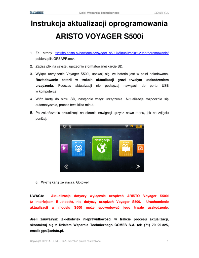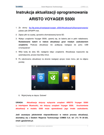 COMES S.A. Dział Wsparcia Technicznego Instrukcja aktualizacji oprogramowania ARISTO VOYAGER S500i 1. Ze strony ftp://ftp.aristo.pl/nawigacje/voyager_s500i/Aktualizacja%20oprogramowania/ pobierz plik GPSAPP.msk. 2. Zapisz plik na czystej, uprzednio sformatowanej karcie SD. 3. Wyłącz urządzenie Voyager S500i, upewnij się, Ŝe bateria jest w pełni naładowana. Rozładowanie urządzenia. baterii Podczas w trakcie aktualizacji aktualizacji nie grozi podłączaj trwałym nawigacji uszkodzeniem do portu USB w komputerze! 4. WłóŜ kartę do slotu SD, następnie włącz urządzenie. Aktualizacja rozpocznie się automatycznie, proces trwa kilka minut. 5. Po zakończeniu aktualizacji na ekranie nawigacji ujrzysz nowe menu, jak na zdjęciu poniŜej: 6. Wyjmij kartę ze złącza. Gotowe! UWAGA: Aktualizacja dotyczy wyłącznie urządzeń ARISTO Voyager (z interfejsem Bluetooth), nie dotyczy urządzeń Voyager S500. aktualizacji w modelu S500 moŜe spowodować jego trwałe S500i Uruchomienie uszkodzenie. Jeśli zauwaŜysz jakiekolwiek nieprawidłowości w trakcie procesu aktualizacji, skontaktuj się z Działem Wsparcia Technicznego COMES S.A. tel: (71) 79 29 325, email: [email protected]. Copyright © 2011, COMES S.A., wszelkie prawa zastrzeŜone 1