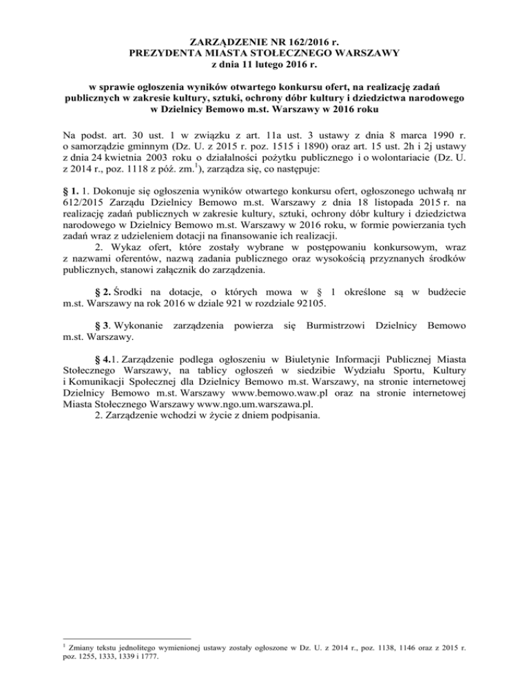 ZARZĄDZENIE NR 162/2016 r. PREZYDENTA MIASTA STOŁECZNEGO WARSZAWY z dnia 11 lutego 2016 r. w sprawie ogłoszenia wyników otwartego konkursu ofert, na realizację zadań publicznych w zakresie kultury, sztuki, ochrony dóbr kultury i dziedzictwa narodowego w Dzielnicy Bemowo m.st. Warszawy w 2016 roku Na podst. art. 30 ust. 1 w związku z art. 11a ust. 3 ustawy z dnia 8 marca 1990 r. o samorządzie gminnym (Dz. U. z 2015 r. poz. 1515 i 1890) oraz art. 15 ust. 2h i 2j ustawy z dnia 24 kwietnia 2003 roku o działalności pożytku publicznego i o wolontariacie (Dz. U. z 2014 r., poz. 1118 z póź. zm.1), zarządza się, co następuje: § 1. 1. Dokonuje się ogłoszenia wyników otwartego konkursu ofert, ogłoszonego uchwałą nr 612/2015 Zarządu Dzielnicy Bemowo m.st. Warszawy z dnia 18 listopada 2015 r. na realizację zadań publicznych w zakresie kultury, sztuki, ochrony dóbr kultury i dziedzictwa narodowego w Dzielnicy Bemowo m.st. Warszawy w 2016 roku, w formie powierzania tych zadań wraz z udzieleniem dotacji na finansowanie ich realizacji. 2. Wykaz ofert, które zostały wybrane w postępowaniu konkursowym, wraz z nazwami oferentów, nazwą zadania publicznego oraz wysokością przyznanych środków publicznych, stanowi załącznik do zarządzenia. § 2. Środki na dotacje, o których mowa w § 1 określone są w budżecie m.st. Warszawy na rok 2016 w dziale 921 w rozdziale 92105. § 3. Wykonanie zarządzenia powierza się Burmistrzowi Dzielnicy Bemowo m.st. Warszawy. § 4.1. Zarządzenie podlega ogłoszeniu w Biuletynie Informacji Publicznej Miasta Stołecznego Warszawy, na tablicy ogłoszeń w siedzibie Wydziału Sportu, Kultury i Komunikacji Społecznej dla Dzielnicy Bemowo m.st. Warszawy, na stronie internetowej Dzielnicy Bemowo m.st. Warszawy www.bemowo.waw.pl oraz na stronie internetowej Miasta Stołecznego Warszawy www.ngo.um.warszawa.pl. 2. Zarządzenie wchodzi w życie z dniem podpisania. 1 Zmiany tekstu jednolitego wymienionej ustawy zostały ogłoszone w Dz. U. z 2014 r., poz. 1138, 1146 oraz z 2015 r. poz. 1255, 1333, 1339 i 1777. Załącznik do zarządzenia nr 162/2016 Prezydenta m.st. Warszawy z dnia 11 lutego 2016 r. Lp. Nazwa oferenta Tytuł zadania publicznego Wysokość przyznanych środków publicznych 1. STOWARZYSZENIE NA RZECZ WARSZAWY, EDUKACJI, STUDENTÓW I TOLERANCJI WEST Niezapomniane przeboje… czyli z polską piosenką rozrywkową przez XX w.-cykl koncertów w Dzielnicy Bemowo m.st. Warszawy 12 000 92105 2360 2. BEMOWSKA WSPÓLNOTA SAMORZĄDOWA Rodzinne kreatywne warsztaty plastyczne 5 700 92105 2360 3. OŚRODEK WYCHOWAWCZO PROFILAKTYCZNY MICHAEL Akademia ikon na Bemowie 38 300 92105 2360 4. FUNDACJA SZTUKA CIAŁA Spotkania z pantomimą 9 000 92105 2360 5. FUNDACJA DOM KULTURY Bajki przy Amfiteatrze 12 000 92105 2360 6. FUNDACJA PROSCENIUM ,,Studio Filmowe – warsztaty” 38 000 92105 2360 7. FUNDACJA BLISKO LUDZI KABARET? KABARET! Każdy może być gwiazdą Bemowo 2016r. 15 000 92105 2360 8. FUNDACJA ATID Wielokulturowa Warszawa 10 000 92105 2360 15 000 92105 2360 20 000 92105 2360 16 250 92105 2360 9. FUNDACJA ART 10. FUNDACJA NASZYM DZIECIOM 11. ZESPÓŁ FOLKLORYSTYCZNY LAZURKI Uroczystość ku chwale przodków naszych Konstytucja 3 Maja - 225 lat temu Pokolenie Własnych Ścieżek cykl spotkań z "żywą historią" i wycieczek do miejsc pamięci związanych z okresem wojny i okupacji Ludowe wędrówki po Polsce Rozdział Paragraf 12. 13. FUNDACJA AKADEMIA IWONY KALAMAN Twórcza świetlica 45 500 92105 2360 FUNDACJA ARTYSTYCZNA MŁYN Realizacja autorskiego programu cyklu zajęć teatralnych dla dzieci w wieku przedszkolnym, w przedszkolach publicznych znajdujących się na terenie Dzielnicy Bemowo Miasta Stołecznego Warszawy 13 250 92105 2360 Razem 250 000