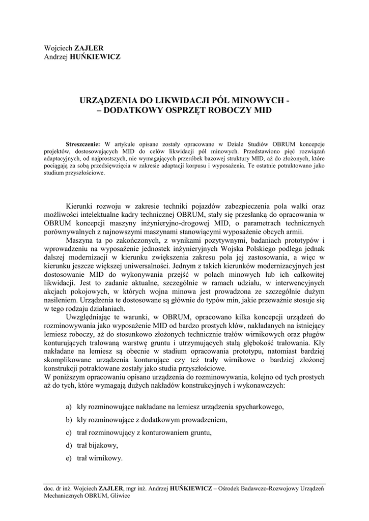 Wojciech ZAJLER Andrzej HUŃKIEWICZ URZĄDZENIA DO LIKWIDACJI PÓL MINOWYCH – DODATKOWY OSPRZĘT ROBOCZY MID Streszczenie: W artykule opisane zostały opracowane w Dziale Studiów OBRUM koncepcje projektów, dostosowujących MID do celów likwidacji pól minowych. Przedstawiono pięć rozwiązań adaptacyjnych, od najprostszych, nie wymagających przeróbek bazowej struktury MID, aż do złożonych, które pociągają za sobą przedsięwzięcia w zakresie adaptacji korpusu i wyposażenia. Te ostatnie potraktowano jako studium przyszłościowe. Kierunki rozwoju w zakresie techniki pojazdów zabezpieczenia pola walki oraz możliwości intelektualne kadry technicznej OBRUM, stały się przesłanką do opracowania w OBRUM koncepcji maszyny inżynieryjno-drogowej MID, o parametrach technicznych porównywalnych z najnowszymi maszynami stanowiącymi wyposażenie obcych armii. Maszyna ta po zakończonych, z wynikami pozytywnymi, badaniach prototypów i wprowadzeniu na wyposażenie jednostek inżynieryjnych Wojska Polskiego podlega jednak dalszej modernizacji w kierunku zwiększenia zakresu pola jej zastosowania, a więc w kierunku jeszcze większej uniwersalności. Jednym z takich kierunków modernizacyjnych jest dostosowanie MID do wykonywania przejść w polach minowych lub ich całkowitej likwidacji. Jest to zadanie aktualne, szczególnie w ramach udziału, w interwencyjnych akcjach pokojowych, w których wojna minowa jest prowadzona ze szczególnie dużym nasileniem. Urządzenia te dostosowane są głównie do typów min, jakie przeważnie stosuje się w tego rodzaju działaniach. Uwzględniając te warunki, w OBRUM, opracowano kilka koncepcji urządzeń do rozminowywania jako wyposażenie MID od bardzo prostych kłów, nakładanych na istniejący lemiesz roboczy, aż do stosunkowo złożonych technicznie trałów wirnikowych oraz pługów konturujących trałowaną warstwę gruntu i utrzymujących stałą głębokość trałowania. Kły nakładane na lemiesz są obecnie w stadium opracowania prototypu, natomiast bardziej skomplikowane urządzenia konturujące czy też trały wirnikowe o bardziej złożonej konstrukcji potraktowane zostały jako studia przyszłościowe. W poniższym opracowaniu opisano urządzenia do rozminowywania, kolejno od tych prostych aż do tych, które wymagają dużych nakładów konstrukcyjnych i wykonawczych: a) kły rozminowujące nakładane na lemiesz urządzenia spycharkowego, b) kły rozminowujące z dodatkowym prowadzeniem, c) trał rozminowujący z konturowaniem gruntu, d) trał bijakowy, e) trał wirnikowy. doc. dr inż. Wojciech ZAJLER, mgr inż. Andrzej HUŃKIEWICZ – Ośrodek Badawczo-Rozwojowy Urządzeń Mechanicznych OBRUM, Gliwice a) Kły rozminowujące nakładane na lemiesz urządzenia spycharkowego (Rys. 1) Rys. 1. Kły rozminowujące nakładane na lemiesz urządzenia spycharkowego Kły rozminowujące wg rys. 1 nakładane są na krawędzie natarcia, ułożonego w strzałę lemiesza roboczego MID. Do montażu kłów trałujących urządzenie spycharkowe nie wymaga żadnych przeróbek adaptacyjnych. Kły trałujące, jak pokazano na rysunku, zestawione są w pakiety montażowe. Na jednej płozie lemiesza nałożone są, na krawędź natarcia, cztery pakiety zawierające dwa kły i jeden skrajny zewnętrzny pakiet, mający trzy kły. Pakiety są tak ukształtowane, że siły skrawające na kłach, przejmuje krawędź natarcia lemiesza roboczego MID, śruby mocujące służą tylko do mocowania pakietów. Śruby te umieszczone są w tych samych otworach co śruby mocujące typowe ostrza skrawające urządzenia spycharkowego. Kły wykonane ze stali odpornej na ścieranie, usytuowane są równolegle do osi wzdłużnej pojazdu pod kątem ~ 62o30` do krawędzi natarcia. Żądaną głębokość trałowania utrzymują poziome płytki, ślizgające się po powierzchni trałowanego gruntu. Płytki te usytuowane są za krawędzią natarcia lemiesza. Wytrałowane miny odprowadzane są na boki jezdni, roboczym lemieszem MID, usytuowanym na czas trałowania w strzałę. Ruchy nastawcze, podnoszące i opuszczające, dokonywane są za pomocą mechanizmów urządzenia spycharkowego. Zestawy pakietów trałujących można montować na urządzeniu spycharkowym MID. Należy jednak uwzględnić, że zaleta prostoty i lekkości okupiona została pewnymi niedomaganiami do których zaliczyć trzeba to, że stosować go można do stosunkowo płaskiego terenu, jak również mało precyzyjne utrzymywanie żądanej głębokości trałowania. Charakterystyka techniczna Ilość kłów na urządzeniu trałującym [szt.] Głębokość trałowania [mm] Szerokość trałowania [mm] Kąt pochylenia kła [o] Kąt odchylenia lemiesza [o] Długość kła [mm] Rozstaw kłów [mm] Grubość kła [mm] 22 300 ~ 4088 40o 62o30` 500 158 20 b) Kły rozminowujące z dodatkowym prowadzeniem (Rys. 2) Rys. 2. Kły rozminowujące z dodatkowym prowadzeniem Urządzenie rozminowujące tego typu, bazuje na kłach trałujących opisanych uprzednio. Kły te są identyczne, zestawione w pakiety, nakładane na krawędź natarcia typowego urządzenia spycharkowego MID. Przesłanką konstrukcyjną tego urządzenia stanowi wymaganie bardziej precyzyjnego prowadzenia po gruncie, a szczególnie dokładniejsze utrzymywanie żądanej głębokości trałowania, Prowadnica umieszczona przed kłami trałującymi, która dodatkowo dochodzi w tym zestawie, mocowana jest w ramie podpartej trzypunktowo. Dwa tylne punkty mocujące, znajdują się na wspólnej osi z górnymi przegubami równoległoboku mocującego urządzenie spycharkowe MID do płyty czołowej korpusu wozu bazowego. Przedni punkt mocujący stanowi przedłużona oś pionowa zawiasu składającego lemiesze urządzenia spycharkowego w strzałę. W tym przypadku oś oryginalna musi być zastąpiona specjalną przedłużoną osią ustaloną w otworach zawiasów lemiesza na strzale. Urządzenie działa w ten sposób, że kiedy prowadnica usytuowana przed urz