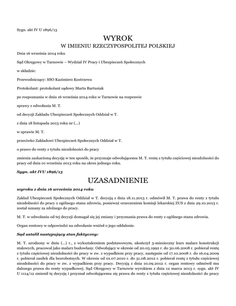 Sygn. akt IV U 1896/13 WYROK W IMIENIU RZECZYPOSPOLITEJ POLSKIEJ Dnia 16 września 2014 roku Sąd Okręgowy w Tarnowie – Wydział IV Pracy i Ubezpieczeń Społecznych w składzie: Przewodniczący: SSO Kazimierz Kostrzewa Protokolant: protokolant sądowy Marta Bartusiak po rozpoznaniu w dniu 16 września 2014 roku w Tarnowie na rozprawie sprawy z odwołania M. T. od decyzji Zakładu Ubezpieczeń Społecznych Oddział w T. z dnia 18 listopada 2013 roku nr (...) w sprawie M. T. przeciwko Zakładowi Ubezpieczeń Społecznych Oddział w T. o prawo do renty z tytułu niezdolności do pracy zmienia zaskarżoną decyzję w ten sposób, że przyznaje odwołującemu M. T. rentę z tytułu częściowej niezdolności do pracy od dnia 01 września 2013 roku na okres jednego roku. Sygn. akt IVU 1896/13 UZASADNIENIE wyroku z dnia 16 września 2014 roku Zakład Ubezpieczeń Społecznych Oddział w T. decyzją z dnia 18.11.2013 r. odmówił M. T. prawa do renty z tytułu niezdolności do pracy z ogólnego stanu zdrowia, ponieważ orzeczeniem komisji lekarskiej ZUS z dnia 29.10.2013 r. został uznany za zdolnego do pracy. M. T. w odwołaniu od tej decyzji domagał się jej zmiany i przyznania prawa do renty z ogólnego stanu zdrowia. Organ rentowy w odpowiedzi na odwołanie wniósł o jego oddalenie. Sąd ustalił następujący stan faktyczny: M. T. urodzony w dniu (...) r., z wykształceniem podstawowym, ukończył 3-miesieczny kurs malarz konstrukcji stalowych, pracował jako malarz budowlany. Odwołujący w okresie od 20.05.1992 r. do 30.06.2008 r. pobierał rentę z tytułu częściowej niezdolności do pracy w zw. z wypadkiem przy pracy, następnie od 17.10.2008 r. do 16.04.2009 r. pobierał zasiłek dla bezrobotnych. W okresie od 01.07.2010 r. do 31.08.2012 r. pobierał rentę z tytułu częściowej niezdolności do pracy w zw. z wypadkiem przy pracy. Decyzją z dnia 10.09.2012 r. organ rentowy odmówił mu dalszego prawa do renty wypadkowej. Sąd Okręgowy w Tarnowie wyrokiem z dnia 12 marca 2013 r. sygn. akt IV U 1114/12 zmienił tę decyzję i przyznał odwołującemu się prawa do renty z tytułu częściowej niezdolności do pracy na okres od 01.09.2012 r. na 1 rok. Na rozprawie w tym dniu odwołujący oświadczył, że domaga się renty z tytułu ogólnego stanu zdrowia. Sąd Apelacyjny w Krakowie wyrokiem z dnia 26 września 2013 r. sygn. Akt III AUa 588/13 w pkt. 1 zmienił zaskarżony wyrok i oddalił odwołanie, a w pkt. 2 wniosek o rentę z tytułu niezdolności do pracy z ogólnego stanu zdrowia z dnia 12.03.2012 r. przekazał do rozpoznania organowi rentowemu. Organ rentowy w wyniku rozpoznania tego wniosku z dnia 12.03.2013 r. wydał zaskarżoną decyzję. W dziesięcioleciu przed zgłoszeniem tego wniosku odwołujący legitymuje się wymaganym okresem składkowym i nieskładkowym. Dowód: akta rentowe, pismo ZUS z dnia 12.09.2014 r. z załącznikami –k. 33-35 as. Celem wyjaśnienia istoty sporu tj. istnienia u odwołującego niezdolności do pracy zarobkowej w rozumieniu art. 12, art. 13 ustawy z dnia 17 grudnia 1998 r. o emeryturach i rentach z Funduszu Ubezpieczeń Społecznych (Dz. U. Nr 162 poz. 1118 z późń zm.) Sąd dopuścił dowód z opinii biegłego sądowego specjalisty z zakresu kardiologii, chorób wewnętrznych, neurologii i chirurgii-ortopedii. Biegli sądowi w zbiorczej opinii pisemnej na podstawie wyników badań, w tym osobistego badania i zebranej w aktach sprawy dokumentacji lekarskiej rozpoznali u odwołującego: - wrodzony niedobór antytrombiny ATI, - przebytą obustronnie zatorowość płucną, - zakrzepicę żył głębokich kończyny dolnej prawej, - nadciśnienie tętnicze, - stan po złamaniu głowy kości promieniowej prawej w 1990 r., - POCHP. Biorąc pod uwagę rozpoznane u odwołującego schorzenia oraz stopień ich nasilenia biegli uznali odwołującego za częściowo niezdolnego do pracy od dnia 01.09.2013 r. na okres 1 roku. Jak wynika z uzasadnienia opinii, odwołujący w lipcu 2011 r. przebył zakrzepicę żył głębokich prawego podudzia i zatorowość obu płuc. Badany diagnozowany był w Poradni Nadkrzepliwości w K., gdzie rozpoznano niedobór czynnika ATI. Od czasu hospitalizacji w lipcu 2011 r. przyjmuje leki przeciwzakrzepowe – Warfin, pod kontrolą INR. W kontrolnym badaniu USG naczyń kończyn dolnych z dnia 15.04.2014 r. – obecne zmiany zakrzepowe stare obejmujące praktycznie cały układ żył głębokich prawej kończyny dolnej, z obecną rekanalizacją. W badaniu przedmiotowym obrzęk prawego podudzia znacznego stopnia. Odwołujący jest kierowany na zabieg operacyjny tłuszczaków pod stopą prawą, zgłasza ból przy dłuższym chodzeniu, staniu. Niedobór antytrombiny ma charakter wrodzony i przewlekły. U odwołującego wskazana jest bezterminowa antykoagulacja antagonistą witaminy K, regularna kompresja kończyn dolnych. Odwołujący jest zagrożony rozwojem zmian zakrzepowych i powikłaniami związanymi z przyjmowaniem antykoagulantów szczególnie w przebiegu nadciśnienia tętniczego, na które się leczy. Odwołujący w wypadku przy pracy w 1990 r. doznał złamania głowy kości promieniowej prawej. Badanie fizykalne narządu ruchu przeprowadzone przez biegłego ortopedę wykazało deformację obrysów nadgarstka prawego, brak pełnego wyprostu w łokciu prawym, deficyt o 30 stopni, ograniczenie ruchomości dolnego odcinka kręgosłupa. Stwierdzone schorzenia w sposób znaczny i długotrwały upośledzają stan zdrowia odwołującego czyniąc go częściowo niezdolnym do pracy na okres 1 roku z ogólnego stanu zdrowia. Odwołujący nie rokuje odzyskania zdolności do pracy nawet po przekwalifikowaniu. / dowód : opinia sądowo-lekarska – k. 11-14 as/. Wydaną w tym zakresie opinie biegłych sądowych Sąd uznał za trafną i dostatecznie wyjaśniającą przedmiot sporu, gdyż została wydana przez specjalistów z tego rodzaju schorzeń na jakie choruje odwołujący, po wnikliwej analizie aktualnych wyników bada