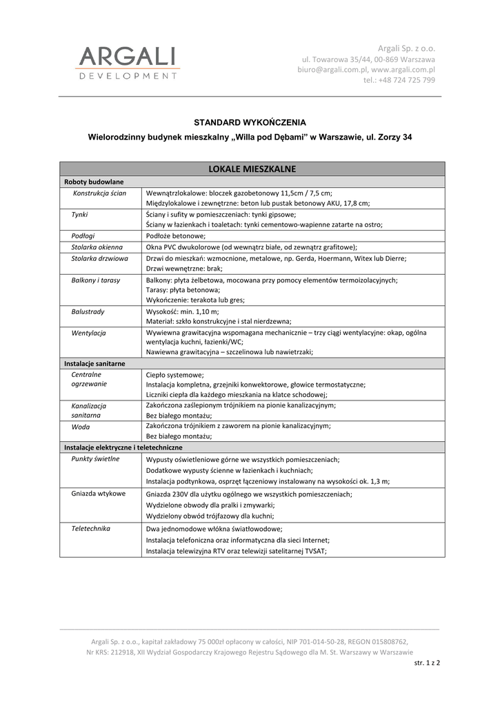 Argali Sp. z o.o. ul. Towarowa 35/44, 00-869 Warszawa [email protected], www.argali.com.pl tel.: +48 724 725 799 STANDARD WYKOŃCZENIA Wielorodzinny budynek mieszkalny „Willa pod Dębami” w Warszawie, ul. Zorzy 34 LOKALE MIESZKALNE Roboty budowlane Konstrukcja ścian Wewnątrzlokalowe: bloczek gazobetonowy 11,5cm / 7,5 cm; Międzylokalowe i zewnętrzne: beton lub pustak betonowy AKU, 17,8 cm; Tynki Ściany i sufity w pomieszczeniach: tynki gipsowe; Ściany w łazienkach i toaletach: tynki cementowo-wapienne zatarte na ostro; Podłogi Stolarka okienna Stolarka drzwiowa Podłoże betonowe; Okna PVC dwukolorowe (od wewnątrz białe, od zewnątrz grafitowe); Drzwi do mieszkań: wzmocnione, metalowe, np. Gerda, Hoermann, Witex lub Dierre; Drzwi wewnętrzne: brak; Balkony i tarasy Balkony: płyta żelbetowa, mocowana przy pomocy elementów termoizolacyjnych; Tarasy: płyta betonowa; Wykończenie: terakota lub gres; Balustrady Wysokość: min. 1,10 m; Materiał: szkło konstrukcyjne i stal nierdzewna; Wywiewna grawitacyjna wspomagana mechanicznie – trzy ciągi wentylacyjne: okap, ogólna wentylacja kuchni, łazienki/WC; Nawiewna grawitacyjna – szczelinowa lub nawietrzaki; Wentylacja Instalacje sanitarne Centralne ogrzewanie Ciepło systemowe; Instalacja kompletna, grzejniki konwektorowe, głowice termostatyczne; Liczniki ciepła dla każdego mieszkania na klatce schodowej; Zakończona zaślepionym trójnikiem na pionie kanalizacyjnym; Kanalizacja sanitarna Bez białego montażu; Zakończona trójnikiem z zaworem na pionie kanalizacyjnym; Woda Bez białego montażu; Instalacje elektryczne i teletechniczne Punkty świetlne Wypusty oświetleniowe górne we wszystkich pomieszczeniach; Dodatkowe wypusty ścienne w łazienkach i kuchniach; Instalacja podtynkowa, osprzęt łączeniowy instalowany na wysokości ok. 1,3 m; Gniazda wtykowe Gniazda 230V dla użytku ogólnego we wszystkich pomieszczeniach; Wydzielone obwody dla pralki i zmywarki; Wydzielony obwód trójfazowy dla kuchni; Teletechnika Dwa jednomodowe włókna światłowodowe; Instalacja telefoniczna oraz informatyczna dla sieci Internet; Instalacja telewizyjna RTV oraz telewizji satelitarnej TVSAT; _____________________________________________________________________________________________________ Argali Sp. z o.o., kapitał zakładowy 75 000zł opłacony w całości, NIP 701-014-50-28, REGON 015808762, Nr KRS: 212918, XII Wydział Gospodarczy Krajowego Rejestru Sądowego dla M. St. Warszawy w Warszawie str. 1 z 2 Argali Sp. z o.o. ul. Towarowa 35/44, 00-869 Warszawa [email protected], www.argali.com.pl tel.: +48 724 725 799 CZĘŚCI WSPÓLNE Ściany zewnętrzne i elewacje Ściana trójwarstwowa: bloczek gazobetonowy 19 cm, wełna mineralna 10-13 cm, pustka powietrzna ok. 2 cm, cegła elewacyjna 6 cm; Dachy Dach płaski docieplony styropianem; Warstwa górna: żwir płukany; Klatki schodowe i korytarze Ściany i sufity: tynki gipsowe, malowane farbami lateksowymi; Podłoga: łupek z kamienia naturalnego; Balustrady: stalowe malowane natryskowo lub drewno naturalne; Oprawy oświetleniowe, osprzęt elektryczny kompletny; Parking podziemny Ściany i słupy żelbetowe: wyrównane, malowane farbą do betonu; Ściany murowane: malowane farbą emulsyjną do wnętrz; Sufity: wełna mineralna; Posadzka: betonowa ze spadkiem, wykończona żywicą epoksydową w kolorze betonu; Instalacja elektryczna: kompletna zgodnie z projektem; Wentylacja: mechaniczna; Instalacje niskoprądowe: telewizja przemysłowa, detekcja CO2; Brama wjazdowa sterowana pilotem; Zagospodarowanie terenu Ciągi pieszo-jezdne: kostka granitowa, płyty betonowe; Ciągi jezdne: kostka betonowa, krawężniki i obrzeża wibroprasowane; Winda Na wszystkich kondygnacjach, włącznie z podziemną; Przystosowana dla osób niepełnosprawnych; Dostęp / bezpieczeństwo Wideodomofony; Telewizja przemysłowa / monitoring; Elektroniczna kontrola dostępu do części wspólnych; _____________________________________________________________________________________________________ Argali Sp. z o.o., kapitał zakładowy 75 000zł opłacony w całości, NIP 701-014-50-28, REGON 015808762, Nr KRS: 212918, XII Wydział Gospodarczy Krajowego Rejestru Sądowego dla M. St. Warszawy w Warszawie str. 2 z 2