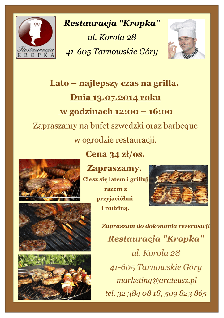 Restauracja "Kropka" ul. Korola 28 41-605 Tarnowskie Góry Lato – najlepszy czas na grilla. Dnia 13.07.2014 roku w godzinach 12:00 – 16:00 Zapraszamy na bufet szwedzki oraz barbeque w ogrodzie restauracji. Cena 34 zł/os. Zapraszamy. Ciesz się latem i grilluj razem z przyjaciółmi i rodziną. Zapraszam do dokonania rezerwacji Restauracja "Kropka" ul. Korola 28 41-605 Tarnowskie Góry [email protected] tel. 32 384 08 18, 509 823 865