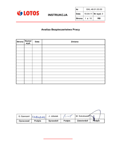 Nr INSTRUKCJA Data Strona Analiza Bezpieczeństwa Pracy Strona Numer wyd. Data Zmiana GKL.48.01.03.00 15-04-11 Nr wyd. 0 1 z 10 RB Nr Analiza Bezpieczeństwa Pracy Data Strona 1. GKL.48.01.03.00 15-04-11 Nr wyd. 1 2 z 10 RB CEL Celem niniejszej instrukcji jest zapewnienie, Ŝe dla kaŜdego etapu wykonywanej pracy zagroŜenia są utrzymane na poziomie tak niskim, jak tylko jest to racjonalnie moŜliwe. 2. ZAKRES STOSOWANIA Instrukcja odnosi się do wszystkich prac wymagających wejścia do wszelkiego rodzaju zbiorników, rurociągów i aparatów, oraz prac, które mogą generować szczególnie duŜe zagroŜenia dla zdrowia i Ŝycia ludzkiego. Instrukcja ma zastosowanie do prac wykonywanych na terenie: a) Grupy LOTOS S.A. w Gdańsku – tj. przy ul. Elbląskiej 135 oraz na terenie ujęcia wody w Przejazdowie, przy ul. Benzynowej, b) spółki LOTOS Kolej sp. z o.o., przy ul. Michałki 25 w Gdańsku, c) instalacji Grupy LOTOS S.A. zlokalizowanych poza Gdańskiem. 3. DOKUMENTY ZWIĄZANE Procedura nr GKL.48.01.00.00 4. Zasady postępowania przy wykonywaniu prac w oparciu o pisemne zezwolenia DEFINICJE Analiza Bezpieczeństwa Pracy (zwana dalej ABP) narzędzie słuŜące ocenie zagroŜeń przed rozpoczęciem danej pracy i określeniu dla poszczególnych etapów działań eliminujących lub ograniczających rozpoznane zagroŜenia, zarówno w czasie przygotowywania, jak i wykonywania danej pracy. Osoba nadzorująca ABP Osoba odpowiedzialna za Analizę Bezpieczeństwa Pracy wyznaczona przez kierującego komórką organizacyjną, jeŜeli prace objęte analizą będą wykonywane przez pracowników danej komórki organizacyjnej lub wyznaczona przez wykonawcę, jeŜeli prace będą wykonywane przez pracowników wykonawcy. 5. ODPOWIEDZIALNOŚĆ Kierownik komórki organizacyjnej, na terenie której będą wykonywane prace, jest odpowiedzialny za: • inicjowanie potrzeby i podjęcie decyzji o opracowaniu ABP, • wyznaczenie osoby nadzorującej ABP dla prac wykonywanych przez pracowników podległej komórki organizacyjnej, • zapoznanie z ABP pracowników komórki organizacyjnej biorącej udział w pracach, • współpracę w opracowywaniu ABP. . Nr Analiza Bezpieczeństwa Pracy Data Strona GKL.48.01.03.00 15-04-11 Nr wyd. 0 3 z 10 RB Wykonawca jest odpowiedzialny za: • wyznaczenie osoby nadzorującej ABP dla prac wykonywanych przez podległych pracowników, • zapoznanie z ABP pracowników wykonawcy biorących udział w pracach, • współpracę w opracowywaniu ABP. Pracownik Biura Bezpieczeństwa Pracy i Ochrony Zdrowia/specjalista/inspektor BHP spółki zaleŜnej jest odpowiedzialny za: • współpracę w opracowywaniu ABP. Koordynator Utrzymania Ruchu Działu Planowania i Nadzoru Remontów Mechanicznych jest odpowiedzialny za: • współpracę w opracowywaniu ABP. Osoba nadzorująca ABP jest odpowiedzialna za: 6. • przygotowanie i zaproszenie uczestników na spotkanie w ramach grupy ABP, • sporządzenie ABP, • prowadzenie spotkań grupy ABP. OPIS POSTĘPOWANIA 6.1 Analiza Bezpieczeństwa Pracy jest załącznikiem do zezwolenia na prace w strefie zagroŜenia wybuchem… 6.2 Analiza Bezpieczeństwa Pracy jest zawsze wymagana, gdy w czasie wykonywania pracy pracownicy będą wchodzić do przestrzeni zamkniętej (np. zbiorniki, aparaty, dukty itp.). 6.3 O konieczności wykonania analizy poza zakresem pkt. 6.2 decyduje kierujący komórką organizacyjną, na terenie którego będzie wykonywana dana praca (lub zespół utrzymania ruchu TB). 6.4 Analizę Bezpieczeństwa Pracy opracowuje zespół w składzie: wykonawca, kierujący komórką organizacyjna na terenie, której będzie wykonywana praca, inŜynier z zespołu utrzymania ruchu dla danego obszaru, pracownik Biura Bezpieczeństwa Pracy i Ochrony Zdrowia. 6.5 Analiza Bezpieczeństwa Pracy musi zostać opracowana na druku będącym załącznikiem do niniejszej instrukcji najpóźniej 24h przed rozpoczęciem prac. 6.6 Rozpoczęcie prac nad ABP inicjuje osoba nadzorująca ABP. 6.7 Oryginał ABP posiada osoba nadzorująca ABP, natomiast kopie przekazuje: kierownikowi komórki organizacyjnej, na terenie której będą wykonywane prace, koordynatorowi z zespołu utrzymania ruchu TB, pracownikowi RB/pracownikowi BHP spółki zaleŜnej. GKL.48.01.03.00 Nr Analiza Bezpieczeństwa Pracy Data Strona 6.8 15-04-11 Nr wyd. 0 4 z 10 RB Metodyka Opracowanie Analizy Bezpieczeństwa Pracy ma zapobiegać standardowym schematom i metodom pracy, które przyczyniają się do rutyny, osłabienia koncentracji oraz lekcewaŜenia lub nie zaznajomienia się z zagroŜeniami i szczegółowymi warunkami bezpiecznego wykonywania pracy. 6.9 Identyfikacja rodzaju wykonywanej pracy do sporządzenia ABP Przy ocenie konieczności sporządzania analizy bezpieczeństwa pracy (ABP) naleŜy rozwaŜyć m.in.: − Czy przy tego rodzaju pracy zdarzały się wypadki/zdarzenia potencjalnie wypadkowe, awarie? − Czy praca uwaŜana jest za pracę złoŜoną, o zwiększonym ryzyku, bądź wykonywana będzie przez wielu podwykonawców? − Czy do sprzętu stosowanego podczas wykonywanej pracy są dostępne lub wymagane oddzielne procedury bądź instrukcje? − Czy pracownicy mają odpowiednie doświadczenie w wykonywaniu planowanej pracy? − Czy dany rodzaj pracy będzie wykonywany po raz pierwszy? − Czy dany rodzaj pracy był na terenie zakładu juŜ wykonywany, ale personel, który ma ją wykonać będzie tę prace wykonywał pierwszy raz? − Czy w celu wykonania pracy konieczne jest wejście do przestrzeni zamkniętej? − Czy istnieje moŜliwość, Ŝe otwierany aparat nie został całkowicie opróŜniony z niebezpiecznego medium? − Czy w celu zakończenia/prowadzenia pracy będzie konieczne wykonywanie prac na wysokości? − Czy w trakcie wykonywania pracy pracownik będzie miał kontakt z substancjami niebezpiecznymi, gorącymi lub zimnymi powierzchniami, wysokim ciśnieniem, hałasem? − Czy mogą wystąpić potencjalne, groźne skutki dla zdrowia i bezpieczeństwa p