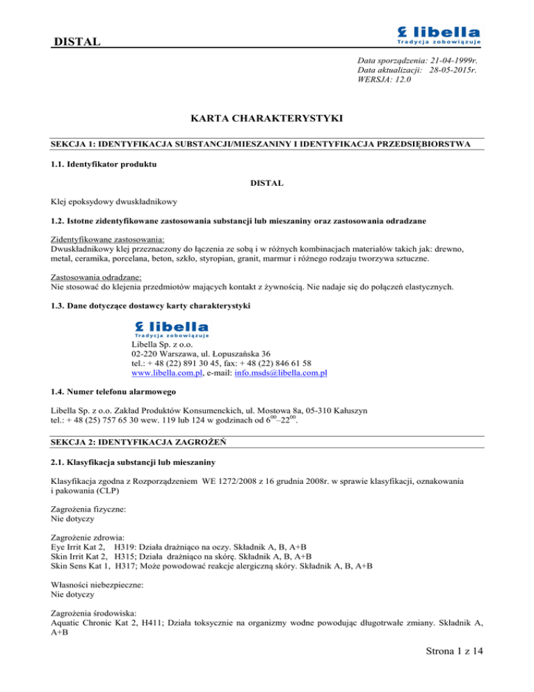 DISTAL ______ __________________________ __________________ Data sporządzenia: 21-04-1999r. Data aktualizacji: 28-05-2015r. WERSJA: 12.0 KARTA CHARAKTERYSTYKI SEKCJA 1: IDENTYFIKACJA SUBSTANCJI/MIESZANINY I IDENTYFIKACJA PRZEDSIĘBIORSTWA 1.1. Identyfikator produktu DISTAL Klej epoksydowy dwuskładnikowy 1.2. Istotne zidentyfikowane zastosowania substancji lub mieszaniny oraz zastosowania odradzane Zidentyfikowane zastosowania: Dwuskładnikowy klej przeznaczony do łączenia ze sobą i w różnych kombinacjach materiałów takich jak: drewno, metal, ceramika, porcelana, beton, szkło, styropian, granit, marmur i różnego rodzaju tworzywa sztuczne. Zastosowania odradzane: Nie stosować do klejenia przedmiotów mających kontakt z żywnością. Nie nadaje się do połączeń elastycznych. 1.3. Dane dotyczące dostawcy karty charakterystyki Libella Sp. z o.o. 02-220 Warszawa, ul. Łopuszańska 36 tel.: + 48 (22) 891 30 45, fax: + 48 (22) 846 61 58 www.libella.com.pl, e-mail: [email protected] 1.4. Numer telefonu alarmowego Libella Sp. z o.o. Zakład Produktów Konsumenckich, ul. Mostowa 8a, 05-310 Kałuszyn tel.: + 48 (25) 757 65 30 wew. 119 lub 124 w godzinach od 600–2200. SEKCJA 2: IDENTYFIKACJA ZAGROŻEŃ 2.1. Klasyfikacja substancji lub mieszaniny Klasyfikacja zgodna z Rozporządzeniem WE 1272/2008 z 16 grudnia 2008r. w sprawie klasyfikacji, oznakowania i pakowania (CLP) Zagrożenia fizyczne: Nie dotyczy Zagrożenie zdrowia: Eye Irrit Kat 2, H319: Działa drażniąco na oczy. Składnik A, B, A+B Skin Irrit Kat 2, H315; Działa drażniąco na skórę. Składnik A, B, A+B Skin Sens Kat 1, H317; Może powodować reakcje alergiczną skóry. Składnik A, B, A+B Własności niebezpieczne: Nie dotyczy Zagrożenia środowiska: Aquatic Chronic Kat 2, H411; Działa toksycznie na organizmy wodne powodując długotrwałe zmiany. Składnik A, A+B Strona 1 z 14 DISTAL ______ __________________________ __________________ 2.2. Elementy oznakowania Znak ostrzegawczy: Hasło ostrzegawcze: UWAGA Zwroty wskazujące rodzaj zagrożenia: H319 – Działa drażniąco na oczy. H315 – Działa drażniąco na skórę. H317 – Może powodować reakcję alergiczną skóry. H411 – Działa toksycznie na organizmy wodne powodując długotrwałe zmiany* *dotyczy składnika A Zwroty określające warunki bezpiecznego stosowania: P101 – W razie konieczności zasięgnięcia porady lekarza należy pokazać pojemnik lub etykietę. P102 – Chronić przed dziećmi. P103 – Przed użyciem przeczytać etykietę. EUH205 – Zawiera składniki epoksydowe. Może powodować wystąpienie reakcji alergicznej. P264 – Dokładnie umyć ręce po użyciu. P280 – Stosować rękawice ochronne/odzież ochronną/ochronę oczu/ochronę twarzy. P305 + P351 + P338 – W PRZYPADKU DOSTANIA SIĘ DO OCZU: Ostrożnie płukać wodą przez kilka minut. Wyjąć soczewki kontaktowe, jeżeli są i można je łatwo usunąć. Nadal płukać. P337 + P313 – W przypadku utrzymywania się działania drażniącego na oczy: Zasięgnąć porady/zgłosić się pod opiekę lekarza. P302 + P352 – W PRZYPADKU KONTAKTU ZE SKÓRĄ: umyć dużą ilością wody. P333 + P313 – W przypadku wystąpienia podrażnienia skóry lub wysypki: Zasięgnąć porady/zgłosić się pod opiekę lekarza. P273 – Unikać uwolnienia do środowiska. P501 – Zawartość /pojemnik usuwać do odpadów niebezpiecznych zgodnie z przepisami lokalnymi/regionalnymi/krajowymi/międzynarodowymi. Informacje dodatkowe: DISTAL zawiera między innymi: produkt reakcji bisfenolu A z epichlorohydryną, kwasy tłuszczowe, C18-nienasycone, dimery, oligomeryczne produkty reakcji z trietylenotetraminą. 2.3. Inne zagrożenia Brak informacji na temat spełnienia kryteriów PBT lub vPvB zgodnie z załącznikiem XIII rozporządzenia REACH. Odpowiednie badania nie były przeprowadzone. SEKCJA 3: SKŁAD/INFORMACJA O SKŁADNIKACH 3.1. Substancje Nie dotyczy. Strona 2 z 14 DISTAL ______ __________________________ __________________ 3.2. Mieszaniny Składnik A (Żywica z wypełniaczem): Nazwa składnika/ Numer indeksowy Produkt reakcji bisfenolu A z epichlorohydryną (śr. masa cząst.≤ 700) Zakres stężeń [%] > 85 Klasyfikacja (WE) 1272/2008 Eye Irrit 2, H319, Skin Irrit 2, H315, Skin Sens 1, H317, Aquatic Chronic 2, H411 Numer CAS Numer WE Numer rejestracji 25068-38-6 500-033-5 01-211945661926-XXXX Składnik B (Utwardzacz): Nazwa składnika/ Numer indeksowy Trietylenotetramina Zakres stężeń [%] < 15 Klasyfikacja (WE) 1272/2008 Skin Irrit. 2, H315, Eye Irrit. 2, H319, Skin Sens 1, H317, Aquatic Chronic 3, H412 Numer CAS Numer WE Numer rejestracji 112-24-3 203-950-6 31-05-2018r. Informacje dodatkowe: Pełny tekst zwrotów H: patrz sekcja 16 SEKCJA 4: ŚRODKI PIERWSZEJ POMOCY 4.1. Opis środków pierwszej pomocy Przez drogi oddechowe: W normalnych warunkach nie stanowi zagrożenia. Kontakt ze skórą: Zdjąć zanieczyszczoną odzież. Skórę natychmiast przemywać dużą ilością wody z mydłem. W razie potrzeby zapewnić konsultację dermatologiczną. Kontakt z oczami: Wyjąć szkła kontaktowe. Przemywać oczy dużą ilością bieżącej wody przez ok. 30 min, unikając silnego strumienia wody ze względu na możliwość mechanicznego uszkodzenia rogówki. Zwrócić się o pomoc lekarską. Spożycie: W praktyce świadome połknięcia kleju nie są znane. Dokładnie przepłukać jamę ustną wodą. Poszkodowanemu podać 1-2 szklanki wody/mleka do picia. Nie wywoływać wymiotów. Natychmiast zapewnić pomoc lekarską. W przypadku pojawienia się lub utrzymywania się dolegliwości powstałych wskutek narażenia na działanie DISTALU, należy zapewnić poszkodowanemu pomoc lekarską. Należy usunąć źródło narażenia i przenieść poszkodowanego z miejsca narażenia. Zdjąć zanieczyszczoną odzież. Preparat może powodować uczulenie w kontakcie ze skórą. Osoby narażone na zanieczyszczenie skóry powinny być pouczone o konieczności noszenia odpowiednich rękawic. ochronnych i