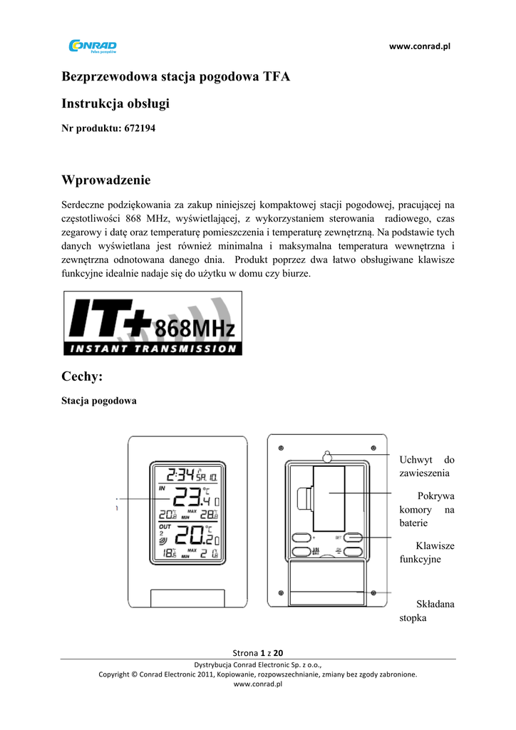 www.conrad.pl Bezprzewodowa stacja pogodowa TFA Instrukcja obsługi Nr produktu: 672194 Wprowadzenie Serdeczne podziękowania za zakup niniejszej kompaktowej stacji pogodowej, pracującej na częstotliwości 868 MHz, wyświetlającej, z wykorzystaniem sterowania radiowego, czas zegarowy i datę oraz temperaturę pomieszczenia i temperaturę zewnętrzną. Na podstawie tych danych wyświetlana jest również minimalna i maksymalna temperatura wewnętrzna i zewnętrzna odnotowana danego dnia. Produkt poprzez dwa łatwo obsługiwane klawisze funkcyjne idealnie nadaje się do użytku w domu czy biurze. Cechy: Stacja pogodowa Uchwyt do zawieszenia Pokrywa komory na baterie Klawisze funkcyjne Składana stopka Strona 1 z 20 Dystrybucja Conrad Electronic Sp. z o.o., Copyright © Conrad Electronic 2011, Kopiowanie, rozpowszechnianie, zmiany bez zgody zabronione. www.conrad.pl www.conrad.pl o Funkcja czasu atomowego (sterowane radiowo wskazanie czasu DCF-77) lub ręczne opcje ustawienia czasu; o Wł./Wył. Odbiór czasu radiowego; o Wyświetlanie godzin i minut; o Wyświetlanie kalendarza; o Opcje strefy czasowej +/- 12 godzin; o Bezprzewodowa transmisja sygnału na częstotliwości 868 MHz; o Pomiar temperatury zewnętrznej w interwałach czasowych co 4 sekundy; o Wyświetlanie temperatury w stopniach Celsjusza (°C) lub Fahrenheita (°F) (wybierane); o Wyświetlanie wewnętrznej i zewnętrznej temperatury wraz z zapamiętaniem wartości minimalnej i maksymalnej (zapamiętane wartości można wyzerować); o Odbiór maksymalnie 3 nadajników zewnętrznych; o Wyświetlanie minimalnej i maksymalnej temperatury pomieszczenia odnotowanej danego dnia; o Wyświetlanie minimalnej i maksymalnej temperatury zewnętrznej odnotowanej danego dnia; o Ustawienie kontrastu wyświetlacza LCD; o Możliwość ustawienia na stole jak i montażu ściennego; Dwukanałowy nadajnik temperatury zewnętrznej o Transmisja radiowa temperatury zewnętrznej do stacji pogodowej z wykorzystaniem sygnału o częstotliwości 868 MHz; o Nadajnik dwukanałowy: wewnętrzny kanał Strona 2 z 20 Dystrybucja Conrad Electronic Sp. z o.o., Copyright © Conrad Electronic 2011, Kopiowanie, rozpowszechnianie, zmiany bez zgody zabronione. www.conrad.pl www.conrad.pl pomiarowy i kanał sondy; o Obudowa chroniona przed bryzgami wody; o Uchwyt do montażu na ścianie. Dwukanałowy nadajnik – nadajnik zewnętrzny dysponuje wewnętrznym kanałem czujnika i zewnętrznym kanałem sondy. Dane zmierzone za pomocą wewnętrznego czujnika czy też sondy prezentowane są na wyświetlaczu nadajnika zewnętrznego odpowiednio jako „Kanał 1” bądź „Kanał 2”. Obydwie zmierzone wartości przekazywane są na zmianę do wyświetlacza. Jeżeli zostanie wyciągnięta wtyczka sondy, to na wyświetlaczu nadajnika pojawi się wartość zmierzona przez wewnętrzny czujnik. Po rozpoznaniu czujnika zewnętrznego przez stację pogodową na kanał 1 stacji transmitowane są dane temperaturowe zmierzone przez czujnik wewnętrzny, a na kanał nr 2 dane uzyskane z sondy. PO wyciągnięci wtyczki sondy zostanie wyświetlony napis „—„, podczas gdy na kanale nr 1 w dalszym ciągu prezentowane będą dane pomiarowe czujnika wewnętrznego. Po dokonaniu ustawień podstawowych sondę można w każdym czasie podłączyć z nadajnikiem temperatury zewnętrznej. W przypadku gdy sonda zostanie ponownie odłączona lub podłączona, nie jest wymagane ponowne ustawianie składników urządzenia. Stacja pogodowa automatycznie rozpozna dane pomiarowe pochodzące od sondy temperaturowej i po jej podłączeniu przetransmituje je na kanał nr 2 wyświetlacza. Ustawienia podstawowe: Przy wykorzystywaniu jednego czujnika zewnętrznego: 1. Najpierw zamontować baterie w czujniku zewnętrznym (Patrz poniżej „Montaż i wymiana baterii w czujniku temperatury zewnętrznej”) 2. Po 30 sekundach od uruchomienia czujnika temperatury zewnętrznej zamontować baterie w stacji pogodowej (Patrz poniżej „Montaż i wymiana baterii w stacji pogodowej”). Po włożeniu baterii wszystkie segmenty wyświetlacza LCD na krótki okres czasu zaświecą się. Następnie jako temperatura pomieszczenia i czas wyświetli się 00:00. Jeżeli w przeciągu 60 sekund wskazania te nie pojawią się na wyświetlaczu LCD, należy na minimum 60 sekund usunąć baterie, po czym je ponownie włożyć. Jeżeli dane te pojawią się, należy przystąpić do następnego kroku. 3. Po włożeniu baterii stacja pogodowa rozpocznie odbierać dane od nadajnika zewnętrznego. Strona 3 z 20 Dystrybucja Conrad Electronic Sp. z o.o., Copyright © Conrad Electronic 2011, Kopiowanie, rozpowszechnianie, zmiany bez zgody zabronione. www.conrad.pl www.conrad.pl 4. Jeżeli opcjonalna sonda pomiarowa połączona jest w dwukanałowym nadajnikiem zewnętrznym, temperatury zewnętrzne powinny zostać wyświetlane na kanale 1 i 2 stacji pogodowej. Następnie pojawi się symbol odbioru sygnału. Jeżeli w przeciągu dwóch minut tak się nie stanie, należy usunąć baterie w obydwu jednostek i jeszcze raz rozpocząć cały proces począwszy od punktu 1. Wskazówka Kanał 1 wskazuje na pomiar z użyciem wewnętrznego czujnika dwukanałowego nadajnika zewnętrznego, kanał 2 z użyciem zewnętrznej sondy. Jeżeli sonda nie jest połączona z nadajnikiem, to kanał 2 wskazuje tylko „—„. 5. W celu zapewnienia wystarczającej transmisji sygnału o częstotliwości 868 MHz, odległość pomiędzy miejscem montażu stacji pogodowej a czujnikiem zewnętrznych w dobrych warunkach nie powinna przekraczać 100 metrów (Patrz wskazówki w rozdziałach „Lokalizacja” i „Odbiór 868 MHz”). 6. Jeżeli dane z czujnika zewnętrznego zostały prawidłowo odebrane i wyświetlone na stacji pogodowej, automatycznie rozpoczyna się odbiór sygnału DCF. Przy dobrych warunkach odbioru trwa to mniej więcej od 3 do 5 minut. Jeżeli w przeciągu 10 minut nie nastąpi odbiór czasu DCF, należy za pomocą klawisza „SET” ustawić czas 