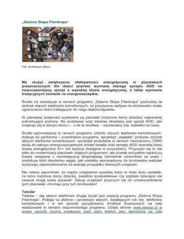 „Zielona Stopa Filantropa” Fot. Archiwum Abrys Ma służyć zwiększaniu efektywności energetycznej w placówkach przeznaczonych dla dzieci poprzez wymianę starego sprzętu AGD na nowocześniejszy sprzęt o wysokiej klasie energetycznej, a także wymianie tradycyjnych żarówek na energooszczędne. Środki na inwestycje w ramach programu „Zielona Stopa Filantropa” pochodzą ze zbiórek starych telefonów komórkowych, co pozytywnie wpływa na środowisko dzięki ograniczeniu ilości trafiających do niego elektroodpadów. W pierwszej kolejności wybierane są placówki (rodzinne domy dziecka) najbardziej potrzebujące pomocy. Na podstawie wizji lokalnej określany jest sprzęt AGD, jaki znajduje się w danym domu i – o ile to możliwe – wymieniany (np. lodówki) na nowy. Środki zgromadzone w ramach programu (zbiórki starych telefonów komórkowych, dotacje od partnerów i uczestników programu, sprzedaż „cegiełek” podczas zbiórek starych telefonów komórkowych, sprzedaż produktów w ramach mechanizmu CRM) służą do zakupu energooszczędnych źródeł światła oraz sprzętu AGD wysokiej klasy (klasa energetyczna A++ lub wyższa dostępna w przyszłości). Przyczyni się to nie tylko do modernizacji placówek objętych programem, ale przede wszystkim ograniczy koszty związane z comiesięczną eksploatacją (obniżenie rachunków za prąd) i zredukuje ilość dwutlenku węgla, jaki zostałby wprowadzony do środowiska wskutek wyższego zapotrzebowania na energię przypadku starszych urządzeń. Nie należy zapominać, że często urządzenia wysokiej klasy to dość duży wydatek, na który rodzinne domy dziecka, świetlice środowiskowe czy szpitale dziecięce nie zawsze mogą sobie pozwolić. Zakup urządzeń przyczyni się do unowocześnienia tych placówek, chroniąc przy tym środowisko! Teledar Teledar – daj starym telefonom drugie życie! jest częścią programu „Zielona Stopa Filantropa”. Polega na zbiórce i sprzedaży starych, działających lub nie, telefonów komórkowych i w ten sposób pozyskiwaniu środków finansowych na cele realizowane w ramach wspomnianego programu. Dzięki stronie www.teledar.pl w prosty sposób można przekazać swój stary telefon jako darowiznę na cele realizowane przez Fundację Nasza Ziemia w ramach programu wsparcia dla rodzinnych domów dziecka. Rejestracja na stronie zajmuje tylko kilkadziesiąt sekund, a korzystanie z niej jest bardzo proste. Po podaniu swoich danych i ilości telefonów do przekazania na podany adres zostanie przesłana opłacona już koperta zwrotna, a w przypadku większej ilości aparatów zaoferowane będą usługi firmy kurierskiej. Skąd wziął się pomysł na zbiórkę telefonów komórkowych? Według danych GUS, w Polsce aktywnych jest ponad 46 mln telefonów komórkowych, z czego wynika, że na 1 mieszkańca przypada ok. 1,2 telefonu. Nie sposób jednak określić, ile aparatów zalega w szufladach „na wszelki wypadek”, z których statystyczny obywatel najczęściej nigdy nie skorzysta. Nie wszyscy zdają sobie także sprawę z tego, że telefon komórkowy, po okresie użytkowania staje się odpadem niebezpiecznym. Jednym z efektów projektu jest ograniczenie liczby wyrzucanych telefonów komórkowych oraz, jeśli to możliwe, powtórne wprowadzenie ich do obiegu, co przyczyni się do poprawy stanu środowiska naturalnego i zmniejszenia ilości generowanych odpadów. Ponadto umożliwia to zredukowanie wykorzystania nieodnawialnych zasobów naturalnych Ziemi podczas produkcji nowych aparatów – wiele bardzo cennych i rzadkich pierwiastków można pozyskać z wyeksploatowanych aparatów. Kluczowym aspektem recyklingu jest przecież ponowne wykorzystanie! W przypadku, gdy „komórka” nie jest zdatna do ponownego użytku, zostaje poddany recyklingowi w zgodny z prawem i przyjazny środowisku sposób. Telefony komórkowe zawierają dużo niebezpiecznych związków (np. metale ciężkie, takie jak kadm i ołów), które po przedostaniu się do środowiska wpływają negatywnie na jego stan oraz zdrowie zwierząt, roślin i ludzi. Jest też druga strona medalu, bo aparaty zawierają także cenne surowce, które można odzyskać i wykorzystać powtórnie do produkcji nowych urządzeń (np. metale szlachetne – złoto, srebro). Dlaczego zatem warto oddać stary telefon do recyklingu? Bo w ten sposób chronimy środowisko i polepszamy warunki życia dzieci w Polsce! Andrzej Białaś, Fundacja Nasza Ziemia Artykuł pochodzi z miesięcznika „Recykling”, Numer 6/2011 (126)
