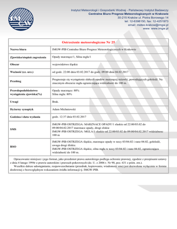 Instytut Meteorologii i Gospodarki Wodnej - Państwowy Instytut Badawczy Centralne Biuro Prognoz Meteorologicznych w Krakowie 30-215 Kraków ul. Piotra Borowego 14 tel: 12-6398150, fax: 12-4251973 email: [email protected] www: www.imgw.pl Ostrzeżenie meteorologiczne Nr 25 Nazwa biura IMGW-PIB Centralne Biuro Prognoz Meteorologicznych w Krakowie Zjawisko/stopień zagrożenia Opady marznące/1, Silna mgła/1 Obszar województwo śląskie Ważność (cz. urz.) od godz. 22:00 dnia 03.02.2017 do godz. 09:00 dnia 04.02.2017 Przebieg Prognozuje się wystąpienie słabych opadów marznącej mżawki, powodujących gołoledź. Na znacznym obszarze mgła ograniczająca widzialność do 100 m. Prawdopodobieństwo wystąpienia zjawiska(%) Opady marznące: 80% Silna mgła: 80% Uwagi Brak. Dyżurny synoptyk Adam Michniewski Godzina i data wydania godz. 12:37 dnia 03.02.2017 SMS IMGW-PIB OSTRZEGA: MARZNACE OPADY/1 slaskie od 22:00/03.02 do 09:00/04.02.2017 marznace opady, drogi sliskie IMGW-PIB OSTRZEGA: MGLA/1 slaskie od 22:00/03.02 do 09:00/04.02.2017 widzialnosc 100 m RSO IMGW-PIB OSTRZEGA śląskie, marznące opady w nocy 03/04.02 i rano 04.02, gołoledź, uwaga drogi śliskie. IMGW-PIB OSTRZEGA śląskie, silna mgła w nocy 03/04.02 i rano 04.02, ograniczająca widzialność do 100 m. Opracowanie niniejsze i jego format, jako przedmiot prawa autorskiego podlega ochronie prawnej, zgodnie z przepisami ustawy z dnia 4 lutego 1994r o prawie autorskim i prawach pokrewnych (dz. U. z 2006 r. Nr 90, poz. 631 z późn. zm.). Wszelkie dalsze udostępnianie, rozpowszechnianie (przedruk, kopiowanie, wiadomość sms) jest dozwolone wyłącznie w formie dosłownej z bezwzględnym wskazaniem źródła informacji tj. IMGW-PIB.