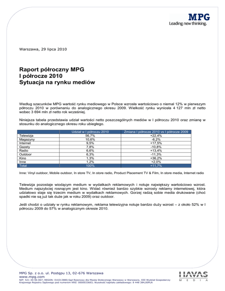 Warszawa, 29 lipca 2010 Raport półroczny MPG I półrocze 2010 Sytuacja na rynku mediów Według szacunków MPG wartość rynku mediowego w Polsce wzrosła wartościowo o niemal 12% w pierwszym półroczu 2010 w porównaniu do analogicznego okresu 2009. Wielkość rynku wyniosła 4 127 mln zł netto wobec 3 694 mln zł netto rok wcześniej. Niniejsza tabela przedstawia udział wartości netto poszczególnych mediów w I półroczu 2010 oraz zmianę w stosunku do analogicznego okresu roku ubiegłego. Telewizja Magazyny Internet Gazety Radio Outdoor Kino Inne Total Udział w I półroczu 2010 56,7% 10,6% 9,5% 7,8% 6,6% 6,3% 1,3% 1,2% 100% Zmiana I półrocze 2010 vs I półrocze 2009 +22,4% -6,2% +17,5% -10,8% +13,4% -11,3% +36,2% +2,0% +11,7% Inne: Vinyl outdoor, Mobile outdoor, In store TV, In store radio, Product Placement TV & Film, In store media, Internet radio Telewizja pozostaje wiodącym medium w wydatkach reklamowych i notuje największy wartościowo wzrost. Medium najszybciej rosnącym jest kino. Widać również bardzo szybkie wzrosty reklamy internetowej, która udziałowo staje się trzecim medium w wydatkach reklamowych. Gorzej radzą sobie media drukowane (choć spadki nie są już tak duże jak w roku 2009) oraz outdoor. Jeśli chodzi o udziały w rynku reklamowym, reklama telewizyjna notuje bardzo duży wzrost – z około 52% w I półroczu 2009 do 57% w analogicznym okresie 2010. MPG Sp. z o.o. ul. Postępu 13, 02-676 Warszawa www.mpg.com NIP: 521-30-96-067; REGON: 016313880;Sąd Rejonowy dla Miasta Stołecznego Warszawy w Warszawie, XIII Wydział Gospodarczy Krajowego Rejestru Sądowego pod numerem KRS: 0000033683; Wysokość kapitału zakładowego: 8 448 384,00PLN Sytuacja w poszczególnych sektorach rynku Dwudziestu największych reklamodawców zwiększyło swoje wydatki reklamowe w pierwszej połowie 2010 w stosunku do pierwszej połowy 2009. MPG szacuje, że wzrost ten wyniósł około 18%. Niniejsza tabela przedstawia zmianę wydatków reklamowych netto w poszczególnych sektorach w okresie pierwszego półrocza 2010 w porównaniu z pierwszym półroczem 2009. Zmiana I półrocze 2010 vs I półrocze 2009 +43,4% +37,1% +35,8% +20,5% +19,4% +16,3% +13,7% +14,0% +7,0% +2,9% -0,9% -1,7% -2,3% -7,3% -13,5% +11,7% Sektor Produkty do użytku domowego Produkty farmaceutyczne i leki Żywność Sprzęty domowe, meble i dekoracje Komputery i audio video Motoryzacja Higiena i pielęgnacja Odzież i dodatki Napoje i alkohole Finanse Czas wolny Handel Podróże i turystyka, hotele i restauracje Telekomunikacja Media, książki CD i DVD Total Najszybciej wzrastały wydatki w sektorach FMCG oraz sektorze farmaceutycznym. Znamienny wydaje się również wzrost wydatków w motoryzacji co odzwierciedla pozytywne wyniki jeśli chodzi o wzrost liczby sprzedanych samochodów w Polsce zanotowany w ostatnich miesiącach. Niewiele sektorów opiera się trendowi wzrostowemu, jednak warty zauważenia wydaje się być spadek wydatków w tradycyjnie bardzo konkurencyjnym sektorze telekomunikacyjnym. Dane szczegółowe na temat poszczególnych mediów TV Bardzo duży wzrost sprzedaży liczby GRP (EqGRP) zanotowały w pierwszym półroczu 2010 kanały tematyczne, zarówno te skupione wokół stacji ogólnopolskich jak również stacje sprzedawane przez AtMedia oraz Discovery Media. O ile w 4 głównych stacjach liczba wyemitowanych EqGRP wzrosła o 2% (reklama i sponsoring) o tyle w stacjach tematycznych było to ponad 50% więcej niż rok wcześniej. EqGRP IH 2009 EqGRP IH 2010 Różnica AtMedia 33475,95 56934 +70% Discovery 9016,61 12837 +42% Polonia1 292,94 258 -12% grupa Polsat 136880,43 145053 +6% TV4 14416,97 14397 0% Grupa TVN 172761,25 174635 +1% Grupa TVP 217596,74 236877 +9% grupa mediowa MPG Sp. z o.o. ul. Postępu 13, 02-676 Warszawa www.mpg.com NIP: 521-30-96-067; REGON: 016313880;Sąd Rejonowy dla Miasta Stołecznego Warszawy w Warszawie, XIII Wydział Gospodarczy Krajowego Rejestru Sądowego pod numerem KRS: 0000033683; Wysokość kapitału zakładowego: 8 448 384,00PLN Wzrost liczby sprzedanych GRP generowany jest przede wszystkim przez małych i średnich reklamodawców (do 2000 EqGRP). Liczba „średnich” reklamodawców, których kampanie w ciągu półrocza mieściły się w granicach od 2000 do 5000 GRP pozostała praktycznie bez zmian. Zwiększył się nieco udział tych największych, realizujących powyżej 10 000 EqGRP (z 21 do 24). Liczba reklamodawców IH 2009 Liczba reklamodawców IH 2010 EqGRPs IH 2009 EqGRPs IH 2010 Różnica EqGRPs Różnica w liczbie reklamodawców 10000+ 21 24 4156 4917 761 18% 5000-10000 29 23 1931 1500 -430 -22% 2000-5000 78 78 2518 2537 19 1% 500-2000 199 225 2117 2440 323 15% 0-500 818 913 543 604 62 11% EqGRPs Wzrost liczby sprzedanych GRP przekłada się bezpośrednio na większe obłożenie stacji reklamami i wykorzystanie przestrzeni reklamowej w stacjach TV. We wszystkich głównych stacjach procent wykorzystanego, dostępnego ustawowo, czasu reklamowego zwiększył się w porównaniu do analogicznego okresu roku 2009. O ile TVP nie wykorzystuje w jeszcze w 100% swoich możliwości ze względu na ograniczenia prawne (brak możliwości przerywania programów blokami reklamowymi) o tyle Polsat i TVN zbliżają się do granicy 12 minut w ciągu godziny niemal w ciągu całego dnia. IH 2009 % wykorzystanego czasu rekl. timeband TVP1 TVP2 Polsat TVN IH 2010 % wykorzystanego czasu rekl. TVP1 TVP2 Polsat TVN 08:00:00 - 09:00:00 66% 70% 95% 97% 79% 76% 99% 98% 09:00:00 - 10:00:00 52% 64% 91% 98% 68% 82% 99% 98% 10:00:00 - 11:00:00 41% 74% 94% 97% 57% 78% 99% 98% 11:00:00 - 12:00:00 47% 40% 95% 94% 66% 63% 99% 94% 12:00:00 - 13:00:00 53% 41% 93% 93% 62% 58% 98% 76% 13:00:00 - 14:00:00 63% 59% 95% 81% 70% 67% 99% 85% 14:00:00 - 15:00:00 54% 64% 92% 95% 68% 78% 97% 96% 15:00:00 - 16:00:00 57% 57% 91% 95% 71% 64% 97% 95% 16:00:00 - 17:00:00 82% 58% 94% 96% 85% 56% 99% 95% 17:00:00 - 18:00:00 80% 64% 98% 95% 84% 54% 99% 94% 18:00:00 - 19:00:00 