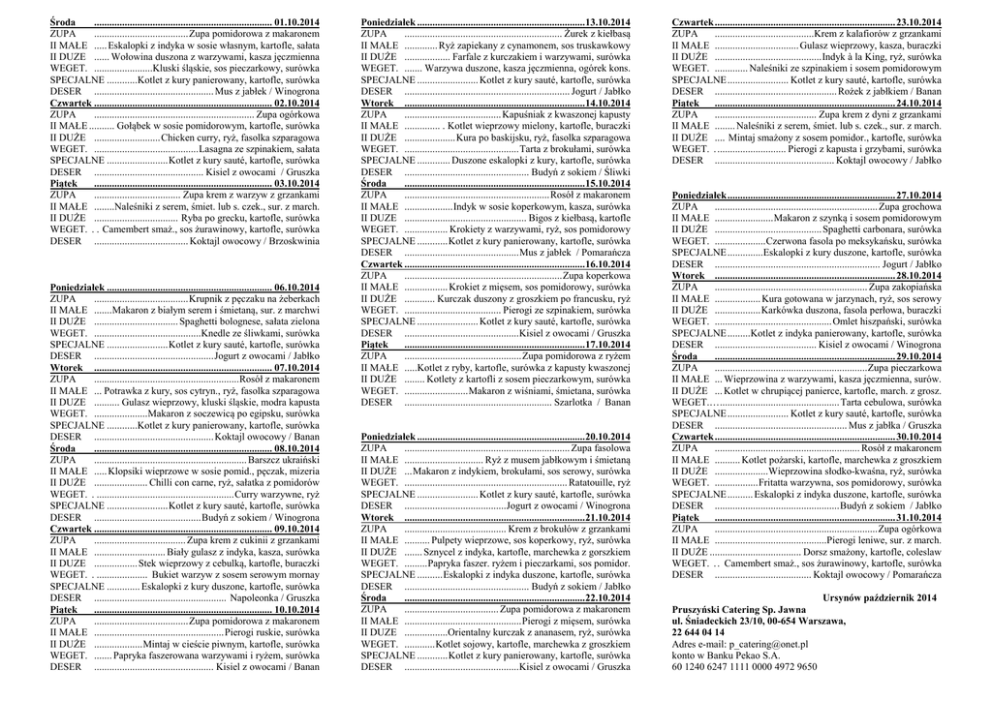 Środa ...................................................................... 01.10.2014 ZUPA ..................................... Zupa pomidorowa z makaronem II MAŁE ..... Eskalopki z indyka w sosie własnym, kartofle, sałata II DUZE ...... Wołowina duszona z warzywami, kasza jęczmienna WEGET. .......................Kluski śląskie, sos pieczarkowy, surówka SPECJALNE ............Kotlet z kury panierowany, kartofle, surówka DESER ............................................... Mus z jabłek / Winogrona Czwartek ...................................................................... 02.10.2014 ZUPA ............................................................... Zupa ogórkowa II MAŁE .......... Gołąbek w sosie pomidorowym, kartofle, surówka II DUŻE .......................... Chicken curry, ryż, fasolka szparagowa WEGET. ......................................... Lasagna ze szpinakiem, sałata SPECJALNE ........................ Kotlet z kury sauté, kartofle, surówka DESER ........................................... Kisiel z owocami / Gruszka Piątek ...................................................................... 03.10.2014 ZUPA .................................. Zupa krem z warzyw z grzankami II MAŁE ........Naleśniki z serem, śmiet. lub s. czek., sur. z march. II DUŻE ................................. Ryba po grecku, kartofle, surówka WEGET. . . Camembert smaż., sos żurawinowy, kartofle, surówka DESER ..................................... Koktajl owocowy / Brzoskwinia Poniedziałek ................................................................. 06.10.2014 ZUPA ..................................... Krupnik z pęczaku na żeberkach II MAŁE ....... Makaron z białym serem i śmietaną, sur. z marchwi II DUŻE ................................. Spaghetti bolognese, sałata zielona WEGET. ..........................................Knedle ze śliwkami, surówka SPECJALNE ........................ Kotlet z kury sauté, kartofle, surówka DESER ............................................... Jogurt z owocami / Jabłko Wtorek ...................................................................... 07.10.2014 ZUPA ......................................................... Rosół z makaronem II MAŁE ... Potrawka z kury, sos cytryn., ryż, fasolka szparagowa II DUZE .......... Gulasz wieprzowy, kluski śląskie, modra kapusta WEGET. ..................... Makaron z soczewicą po egipsku, surówka SPECJALNE ............Kotlet z kury panierowany, kartofle, surówka DESER ............................................... Koktajl owocowy / Banan Środa ...................................................................... 08.10.2014 ZUPA ............................................................ Barszcz ukraiński II MAŁE ..... Klopsiki wieprzowe w sosie pomid., pęczak, mizeria II DUŻE ..................... Chilli con carne, ryż, sałatka z pomidorów WEGET. . ...................................................... Curry warzywne, ryż SPECJALNE ........................ Kotlet z kury sauté, kartofle, surówka DESER .......................................... Budyń z sokiem / Winogrona Czwartek ...................................................................... 09.10.2014 ZUPA .................................... Zupa krem z cukinii z grzankami II MAŁE ............................ Biały gulasz z indyka, kasza, surówka II DUZE ................. Stek wieprzowy z cebulką, kartofle, buraczki WEGET. . .................... Bukiet warzyw z sosem serowym mornay SPECJALNE ............. Eskalopki z kury duszone, kartofle, surówka DESER .................................................... Napoleonka / Gruszka Piątek ...................................................................... 10.10.2014 ZUPA ..................................... Zupa pomidorowa z makaronem II MAŁE ................................................... Pierogi ruskie, surówka II DUŻE ................... Mintaj w cieście piwnym, kartofle, surówka WEGET. ....... Papryka faszerowana warzywami i ryżem, surówka DESER ............................................... Kisiel z owocami / Banan Poniedziałek .................................................................. 13.10.2014 ZUPA .............................................................. Żurek z kiełbasą II MAŁE ............. Ryż zapiekany z cynamonem, sos truskawkowy II DUŻE .................. Farfale z kurczakiem i warzywami, surówka WEGET. ....... Warzywa duszone, kasza jęczmienna, ogórek kons. SPECJALNE ........................ Kotlet z kury sauté, kartofle, surówka DESER ................................................................. Jogurt / Jabłko Wtorek ....................................................................... 14.10.2014 ZUPA ...................................... Kapuśniak z kwaszonej kapusty II MAŁE .............. . Kotlet wieprzowy mielony, kartofle, buraczki II DUŻE .................... Kura po baskijsku, ryż, fasolka szparagowa WEGET. ............................................. Tarta z brokułami, surówka SPECJALNE ............. Duszone eskalopki z kury, kartofle, surówka DESER ................................................. Budyń z sokiem / Śliwki Środa ....................................................................... 15.10.2014 ZUPA ......................................................... Rosół z makaronem II MAŁE ................... Indyk w sosie koperkowym, kasza, surówka II DUZE ................................................ Bigos z kiełbasą, kartofle WEGET. ................. Krokiety z warzywami, ryż, sos pomidorowy SPECJALNE ............ Kotlet z kury panierowany, kartofle, surówka DESER ............................................. Mus z jabłek / Pomarańcza Czwartek ....................................................................... 16.10.2014 ZUPA .............................................................. Zupa koperkowa II MAŁE ................. Krokiet z
