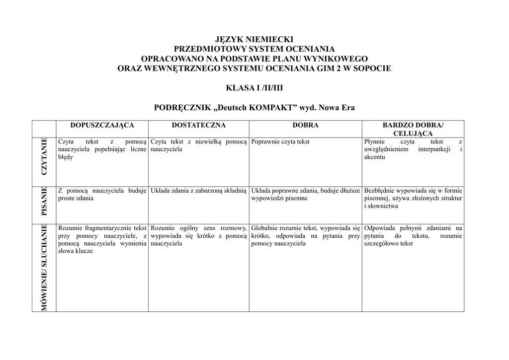 JĘZYK NIEMIECKI PRZEDMIOTOWY SYSTEM OCENIANIA OPRACOWANO NA PODSTAWIE PLANU WYNIKOWEGO ORAZ WEWNĘTRZNEGO SYSTEMU OCENIANIA GIM 2 W SOPOCIE KLASA I /II/III PODRĘCZNIK „Deutsch KOMPAKT” wyd. Nowa Era BARDZO DOBRA/ CELUJĄCA CZYTANIE DOBRA Czyta tekst z pomocą Czyta tekst z niewielką pomocą Poprawnie czyta tekst nauczyciela popełniając liczne nauczyciela błędy PISANIE DOSTATECZNA Z pomocą nauczyciela buduje Układa zdania z zaburzoną składnią Układa poprawne zdania, buduje dłuższe Bezbłędnie wypowiada się w formie proste zdania wypowiedzi pisemne pisemnej, używa złożonych struktur i słownictwa MÓWIENIE/ SŁUCHANIE DOPUSZCZAJĄCA Rozumie fragmentarycznie tekst Rozumie ogólny sens rozmowy, Globalnie rozumie tekst, wypowiada się Odpowiada pełnymi zdaniami na przy pomocy nauczyciele, z wypowiada się krótko z pomocą krótko, odpowiada na pytania przy pytania do tekstu, rozumie pomocą nauczyciela wymienia nauczyciela pomocy nauczyciela szczegółowo tekst słowa klucze Płynnie czyta tekst uwzględnieniem interpunkcji akcentu z i GRAMATYKA Poprawnie używa zaimki w zdaniach (Unser Vater ist toll.) Bezbłędnie stosuje zaimki w zdaniach. (Ihre Tochter lernt viel.) Zna schemat końcówek odmiany Odmienia czaswoniki regularne czasowników regularnych (ich – przez osoby (ich wohne, du e, du –st, er, sie, es –t, wir –en, wohnst...) ihr –t, sie -en) Stosuje w zdaniach prawidłową formę czasownika (Ich komme aus Polen.) Bezbłędnie używa odmienionych form czasownika. Wskazuje zaimki pytające w zdaniach (wer, wo, was, woher, wie) Dopasowuje zaimki pytające do zdań (Wo wohnt er?) Z niewielką pomocą nauczyciela układa pytania i potrafi na nie odpowiedzieć (Wie alt ist sie? Sie ist 15.) Bezbłędnie układa pytania i potrafi na nie odpowiedzieć (er, woher, kommen,? – Woher kommt er?) Rozumie i za pomocą nauczyciela krótko odpowiada na pytania utworzone przez inwersję (Heißt du Peter? Ja/ Nein.) Przy pomocy nauczyciela układa Układa pytania z niewielkimi błędami pytania i odpowiada na nie całym i odpowiada na nie. zdaniem (Wohnst du in Wschowa? – Ja, ich wohne in Wschowa/ Nein, ich wohne nicht in Wschowa.) Zna i wymienia zaimki osobowe i dzierżawcze w l. poj. i l. mn.(ich, du, er, sie, es..., mein, meine) Stosuje zaimki osobowe i dzierżawcze w zdaniu z niewielkimi błędami (Ich bin Monika. Meine Mutter heißt Halina.) Wskazuje w zdaniach przeczenie Zna miejsce przeczenia w zdaniu i (nicht, nein) i zna ich znaczenie przy pomocy nauczyciele układa (Ich bin nicht Monika) zdania przeczące (Schwimmst du? Nein, ich schwimme nicht.) Samodzielnie zaprzecza w języku niemieckim z niewielką ilością błędów. Samodzielnie układa pytania (Bist du 16. Nein, ich bin 14.) Bezbłędnie buduje zdania przeczące. Zna rodzajniki określone i potrafi wskazać je przy rzeczownikach (der, die, das, die) Stosuje rzeczowniki z prawidłowym Bezbłędnie uzywa rodzajiniki w rodzajnikiem (der Vater, die Mutter) zdaniach (Der Bruder spielt Lego). Bezbłędnie stosuje rodzajniki i zamienie je na zaimki osobowe (Der Opa mag Eis. Er mag Eis) Zna i wymienia liczebniki od 1 do 20 Poprawnie zapisuje liczebniki od 1 do 20 Buduje zdania wykorzystując podane rzeczowniki (Seid ihr 15 fünfzehn?) Bezbłędnie tworzy zdania z liczebnikami (Ich habe zwei Schwestern) Wymienia przymiotniki potrzebne do opisu osób (przymiotnik w funkcji Stosuje przymiotniki w zdaniach (Sie ist lustig) Buduje dłuższe wypowiedzi prz pomocy przymiotników (Mein Vater ist groß und lieb) Samodzielnie i bezbłędnie tworzy zdania z użyciem przymiotników (Meine Mutti ist nicht verrückt) SŁOWNICTWO orzecznika) – klein, groß, alt Uczeń zna, rozumie i używa słownictwo: Uczeń zna, rozumie i używa słownictwo: Uczeń zna, rozumie i używa słownictwo: Uczeń zna, rozumie i używa słownictwo /przykłady/: 1. Guten Morgen, Auf Wiedersehen (powitania, pożegnania) 1. to samo 1. to samo 1. to samo 2. Ich heiße, ich mag, ich spiele 2. Ich wohne in..., ich komme aus... 2. Mein Name ist..., ich bin 14 Jahre alt 2. Ich komme nicht aus der Schweiz, ich komme aus England 3. die Mutter, der Vater, das Kind, elegant, aktiv 3. die Eltern, die Großeltern, die Geschwister, klein, groß 3. die Omas, die Opas, die Enkelkinder, dick, ruhig 3. die Söhne, die Töchter, kahl, verrückt 4. tanzen, lernen, Lieber/ Liebe... 4. ins Kino gehen, Fußball spielen, ich suche... ZAKRES TEMATYCZNY: 1. Powitania, pożegnania 2. Przedstawianie się 3. Rodzina, przyjaciele 4. Hobby, zainteresowania 4. Musik hören, Gitarre spielen, das Gymnasium besuchen, mir ein Foto schicken 4. Bücher lesen, Ski laufen, Briefe schreiben, mir bald schreiben 5. Test po każdym dziale z podręcznika,skłaający się z 3 części pisze na 100% CZYTANIE DOBRA Czyta z niewielką pomocą Poprawnie czyta tekst z minimalną Płynnie czyta tekst nauczyciela, popełnia drobne ilością błędów błędy PISANIE DOSTATECZNA Układa proste zdania zaburzoną składnią MÓWIENIE/ SŁUCHANIE DOPUSZCZAJĄCA Rozumie fragmentarycznie tekst, Rozumie ogólny sens wymienia słowa klucze wypowiada się zwięźle BARDZO DOBRA/CELUJĄCA Płynnie czyta tekst z uwzględnieniem interpunkcji, akcentu i melodii z Układa poprawne zdania, buduje Wypowiada się w formie pisemnej i Bezbłędnie wypowiada się w formie dłuższe wypowiedzi pisemne przy używa złożonych struktur i słownictwa pisemnej i używa złożonych struktur i pomocy nauczyciela z nielicznymi błędami słownictwa z nielicznymi błędami rozmowy, Globalnie rozumie tekst, wypowiada Potrafi przy pomocy się pełnymi zdaniami zinterpretować tekst nauczyciela GRAMATYKA Zna schemat odmiany czasowników nieregularnych i rozdzielnie złożonych (essen, fahren, laufen, lesen, aufstehen) Odmienia czasowniki rozdzielnie złożone i nieregularne przez osoby (ich esse, stehe ... auf du isst, stehst... auf er, sie, es isst, steht... auf wir essen, stehen... auf ihr esst, steht... auf sie essen, st