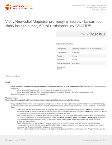 SK-FARM II Sp. z o.o. - Apteka Internetowa ul. Kleeberga 34, Białystok +48 42 279 40 05 Vichy Neovadiol Magistral promocyjny zestaw - balsam do skóry bardzo suchej 50 ml + miniprodukty GRATIS!!! Cena: 105,90 PLN Opis słownikowy Dostępność Dostępny w aptece w 24h, Niedostępny Opakowanie 1 zestaw Postać Kremy Producent VICHY Rodzaj rejestracji Kosmetyk Substancja czynna - Opis produktu Wstęp Vichy Neovadiol Magistral odżywczy balsam do skóry bardzo suchej 50 ml + miniprodukty GRATIS !!! W skład miniproduktów wchodzą: Vichy Neovadiol Magistral odżywczy balsam do skóry bardzo suchej 15 ml Vichy Neovadiol Magistral Elixir koncentrat odżywczych olejków do skóry dojrzałej, bardzo suchej 3 ml Zestaw dostępny jest do wyczerpania zapasów !!! Charakterystyka Vichy Neovadiol Magistral - odżywczy balsam przywracający gęstość skóry do skóry bardzo suchej Odżywczy balsam dla kobiet po menopauzie, które pragną zadbać o skórę uwrażliwioną spadkiem aktywności hormonalnej, by przeciwstawić się efektom zmian menopauzalnych: pogłębionej utraty gęstości oraz nasilonego uczucia suchości i zwiotczenia skóry. Odbudowa warstw skóry jest możliwa dzięki połączeniu unikalnych składników aktywnych: Proteic Gf, który pobudza syntezę czynników wzrostu (markerów specyficznych dla odbudowy tkankowej) oraz Pro-Xylane, ktory wzmacnia tkankę podporową i jednocześnie pełni funkcję rezerwuaru czynników wzrostu. Aby sprostać potrzebom skóry po menopauzie, Laboratoria Vichy połączyły Technologię Rekonstrukcji Tkanek z nową generacją odbudowujących olejków witalnych: olejek z otrębów ryżowych, olejek szafranowy i masło Karite. Ponieważ po menopauzie płaszcz lipidowy naskórka ulega degradacji, olejki bogate w kwasy Omega 3-6-9, "uczą" skórę jak wytwarzać własne lipidy. Dzięki właściwościom regenerującym, przeciwzapalnym oraz kojącym przywracają siły witalne uwrażliwionej po menopauzie skórze. Doskonała biokompatybilność między kwasami tłuszczowymi a skórą sprawia, że są one idealnie dostosowane do pielęgnacji skóry osłabionej po menopauzie. Formuła hipoalergiczna testowana pod kontrolą dermatologiczną na skórze wrażliwej. Zawiera Wodę Termalną z Vichy o Plik wygenerowano: 04-03-2017 Oprogramowanie sklepu: AptusShop SK-FARM II Sp. z o.o. - Apteka Internetowa ul. Kleeberga 34, Białystok +48 42 279 40 05 właściwościach kojących i regenerujących. Vichy Neovadiol Magistral Elixir Vichy Neovadiol Magistral ELIXIR koncentrat rekonstruujących olejków dla skóry dojrzałej, uwrażliwionej spadkiem aktywności hormonalnej po menopauzie, matowej, wysuszonej, o utraconej gęstości. Odżywczy balsam dla kobiet zawierający połączenie olejków witalnych, protetic GF i pro-xylane, aby odbudować skórę warstwa po warstwie już w 10 dni. Moc olejków witalnych dla rekonstrukcji skóry dojrzałej już od 1. aplikacji. Satynowe wykończenie. Nietłusty. Nie błyszczy się. Skuteczność Unikalny kompleks olejków bogatych w kwasy omega oraz Υ-oryzanol, aby wypełnić skórę lipidami, których poziom zmniejszył się po menopauzie. 3 możliwości zastosowania: jako odżywcze serum- kilka kropel nałóż bezpośrednio na oczyszczoną skórę twarzy, jako wygładzający balsam - dodaj kilka kropel do swojego codziennego kremu na dzień lub na noc, jako wypełniająca maseczka - nałóż około 10 kropel eliksiru na twarz i pozostaw na 10 minut. Efekty Więcej niż odżywienie, skóra jest jak odmieniona, młodzieńczo rozświetlona, wygładzona i elastyczna. Informacje dodatkowe W razie pytań lub wątpliwości służymy Państwu pomocą pod adresem [email protected]. Plik wygenerowano: 04-03-2017 Powered by TCPDF (www.tcpdf.org) Oprogramowanie sklepu: AptusShop