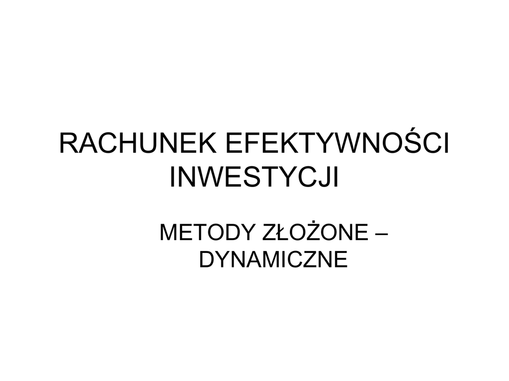 RACHUNEK EFEKTYWNOŚCI INWESTYCJI METODY ZŁOŻONE – DYNAMICZNE Projekt • • • • • Nakłady inwestycyjne, pożyczka + WACC Prognoza przychodów i kosztów Prognoza rachunku wyników Prognoza przepływów finansowych Wskaźniki metody statycznej – ROI, ROE, ARR, PP • Wskaźniki metody dynamicznej NPV, IRR, PI, DPP • Rekomendacje Pytania kontrolne • Czym charakteryzują się statyczne metody oceny efektywności inwestycji • Czym różni się księgowa stopa zwrotu od prostej stopu zwrotu z inwestycji • Na jakie pytanie odpowiada wskaźnik prostego okresu zwrotu • Co to jest wartość rezydualna środka trwałego. Metody dynamiczne – dyskontowe • Uwzględniają zmianę wartości pieniądza w czasie • Realizowane są na podstawie zasady kasowej • Odnoszą się do zdyskontowanych przepływów netto (NCF) • Najczęściej stosowane wskaźniki (NPV i IRR). Metody dynamiczne – dyskontowe A. Inwestycja 1 000 Korzyść (NCF) w roku n + 1 300 B. Korzyść razem 1 150 Korzyść (NCF) w roku n + 2 300 Korzyść (NCF) w roku n + 3 300 Likwidacja roku n + 4 250 • Czy suma przyszłych korzyści z inwestycji B przewyższy zainwestowany kapitał A ? (utracone korzyści) • Aby odpowiedzieć na to pytanie należy określić sumę wartości bieżących korzyści w czasie B i porównać czy jest większa od wartości inwestycji A • Wartość bieżąca Fv - wartość przyszła r - współczynnik dyskontujący n - rok PV FV (1 r ) n Metody dynamiczne – dyskontowe Współczynnik dyskonta - 9% Korzyść (NCF) w roku n + 1 278 Korzyść (NCF) w roku n + 2 257 A. Inwestycja 1 000 Korzyść (NCF) w roku n + 3 238 > Likwidacja roku n + 4 184 B. Suma korzyści 957 INWESTYCJA NIE JEST OPŁACALNA PONIEWAŻ SUMA WARTOŚCI BIEŻĄCYCH KORZYŚCI JEST MNIEJSZA OD WARTOŚCI ZAINWESTOWANYCH ŚRODKÓW Metody dynamiczne (NPV) NPV (net present value) – wartość bieżąca netto: NCF – netto cash flow (przyszła korzyść z poprzedniego slajdu) • r – czynnik dyskontujący • t – rok analizy NCFt NPV t 0 t (1 r ) n NPV pozwala na zbudowanie bezwzględnego kryterium decyzyjnego dla inwestora, w którym przyjmuje się że: •NPV > 0 – inwestycja jest opłacalna •NPV = 0 – inwestycja jest neutralna (do zaakceptowania) •NPV < 0 - inwestycja jest nieopłacalna Ze wzoru wynika, że wartość NPV zależy od: • wartości przyjętego współczynnika dyskonta r – im większy tym NPV będzie mniejsza • długość okresu analizy – im dłuższy okres tym wartość NPV większa •wartości NCF - im większa tym wartość NPV będzie większa PRAWIDŁOWE PRZYJĘCIE ZAŁOŻEŃ MA KLUCZOWE ZNACZENIE DLA WARTOŚĆI NPV Metody dynamiczne (NPV) c.d. Wyznaczenie czynnika dyskontującego r : • stopa zwrotu jaką można uzyskać na rynku kapitałowym w aktywa o ryzyku zbliżonym do ryzyka ocenianej inwestycji; • minimalna stopa zwrotu z inwestycji określana przez inwestora ( stopa procentowa wolnej od ryzyka inwestycji kapitałowej + inflacja + premia za ryzyko); • koszt kapitału jaki przedsiębiorca musi ponieść aby sfinansować inwestycję (WACC); Wyznaczenie ekonomicznego cyklu życia inwestycji t: metoda normatywna - długość ekonomicznego życia inwestycji jest uwarunkowana możliwością technicznej eksploatacji wytworzonego majątku. •metoda optymalizacji – w metodzie tej uwzględnia się korzyści wynikające z wcześniejszej niż wynikające z możliwości technicznych zakończenia realizacji inwestycji najczęściej wartość rezydualną. Wyznaczając długość okresu analizy posługujemy się wzorem: Sn NCF n S – księgowa wartość likwidacyjna NPV t 0 (1 r ) t (1 r )t Najwyższa wartość NPV określa optymalny okres zakończenia inwestycji Metody dynamiczne (NPV) c.d. Wyznaczenie NCF : • ekonomiczna – uwzględnia przepływy operacyjne (bez podatku dochodowego) i inwestycyjne bez przepływów finansowych. Metoda stosowane przez korporacje międzynarodowe, które porównują inwestycje w różnych krajach. • klasyczna – uwzględnia przepływy operacyjne i inwestycyjne z podatkiem dochodowym obliczanym od dochodu operacyjnego. • właścicielska – uwzględnia przepływy operacyjne i inwestycyjne oraz finansowe, ale jedynie wierzycielskie (bez przyrostu kapitału własnego i płatności dywidendy) • dywidendowa – korzyść szacowana jest na podstawie wypłaconych właścicielom dywidend tzw. strumienia dywidendowego. Najczęściej stosowana przez inwestorów liczących na korzyści w postaci wypłaty dwidend i wzrostu wartości udziałów. • skorygowana - uwzględnia przepływy operacyjne i inwestycyjne bez przepływów finansowych według uproszczonej formuły: zysk operacyjny opodatkowany + amortyzacja. Do wyliczenia NPV w projekcie stosujemy metodę klasyczną. Jako stopę dyskonta przyjmujemy średni ważony koszt kapitału (WACC). Metody dynamiczne (IRR) IRR Wewnętrzna Stopa Zwrotu (Internal Rate of Return) • IRR to wartość czynnika dyskontowego r, przy którym NPV = 0 • Wraz ze wzrostem IRR rośnie opłacalność projektu i zmniejsza się ryzyko jego niepowodzenia • IRR oblicza się metodą podstawień i kolejnych przybliżeń lub z wykorzystaniem programów komputerowych • IRR to maksymalny koszt kapitału inwestycyjnego, który pozwoli jeszcze sfinansować projekt bez straty. Metody dynamiczne (IRR) Wewnętrzna stopa zwrotu obliczana jest ze wzoru: NPVa (rb ra ) IRR ra NPVa NPVb gdzie: ra - stopa dyskontowa dla której NPV jest dodatnie bliskie zeru rb - stopa dyskontowa dla której NPV jest ujemne bliskie zeru. NPVa – wartość bieżąca netto dla ra NPVb – wartość bieżąca netto dla rb IRR jest niepoliczalne jeżeli w jakimkolwiek okresie poza okresem 0, wystąpi ujemny przepływ lub kiedy wszystkie przepływy są dodatnie. Metody dynamiczne (PI) PI (profitable index) – wskaźnik rentowności: NCF”+” – dodatni netto cash flow (przepływy gotówkowe netto ) NCF”-” – ujemny netto cash flow (przep