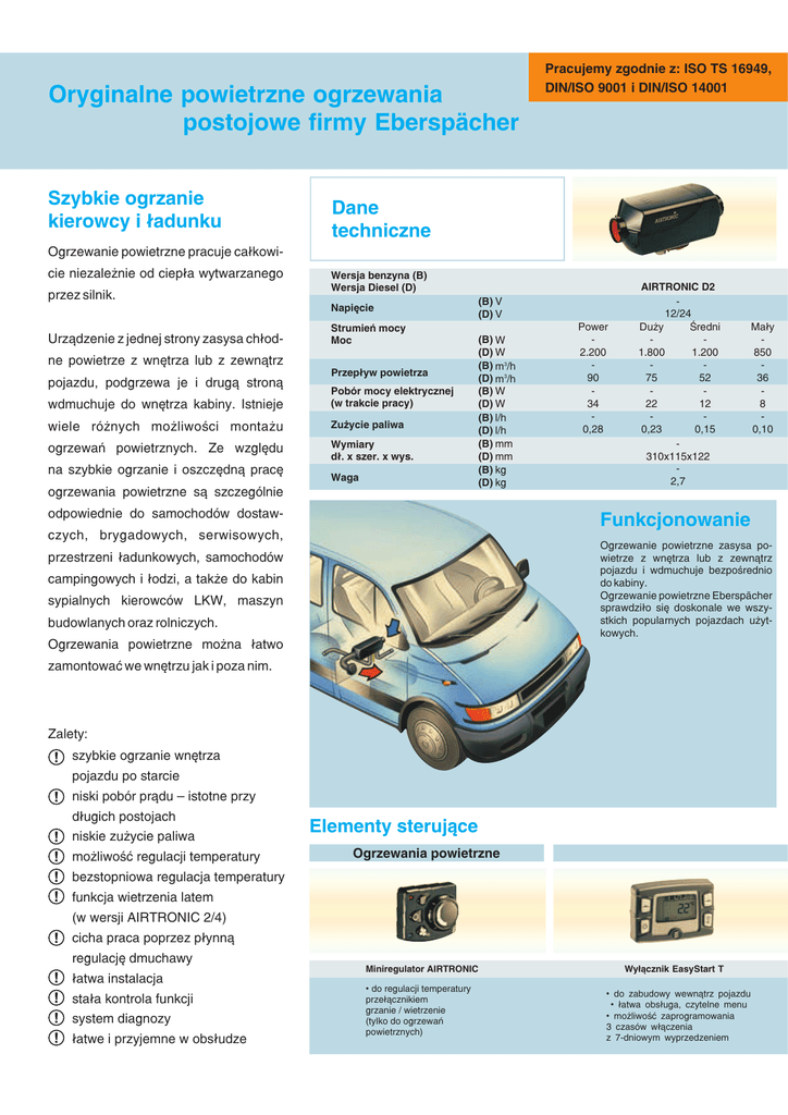 Oryginalne powietrzne ogrzewania postojowe firmy Eberspächer Szybkie ogrzanie kierowcy i ³adunku Pracujemy zgodnie z: ISO TS 16949, DIN/ISO 9001 i DIN/ISO 14001 Dane techniczne Ogrzewanie powietrzne pracuje ca³kowicie niezale¿nie od ciep³a wytwarzanego przez silnik. Wersja benzyna (B) Wersja Diesel (D) Napiêcie Urz¹dzenie z jednej strony zasysa ch³od- Strumieñ mocy Moc ne powietrze z wnêtrza lub z zewn¹trz pojazdu, podgrzewa je i drug¹ stron¹ Przep³yw powietrza wdmuchuje do wnêtrza kabiny. Istnieje Pobór mocy elektrycznej (w trakcie pracy) wiele ró¿nych mo¿liwoœci monta¿u Zu¿ycie paliwa ogrzewañ powietrznych. Ze wzglêdu Wymiary d³. x szer. x wys. na szybkie ogrzanie i oszczêdn¹ pracê Waga ogrzewania powietrzne s¹ szczególnie (B) V (D) V (B) W (D) W (B) m3/h (D) m3/h (B) W (D) W (B) l/h (D) l/h (B) mm (D) mm (B) kg (D) kg odpowiednie do samochodów dostaw- Power 2.200 90 34 0,28 AIRTRONIC D2 12/24 Œredni Du¿y 1.200 1.800 52 75 12 22 0,15 0,23 310x115x122 2,7 Funkcjonowanie czych, brygadowych, serwisowych, Ogrzewanie powietrzne zasysa powietrze z wnêtrza lub z zewn¹trz pojazdu i wdmuchuje bezpoœrednio do kabiny. Ogrzewanie powietrzne Eberspächer sprawdzi³o siê doskonale we wszystkich popularnych pojazdach u¿ytkowych. przestrzeni ³adunkowych, samochodów campingowych i ³odzi, a tak¿e do kabin sypialnych kierowców LKW, maszyn budowlanych oraz rolniczych. Ogrzewania powietrzne mo¿na ³atwo zamontowaæ we wnêtrzu jak i poza nim. Zalety: szybkie ogrzanie wnêtrza pojazdu po starcie niski pobór pr¹du – istotne przy d³ugich postojach niskie zu¿ycie paliwa mo¿liwoœæ regulacji temperatury Elementy steruj¹ce Ogrzewania powietrzne bezstopniowa regulacja temperatury funkcja wietrzenia latem (w wersji AIRTRONIC 2/4) cicha praca poprzez p³ynn¹ regulacjê dmuchawy ³atwa instalacja sta³a kontrola funkcji system diagnozy ³atwe i przyjemne w obs³udze Ma³y 850 36 8 0,10 Miniregulator AIRTRONIC • do regulacji temperatury prze³¹cznikiem grzanie / wietrzenie (tylko do ogrzewañ powietrznych) Wy³¹cznik EasyStart T • do zabudowy wewn¹trz pojazdu • ³atwa obs³uga, czytelne menu • mo¿liwoœæ zaprogramowania 3 czasów w³¹czenia z 7-dniowym wyprzedzeniem Ciep³o dla Ciebie i Twojego za³adunku! Power 3.800 4.000 160 160 40 40 0,54 0,51 AIRTRONIC B4 AIRTRONIC D4 12 12/24 Œredni Du¿y 2.100 3.200 2.000 3.000 100 140 95 130 15 29 13 24 0,29 0,46 0,25 0,38 376 x 140 x 150 376 x 140 x 150 Ma³y 1.300 1.000 75 55 9 7 0,18 0,13 AIRTRONIC B5 AIRTRONIC D5 12 12/24 Œredni Du¿y 2.700 4.800 2.700 4.800 138 233 140 210 30 80 30 80 0,37 0,65 0,34 0,58 530 x 170 x 185 530 x 170 x 185 Power 5.500 5.500 233 233 85 85 0,74 0,66 – D8LC – 12/24 Ma³y 2.000 1.500 138 90 15 15 0,27 0,15 dmuchawa powietrza spalania Airtronic D2 Powietrze z otoczenia i paliwo ze zbiornika zostaj¹ dostarczone do komory spalania, tam wymieszane i zapalone. Œwie¿e powietrze jest ogrzewane przez wytworzon¹ energiê ciepln¹ i kierowane do kabiny pojazdu. czujnik temperatury Ma³y – 3.500 – 250 – 115 – 0,40 – 653 x 260 x 250 – 20 9,3 4,5 Du¿y – 8.000 – 258 – 115 – 1,00 czujnik p³omienia i przegrzania sterownik wylot ciep³ego powietrza ko³o dmuchawy powietrza wymiennik ciep³a wlot zimnego powietrza komora spalania doprowadzenie paliwa wylot spalin sztyft ¿arowy pompa dozuj¹ca paliwo wlot powietrza spalania Ogrzewania wodne i powietrzne Zdalne sterowanie EasyStart R* • model bazowy, kompatybilny z EasyStart T lub mini regulatorem • funkcja sygna³u zwrotnego Zdalne sterowanie EasyStart R+ • wersja komfortowa • posiada funkcje EasyStart T • funkcja sygna³u zwrotnego Zdalne sterowanie telefoniczne GSM CALLTRONIC* • modu³ GSM z kart¹ SIM, aktywowany przez telefon komórkowy lub stacjonarny z wybieraniem tonowym dostêpny dla ogrzewañ 12V, do obs³ugi ogrzewañ powietrznych konieczny jest element steruj¹cy z mo¿liwoœci¹ nastawienia temperatury (miniregulator AIRTRONIC lub EasyStart T)