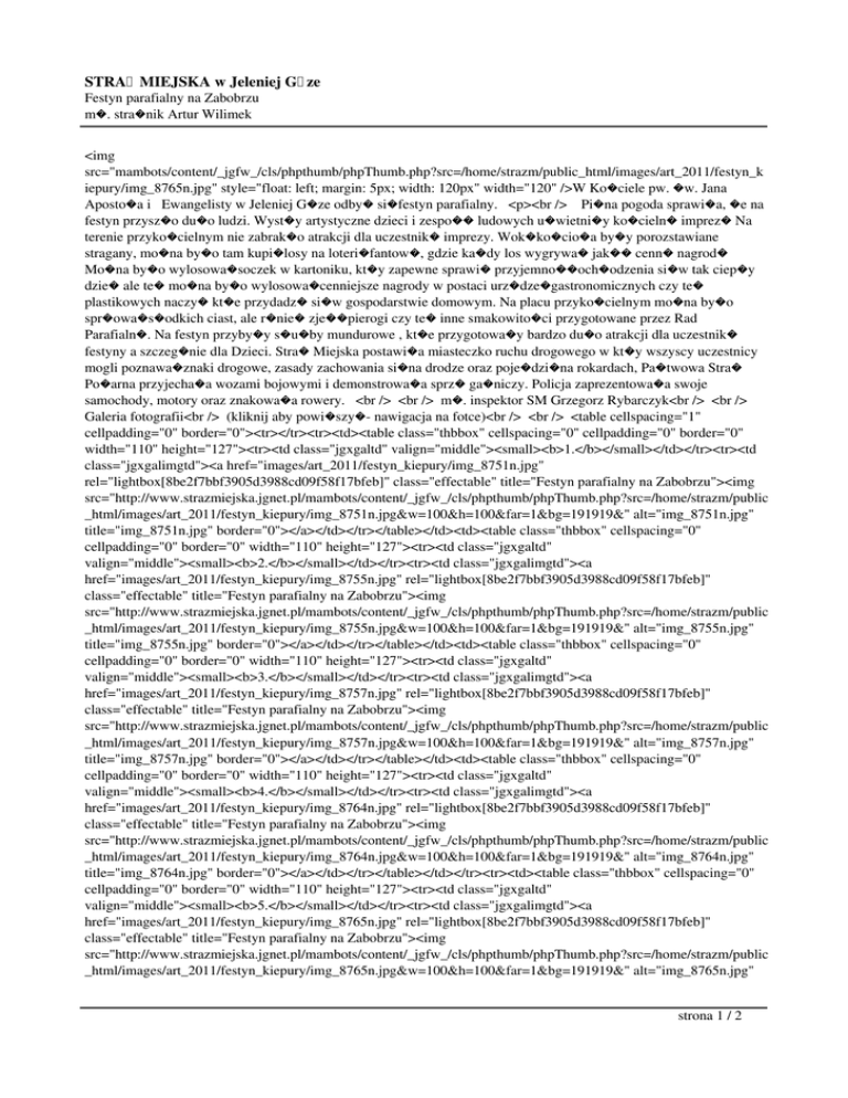 STRA� MIEJSKA w Jeleniej G�ze Festyn parafialny na Zabobrzu m�. stra�nik Artur Wilimek <img src="mambots/content/_jgfw_/cls/phpthumb/phpThumb.php?src=/home/strazm/public_html/images/art_2011/festyn_k iepury/img_8765n.jpg" style="float: left; margin: 5px; width: 120px" width="120" />W Ko�ciele pw. �w. Jana Aposto�a i Ewangelisty w Jeleniej G�ze odby� si�festyn parafialny. <p><br /> Pi�na pogoda sprawi�a, �e na festyn przysz�o du�o ludzi. Wyst�y artystyczne dzieci i zespo�� ludowych u�wietni�y ko�cieln� imprez� Na terenie przyko�cielnym nie zabrak�o atrakcji dla uczestnik� imprezy. Wok�ko�cio�a by�y porozstawiane stragany, mo�na by�o tam kupi�losy na loteri�fantow�, gdzie ka�dy los wygrywa� jak�� cenn� nagrod� Mo�na by�o wylosowa�soczek w kartoniku, kt�y zapewne sprawi� przyjemno��och�odzenia si�w tak ciep�y dzie� ale te� mo�na by�o wylosowa�cenniejsze nagrody w postaci urz�dze�gastronomicznych czy te� plastikowych naczy� kt�e przydadz� si�w gospodarstwie domowym. Na placu przyko�cielnym mo�na by�o spr�owa�s�odkich ciast, ale r�nie� zje��pierogi czy te� inne smakowito�ci przygotowane przez Rad Parafialn�. Na festyn przyby�y s�u�by mundurowe , kt�e przygotowa�y bardzo du�o atrakcji dla uczestnik� festyny a szczeg�nie dla Dzieci. Stra� Miejska postawi�a miasteczko ruchu drogowego w kt�y wszyscy uczestnicy mogli poznawa�znaki drogowe, zasady zachowania si�na drodze oraz poje�dzi�na rokardach, Pa�twowa Stra� Po�arna przyjecha�a wozami bojowymi i demonstrowa�a sprz� ga�niczy. Policja zaprezentowa�a swoje samochody, motory oraz znakowa�a rowery. <br /> <br /> m�. inspektor SM Grzegorz Rybarczyk<br /> <br /> Galeria fotografii<br /> (kliknij aby powi�szy�- nawigacja na fotce)<br /> <br /> <table cellspacing="1" cellpadding="0" border="0"><tr></tr><tr><td><table class="thbbox" cellspacing="0" cellpadding="0" border="0" width="110" height="127"><tr><td class="jgxgaltd" valign="middle"><small><b>1.</b></small></td></tr><tr><td class="jgxgalimgtd"><a href="images/art_2011/festyn_kiepury/img_8751n.jpg" rel="lightbox[8be2f7bbf3905d3988cd09f58f17bfeb]" class="effectable" title="Festyn parafialny na Zabobrzu"><img src="http://www.strazmiejska.jgnet.pl/mambots/content/_jgfw_/cls/phpthumb/phpThumb.php?src=/home/strazm/public _html/images/art_2011/festyn_kiepury/img_8751n.jpg&w=100&h=100&far=1&bg=191919&" alt="img_8751n.jpg" title="img_8751n.jpg" border="0"></a></td></tr></table></td><td><table class="thbbox" cellspacing="0" cellpadding="0" border="0" width="110" height="127"><tr><td class="jgxgaltd" valign="middle"><small><b>2.</b></small></td></tr><tr><td class="jgxgalimgtd"><a href="images/art_2011/festyn_kiepury/img_8755n.jpg" rel="lightbox[8be2f7bbf3905d3988cd09f58f17bfeb]" class="effectable" title="Festyn parafialny na Zabobrzu"><img src="http://www.strazmiejska.jgnet.pl/mambots/content/_jgfw_/cls/phpthumb/phpThumb.php?src=/home/strazm/public _html/images/art_2011/festyn_kiepury/img_8755n.jpg&w=100&h=100&far=1&bg=191919&" alt="img_8755n.jpg" title="img_8755n.jpg" border="0"></a></td></tr></table></td><td><table class="thbbox" cellspacing="0" cellpadding="0" border="0" width="110" height="127"><tr><td class="jgxgaltd" valign="middle"><small><b>3.</b></small></td></tr><tr><td class="jgxgalimgtd"><a href="images/art_2011/festyn_kiepury/img_8757n.jpg" rel="lightbox[8be2f7bbf3905d3988cd09f58f17bfeb]" class="effectable" title="Festyn parafialny na Zabobrzu"><img src="http://www.strazmiejska.jgnet.pl/mambots/content/_jgfw_/cls/phpthumb/phpThumb.php?src=/home/strazm/public _html/images/art_2011/festyn_kiepury/img_8757n.jpg&w=100&h=100&far=1&bg=191919&" alt="img_8757n.jpg" title="img_8757n.jpg" border="0"></a></td></tr></table></td><td><table class="thbbox" cellspacing="0" cellpadding="0" border="0" width="110" height="127"><tr><td class="jgxgaltd" valign="middle"><small><b>4.</b></small></td></tr><tr><td class="jgxgalimgtd"><a href="images/art_2011/festyn_kiepury/img_8764n.jpg" rel="lightbox[8be2f7bbf3905d3988cd09f58f17bfeb]" class="effectable" title="Festyn parafialny na Zabobrzu"><img src="http://www.strazmiejska.jgnet.pl/mambots/content/_jgfw_/cls/phpthumb/phpThumb.php?src=/home/strazm/public _html/images/art_2011/festyn_kiepury/img_8764n.jpg&w=100&h=100&far=1&bg=191919&" alt="img_8764n.jpg" title="img_8764n.jpg" border="0"></a></td></tr></table></td></tr><tr><td><table class="thbbox" cellspacing="0" cellpadding="0" border="0" width="110" height="127"><tr><td class="jgxgaltd" valign="middle"><small><b>5.</b></small></td></tr><tr><td class="jgxgalimgtd"><a href="images/art_2011/festyn_kiepury/img_8765n.jpg" rel="lightbox[8be2f7bbf3905d3988cd09f58f17bfeb]" class="effectable" title="Festyn parafialny na Zabobrzu"><img src="http://www.strazmiejska.jgnet.pl/mambots/content/_jgfw_/cls/phpthumb/phpThumb.php?src=/home/strazm/public _html/images/art_2011/festyn_kiepury/img_8765n.jpg&w=100&h=100&far=1&bg=191919&" alt="img_8765n.jpg" strona 1 / 2 STRA� MIEJSKA w Jeleniej G�ze Festyn parafialny na Zabobrzu m�. stra�nik Artur Wilimek title="img_8765n.jpg" border="0"></a></td></tr></table></td><td><table class="thbbox" cellspacing="0" cellpadding="0" border="0" width="110" height="127"><tr><td class="jgxgaltd" valign="middle"><small><b>6.</b></small></td></tr><tr><td class="jgxgalimgtd"><a href="images/art_2011/festyn_kiepury/img_8783n.jpg" rel="lightbox[8be2f7bbf3905d3988cd09f58f17bfeb]" class="effectable" title="Festyn parafialny na Zabobrzu"><img src="http://www.strazmiejska.jgnet.pl/mambots/content/_jgfw_/cls/phpthumb/phpThumb.php?src=/home/strazm/public _html/images/art_2011/festyn_kiepury/img_8783n.jpg&w=100&h=100&far=1&bg=191919&" alt="img_8783n.jpg" title="img_8783n.jpg" border="0"></a></td></tr></table></td><td><table class="thbbox" cellspacing="0" cellpadding="0" border="0" width="110" height="127"><