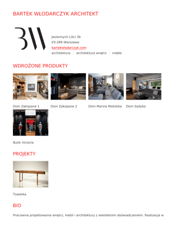 BARTEK WŁODARCZYK ARCHITEKT Jesiennych Liści 3b 03-289 Warszawa bartekwlodarczyk.com architektura architektura wnętrz meble WDROŻONE PRODUKTY Dom Zakopane 1 Dom Zakopane 2 Dom Marina Mokotów Dom Sadyba Butik Victoria PROJEKTY Toaletka BIO Pracownia projektowania wnętrz, mebli i architektury z wieloletnim doświadczeniem. Realizacje w Polsce i za granicą, oferta "pod klucz" oraz nadzory autorskie. Pracownia architektury Bartka Włodarczyka została założona w 1998 roku przez absolwenta Wydziału Architektury Politechniki Warszawskiej. Owocem 17 lat pracy są liczne realizacje wnętrz prywatnych mieszkań i domów, biura i siedziby firm. Wiele z nich doczekało się publikacji w takich pismach jak „Dobre wnętrze”, „Dom i wnętrze” i in.