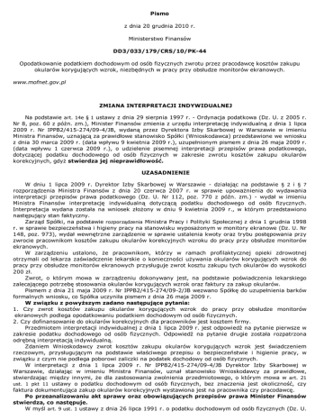 Pismo z dnia 20 grudnia 2010 r. Ministerstwo Finansów DD3/033/179/CRS/10/PK-44 Opodatkowanie podatkiem dochodowym od osób fizycznych zwrotu przez pracodawcę kosztów zakupu okularów korygujących wzrok, niezbędnych w pracy przy obsłudze monitorów ekranowych. www.mofnet.gov.pl ZMIANA INTERPRETACJI INDYWIDUALNEJ Na podstawie art. 14e § 1 ustawy z dnia 29 sierpnia 1997 r. - Ordynacja podatkowa (Dz. U. z 2005 r. Nr 8, poz. 60 z późn. zm.), Minister Finansów zmienia z urzędu interpretację indywidualną z dnia 1 lipca 2009 r. Nr IPPB2/415-274/09-4/JB, wydaną przez Dyrektora Izby Skarbowej w Warszawie w imieniu Ministra Finansów, uznającą za prawidłowe stanowisko Spółki (Wnioskodawca) przedstawione we wniosku z dnia 30 marca 2009 r. (data wpływu 9 kwietnia 2009 r.), uzupełnionym pismem z dnia 26 maja 2009 r. (data wpływu 1 czerwca 2009 r.), o udzielenie pisemnej interpretacji przepisów prawa podatkowego, dotyczącej podatku dochodowego od osób fizycznych w zakresie zwrotu kosztów zakupu okularów korekcyjnych, gdyŜ stwierdza jej nieprawidłowość. UZASADNIENIE W dniu 1 lipca 2009 r. Dyrektor Izby Skarbowej w Warszawie - działając na podstawie § 2 i § 7 rozporządzenia Ministra Finansów z dnia 20 czerwca 2007 r. w sprawie upowaŜnienia do wydawania interpretacji przepisów prawa podatkowego (Dz. U. Nr 112, poz. 770 z późn. zm.) - wydał w imieniu Ministra Finansów interpretację indywidualną dotyczącą podatku dochodowego od osób fizycznych. Interpretacja wydana została na wniosek złoŜony w dniu 9 kwietnia 2009 r., w którym przedstawiono następujący stan faktyczny. Zarząd Spółki, na podstawie rozporządzenia Ministra Pracy i Polityki Społecznej z dnia 1 grudnia 1998 r. w sprawie bezpieczeństwa i higieny pracy na stanowisku wyposaŜonym w monitory ekranowe (Dz. U. Nr 148, poz. 973), wydał wewnętrzne zarządzenie w sprawie ustalenia kwoty oraz trybu postępowania przy zwrocie pracownikom kosztów zakupu okularów korekcyjnych wzroku do pracy przy obsłudze monitorów ekranowych. W zarządzeniu ustalono, Ŝe pracownikom, którzy w ramach profilaktycznej opieki zdrowotnej otrzymali od lekarza zaświadczenie lekarskie o konieczności uŜywania okularów korygujących wzrok do pracy przy obsłudze monitorów ekranowych przysługuje zwrot kosztu zakupu tych okularów do wysokości 200 zł. Zwrot, o którym mowa w zarządzeniu dokonywany jest, na podstawie poświadczenia lekarskiego zalecającego potrzebę stosowania okularów korygujących wzrok oraz faktury za zakup okularów. Pismem z dnia 21 maja 2009 r. Nr IPPB2/415-274/09-2/JB wezwano Spółkę do uzupełnienia barków formalnych wniosku, co Spółka uczyniła pismem z dnia 26 maja 2009 r. W związku z powyŜszym zadano następujące pytania: 1. Czy zwrot kosztów zakupu okularów korygujących wzrok do pracy przy obsłudze monitorów ekranowych podlega opodatkowaniu podatkiem dochodowym od osób fizycznych. 2. Czy dofinansowanie do okularów korekcyjnych dla pracowników jest kosztem firmy. Przedmiotem interpretacji indywidualnej z dnia 1 lipca 2009 r. jest odpowiedź na pytanie pierwsze w zakresie podatku dochodowego od osób fizycznych. Odpowiedź na pytanie drugie została rozpatrzona odrębną interpretacją indywidualną. Zdaniem Wnioskodawcy zwrot kosztów zakupu okularów korygujących wzrok jest świadczeniem rzeczowym, przysługującym na podstawie właściwego przepisu o bezpieczeństwie i higienie pracy, w związku z czym nie podlega poborowi zaliczki na podatek dochodowy od osób fizycznych. W interpretacji z dnia 1 lipca 2009 r. Nr IPPB2/415-274/09-4/JB Dyrektor Izby Skarbowej w Warszawie, działając w imieniu Ministra Finansów, uznał stanowisko Wnioskodawcy za prawidłowe, stwierdzając między innymi, Ŝe dla zastosowania zwolnienia przedmiotowego, o którym mowa w art. 21 ust. 1 pkt 11 ustawy o podatku dochodowym od osób fizycznych, bez znaczenia jest okoliczność, czy faktura dokumentująca zakup okularów korekcyjnych wystawiona jest na pracownika czy pracodawcę. Po przeanalizowaniu akt sprawy oraz obowiązujących przepisów prawa Minister Finansów stwierdza, co następuje. W myśl art. 9 ust. 1 ustawy z dnia 26 lipca 1991 r. o podatku dochodowym od osób fizycznych (Dz. U. z 2010 r. Nr 51, poz. 307 z późn. zm.), w brzmieniu obowiązującym w 2009 r., zwanej dalej "ustawą", opodatkowaniu podatkiem dochodowym podlegają wszelkiego rodzaju dochody, z wyjątkiem dochodów wymienionych w art. 21, 52, 52a i 52c oraz dochodów, od których na podstawie przepisów Ordynacji podatkowej zaniechano poboru podatku. Przepis art. 11 ust. 1 ustawy stanowi, Ŝe przychodami, z zastrzeŜeniem art. 14-15, art. 17 ust. 1 pkt 6, 9 i 10 w zakresie realizacji praw wynikających z pochodnych instrumentów finansowych, art. 19 i art. 20 ust. 3, są otrzymane lub postawione do dyspozycji podatnika w roku kalendarzowym pieniądze i wartości pienięŜne oraz wartość otrzymanych świadczeń w naturze i innych nieodpłatnych świadczeń. Na podstawie art. 12 ust. 1 ustawy za przychody ze stosunku słuŜbowego, stosunku pracy, pracy nakładczej oraz spółdzielczego stosunku pracy uwaŜa się wszelkiego rodzaju wypłaty pienięŜne oraz wartość pienięŜną świadczeń w naturze bądź ich ekwiwalenty, bez względu na źródło finansowania tych wypłat i świadczeń, a w szczególności: wynagrodzenia zasadnicze, wynagrodzenia za godziny nadliczbowe, róŜnego rodzaju dodatki, nagrody, ekwiwalenty za nie wykorzystany urlop i wszelkie inne kwoty niezaleŜnie od tego, czy ich wysokość została z góry ustalona, a ponadto świadczenia pienięŜne ponoszone za pracownika, jak równieŜ wartość innych nieodpłatnych świadczeń lub świadczeń częściowo odpłatnych. Na mocy art. 21 ust. 1 pkt 11 ustawy wolne od podatku dochodowego są świadczenia rzeczowe i ekwiwalenty za te świadczenia, przysługujące na podstawie przepisów o bezpieczeństwie i higienie pracy, jeŜeli zasady ich przyz