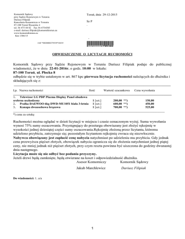 Komornik Sądowy przy Sądzie Rejonowym w Toruniu Dariusz Filipiak Kancelaria Komornicza w Toruniu 87-100 Toruń Ślusarska 4 tel. 56 475 44 82 Fax 56 4754585 e-mail: [email protected] www.komorniktorun.eu Km 1306/15 #AF *0020000279539*/0419/ Toruń, dnia 29-12-2015 Sz P . *0020000279539* OBWIESZCZENIE O LICYTACJI RUCHOMOŚCI Komornik Sądowy przy Sądzie Rejonowym w Toruniu Dariusz Filipiak podaje do publicznej wiadomości, że w dniu 22-01-2016r. o godz. 10:00 w lokalu: 87-100 Toruń, ul. Płocka 8 odbędzie się w trybie ustalonym w art. 867 kpc pierwsza licytacja ruchomości należących do dłużnika i składających się z: ____________________________________________________________________________________________________ Lp. Nazwa ruchomości Ilość Wartość szacunkowa Cena wywołania _____________________________________________________________________________________________________ 1. Telewizor LG PDP Plazma Display Panel obudowa srebrna uszkodzony 1 [szt.] 200,00 **) 150,00 2. Pralka DAEWOO 6kg DWD-MU1051 biała 3-letnia 1 [szt.] 600,00 **) 450,00 3. Kanapa dwuosobowa brązowa 1 [szt.] 700,00 **) 525,00 _______________________________________________________________________________________________________________________ *) cena za sztukę Ruchomości można oglądać w dzień licytacji w miejscu i czasie oznaczonym wyżej. Suma wywołania wynosi 75% sumy oszacowania. Przystępujący do przetargu obowiazany jest złożyć rękojmię w wysokości jednej dziesiątej części sumy oszacowania.Rękojmię złożoną przez licytanta, któremu udzielono przybicia, zatrzymuje się; pozostałym licytantom rejkojmię zwraca się niezwłocznie. Nabywca obowiązany jest zapłacić cenę nabycia natychmiast po udzieleniu mu przybicia. Gdy jednak cena przewyższa pięćset złotych, obowiązek nabycia ogranicza się do złożenia natychmiast jednej piątej ceny, nie mniej jednak niż pięćset złotych, przy czym reszta powinna być uiszczona do godziny dwunastej dnia następnego. Licytacja może się nie odbyć bez podania przyczyny. Jeżeli drzwi będą zamknięte, będą otwierane na koszt i odpowiedzialność dłużnika. Asesor Komorniczy Komornik Sądowy Jakub Marchlewicz Do wiadomości: 1. a/a 1 Dariusz Filipiak