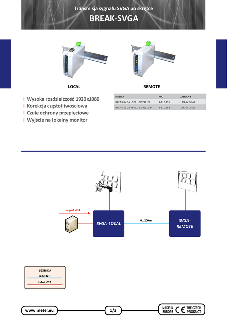 Transmisja sygnału SVGA po skrętce BREAK-SVGA LOCAL I I I I REMOTE Wysoka rozdzielczość 1920x1080 Korekcja częstotliwościowa Czułe ochrony przepięciowe Wyjście na lokalny monitor NAZWA KOD ZASILANIE BREAK-SVGA-LOCAL-DIN/12-24 3-110-251 12/24VDC-AC BREAK-SVGA-REMOTE-DIN /12-24 3-110-252 12/24VDC-AC sygnał VGA SVGA-LOCAL LEGENDA kabel UTP kabel VGA www.metel.eu 11/13 1/3 0...200 m SVGAREMOTE Instrukcja instalacji REV:201101 BREAK-SVGA Transmisja SVGA przez UTP Cat5e Opis i parametry techniczne Konwerter SVGA-LOCAL moduluje niesymetryczny sygnał SVGA RGB, H-SYNC i V-SYNC do trzech symetrycznych par kabla skrętki Cat 5e. Czwarta wolna para może być wykorzystana do transmisji RS485 lub innego sygnału. Zasięg transmisji do odbiorczego konwertera SVGA-REMOTE wynosi max.200m. Ewentualną powstałą tłumienność na należy skorygować przy pomocy korekcji częstotliwościowej i wzmocnienia sygnału. Prawidłowe podłączenie sygnału i zasilania jest sygnalizowane diodami LED. Zabezpieczenia przeciwprzepięciowe na torze sygnałowym i na zasilaniu umożliwiają instalację konwerterów na obiektach przemysłowych. Przy stosowaniu w systemach na zewnątrz zalecamy dodatkowe zabezpieczenie par sygnałowych ochronnikami COP-4V-DIN lub DPS. Konwertery SVGA najczęściej znajdują zastosowanie do zdalnego wyświetlania informacji na panelach LCD na lotniskach, dworcach, autostradach, kasynach, centrach handlowych itp. SVGA Parametr Wartość Jednostka Rozdzielczość max. 1920 x 1080 piksel Zabezpieczenie p.przepięciowe czułe Korekcja częstotliowościowa + wzmocnienie Zasięg transmisji Zasilanie Uwagi trimer 0-200 m Cat5 UTP (FTP) LOCAL 10-30 VDC-AC max. 2VA REMOTE 10-30 VDC-AC max. 2VA Środowisko Temperatura pracy –40...+60 o Budowa Wymiary – szer. / wys. / dł. 35 / 100 / 120 mm C Producent zastrzega sobie prawo zmiany parametrów technicznych bez wcześniejszego uprzedzenia. Instalacja i ustawienia 1. Montaż konwertera Wpiąć konwerter w listwę DIN35. 3. Podłączenie przewodów sygnałowych Przewody sygnałowe podłączyć wg poniższego 2. Podłączyć zasilanie 4. Ustawienie wzmocnienia i korekcji Trimerami na przednim panelu konwertera REMOTE wyregulować sygnał video na zdalnym monitorze LCD. SVGA-LOCAL SVGA-REMOTE SVGA SVGA UTP Cat5e max. 200m www.metel.eu GA SV Lokalny monitor rysunku. 2/3 Zdalny monitor Instrukcja instalacji REV:201101 BREAK-SVGA SVGA-REMOTE-DIN/12-24 Transmisja SVGA przez UTP Cat5e 101,00 119,00 35,00 101,00 119,00 35,00 REWIZJA: 201101 -nowy rysunek www.metel.eu 3/3