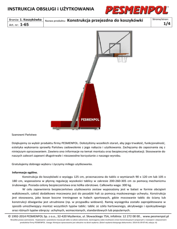 INSTRUKCJA OBSŁUGI i UŻYTKOWANIA Branża: 1. Koszykówka Art. nr: 1-65 Nazwa produktu: Konstrukcja przejezdna do koszykówki Strona/stron: 1/4 Szanowni Państwo Dziękujemy za wybór produktu firmy PESMENPOL. Dołożyliśmy wszelkich starań, aby jego trwałość, funkcjonalność, estetyka wykonania sprawiły Państwu zadowolenie z jego nabycia i użytkowania. Zachęcamy do zapoznania się z niniejszym opracowaniem. Zawiera ono informacje na temat montażu oraz bezpiecznej eksploatacji. Stosowanie do naszych zaleceń zapewni długotrwałe i niezawodne korzystanie z naszego wyrobu. Gratulujemy dobrego wyboru i życzymy miłego użytkowania. Informacje ogólne. Konstrukcja do koszykówki o wysięgu 125 cm, przeznaczona do tablic o wymiarach 90 x 120 cm lub 105 x 180 cm, wyposażona w płynną regulację wysokości tablicy w zakresie 200-260-305 cm za pomocą mechanizmu śrubowego. Posiada osłony bezpieczeństwa oraz kółka obrotowe. Całkowita waga: 300 kg. W celu zapewnienia bezpieczeństwa użytkowania zestaw wyposażony jest w balast w formie obciążeń walizkowych, całość dodatkowo mocowana jest do posadzki hali za pomocą maskowanego uchwytu. Konstrukcja jest stosowana, jako kosze boczne treningowe w halach sportowych, gdzie mocowanie tablic do ściany lub konstrukcji dźwigarów jest utrudnione (np. w przypadku widowni). Ramię wysięgnika zostało zaprojektowane w sposób umożliwiający montaż wszystkich typów tablic: tablic ze szkła hartowanego, akrylowego i epoksydowego oraz różnych typów obręczy: uchylnych, wzmacnianych, standardowych lub popularnych. © 1992-2014 PESMENPOL Sp. z o.o., 32-420 Myślenice, ul. Słowackiego 75A, infolinia: 12 272 00 00 , www.pesmenpol.pl Wszelkie prawa zastrzeżone. Kopiowanie i powielanie inaczej jak tylko w całości zabronione. Zastrzegamy sobie możliwość zmian konstrukcyjnych związanych z rozwojem i ulepszeniami produktów firmy PESMENPOL. Uwaga: Niniejsze opracowanie jest aktualne na dzień wydania. (Dzień wydania bieżącego dokumentu: 2014-01-09 07:44, edycja: A) INSTRUKCJA OBSŁUGI i UŻYTKOWANIA Branża: 1. Koszykówka Art. nr: Nazwa produktu: 1-65 L.p. 1 2 3 4 5 6 7 8 9 10 Konstrukcja przejezdna do koszykówki Lista części Nazwa części Ilość L.p. Nazwa części Rama podstawy 1 11 Korbka regulacyjna Rama przednia 1 12 Stopki Wysięg 1 S1 śruba M10x120, podkładka, nakrętka M10, Tablica 1 S2 śruba M10x 60, podkładka, M10 nut, Zastrzał 2 S3 śruba M12x120 podkładka, nakrętka M12, Obręcz 1 S4 śruba M10x70, (opcjonalnie) Siatka 1 S5 śruba M10x25 podkładka, nakrętka M10 Balast walizkowy 8 S6 śruba M10x25 podkładka, Rama podłogowa z deklem, 1 S7 śruba M10x80 podkładka, Zestaw kotwiący: szpilka, nakrętka z koluchem, łańcuch, śruba zakończona hakiem, nakrętka motylkowa, Strona/stron: 2/4 Ilość 1 4 2 2 1 1 2 1 4 1 Instrukcja montażu Przykręcić ramę przednią (2) do ramy podstawy (1) za pomocą zestawu śrub (S1). S1 2 S2 1 Wysięgnik (3) należy nasunąć na profil ustalający znajdujący się na ramie podstawy (1) oraz dokręcić śrubę (S3), następnie oprzeć o ramę przednią 2 i przykręcić go za pomocą zestawu śrub S2. 3 S3 2 1 © 1992-2014 PESMENPOL Sp. z o.o., 32-420 Myślenice, ul. Słowackiego 75A, infolinia: 12 272 00 00 , www.pesmenpol.pl Wszelkie prawa zastrzeżone. Kopiowanie i powielanie inaczej jak tylko w całości zabronione. Zastrzegamy sobie możliwość zmian konstrukcyjnych związanych z rozwojem i ulepszeniami produktów firmy PESMENPOL. Uwaga: Niniejsze opracowanie jest aktualne na dzień wydania. (Dzień wydania bieżącego dokumentu: 2014-01-09 07:44, edycja: A) INSTRUKCJA OBSŁUGI i UŻYTKOWANIA Branża: 1. Koszykówka Art. nr: 1-65 Nazwa produktu: Konstrukcja przejezdna do koszykówki Strona/stron: 3/4 Przykręcić tablice za pomocą śruby ustalającej (stożkowej z gniazdem imbusowym) (S4) do wysięgnika, oraz zamocować z tyłu tablicy zastrzały stabilizujące. Jeżeli w wysięgniku oraz w tablicy nie ma otworów ustalających śrubę (S4), tablicę przykręcamy równocześnie z obręczą. S5 4 S5 5 S6 S4 Obręcz (6) przykręcamy do tablicy za pomocą zestawu śrub (S7). 6 S7 Po podniesieniu przykrywy skrzyni balastu, należy umieścić w niej obciążniki walizkowe (8). Jedna konstrukcja powinna być dociążona ośmioma obciążnikami o łącznej masie 240kg. 8 12 12 © 1992-2014 PESMENPOL Sp. z o.o., 32-420 Myślenice, ul. Słowackiego 75A, infolinia: 12 272 00 00 , www.pesmenpol.pl Wszelkie prawa zastrzeżone. Kopiowanie i powielanie inaczej jak tylko w całości zabronione. Zastrzegamy sobie możliwość zmian konstrukcyjnych związanych z rozwojem i ulepszeniami produktów firmy PESMENPOL. Uwaga: Niniejsze opracowanie jest aktualne na dzień wydania. (Dzień wydania bieżącego dokumentu: 2014-01-09 07:44, edycja: A) INSTRUKCJA OBSŁUGI i UŻYTKOWANIA Branża: 1. Koszykówka Art. nr: 1-65 Nazwa produktu: Konstrukcja przejezdna do koszykówki Mocowanie konstrukcji do podłoża. Pod posadzką w miejscu w którym, konstrukcja będzie użytkowana należy przygotować zaczep. W posadzce najpierw wykonuje się odwiert pod ramę podłogową (9), następnie w podłożu betonowym (wylewce) osadza się szpilkę na kołkach rozporowych, przykręca do niej nakrętkę z koluchem do którego przymocowany jest łańcuch. Łańcuch ten zahaczany jest za specjalnie zagiętą śrubę, która mocowana jest do uchwytu znajdującego się z tyłu ramy podstawy. Przed przystąpieniem do użytkowania należy zablokować konstrukcje. Po ustawieniu konstrukcji na wyznaczonym miejscu należy wykręcić stopki za pomocą korbki regulacyjnej, tak aby koła oderwały się od podłoża. Napinanie zestawu kotwiącego (10) odbywa się za pomocą nakrętki motylkowej. Po zakotwiczeniu konstrukcji i obciążeniu przez balast walizkowy, można przystąpić do regulacji wysokości tablicy względem podłoża. Opuszczanie oraz podnoszenie odbywa się za pomocą śruby regulacyjnej. Po wyc