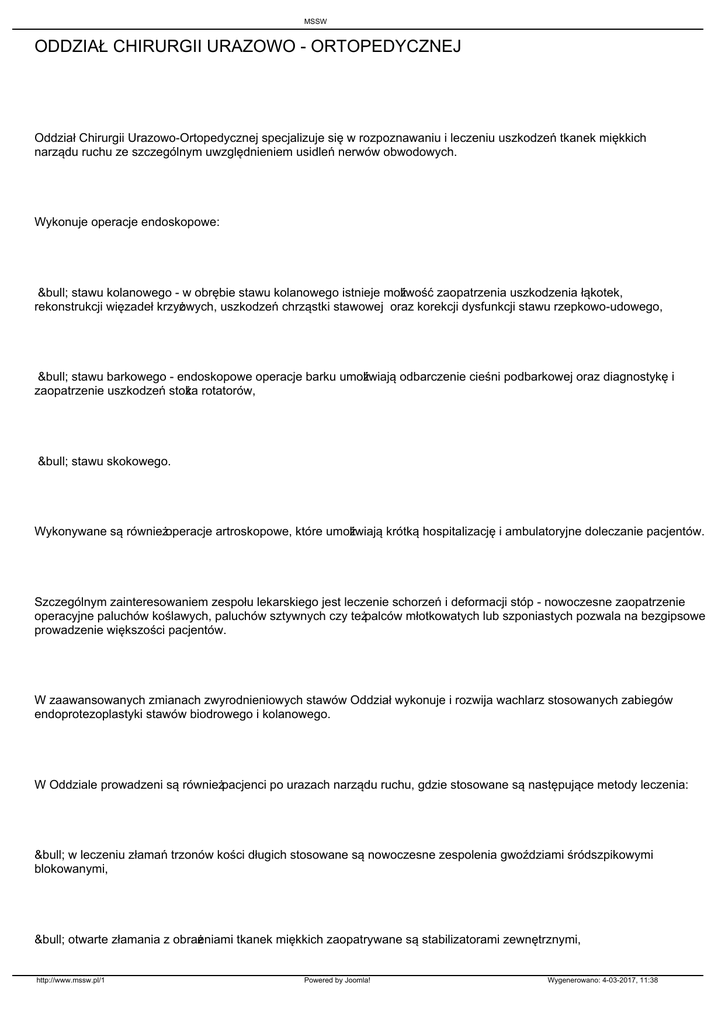 MSSW ODDZIAŁ CHIRURGII URAZOWO - ORTOPEDYCZNEJ Oddział Chirurgii Urazowo-Ortopedycznej specjalizuje się w rozpoznawaniu i leczeniu uszkodzeń tkanek miękkich narządu ruchu ze szczególnym uwzględnieniem usidleń nerwów obwodowych. Wykonuje operacje endoskopowe: • stawu kolanowego - w obrębie stawu kolanowego istnieje możliwość zaopatrzenia uszkodzenia łąkotek, rekonstrukcji więzadeł krzyżowych, uszkodzeń chrząstki stawowej oraz korekcji dysfunkcji stawu rzepkowo-udowego, • stawu barkowego - endoskopowe operacje barku umożliwiają odbarczenie cieśni podbarkowej oraz diagnostykę i zaopatrzenie uszkodzeń stożka rotatorów, • stawu skokowego. Wykonywane są również operacje artroskopowe, które umożliwiają krótką hospitalizację i ambulatoryjne doleczanie pacjentów. Szczególnym zainteresowaniem zespołu lekarskiego jest leczenie schorzeń i deformacji stóp - nowoczesne zaopatrzenie operacyjne paluchów koślawych, paluchów sztywnych czy też palców młotkowatych lub szponiastych pozwala na bezgipsowe prowadzenie większości pacjentów. W zaawansowanych zmianach zwyrodnieniowych stawów Oddział wykonuje i rozwija wachlarz stosowanych zabiegów endoprotezoplastyki stawów biodrowego i kolanowego. W Oddziale prowadzeni są również pacjenci po urazach narządu ruchu, gdzie stosowane są następujące metody leczenia: • w leczeniu złamań trzonów kości długich stosowane są nowoczesne zespolenia gwoździami śródszpikowymi blokowanymi, • otwarte złamania z obrażeniami tkanek miękkich zaopatrywane są stabilizatorami zewnętrznymi, http://www.mssw.pl/1 Powered by Joomla! Wygenerowano: 4-03-2017, 11:38 MSSW • w pozostałych przypadkach stosowane są zespolenia płytkowe lub małoinwazyjne W oddziale jest 25 łóżek ortopedycznych i 3 łóżka w Sali Intensywnego Nadzoru Pielęgniarskiego (POP). Nowoczesne wyposażenie ułatwia profesjonalną opiekę nad pacjentami. Oddział Chirurgii Urazowo-Ortopedycznej ma swój Blok Operacyjny z dwiema salami operacyjnymi z nawiewem laminarnym; jedna wyposażona w kolumny ze sprzętem artroskopowym, druga w ramię C z monitorem do zabiegów urazowych i endoprotezoplastyk. Poza tym na oddziale wprowadzono nowoczesne rozwiązania z dwoma traktami komunikacyjnymi - czystym do transportu chorych i brudnym do transportu narzędzi, bielizny i odpadów z sal operacyjnych. Do dyspozycji oddziału jest Sala Fizykoterapii i Kinezyterapii. Wyposażona jest ona w nowoczesne urządzenia do ciągłych ćwiczeń biernych - artromoty oraz aparaty do fizykoterapii umożliwiające wykonywanie bardzo szerokiej gamy zabiegów leczniczych w tym laseroterapii, magnetoterapii, krioterapii, elektroterapii i terapii ultradźwiękami. Kinezyterapia realizowana jest poprzez stanowisko UGUL (Uniwersalny Gabinet Usprawniania Leczniczego) oraz inne sprzęty do rehabilitacji. ZASADY PRZYJĘĆ W Specjalistycznej Przychodni Przyszpitalnej działa Poradnia Chirurgii Urazowo-Ortopedycznej merytorycznie współpracująca z Oddziałem. Przy Poradni działa Punkt Konsultacyjny, w którym prowadzone są kwalifikacje do zabiegów wysokospecjalistycznych. KADRA ZARZĄDZAJĄCA Kierownik dr n.med. Edward Dobies Zastępca kierownika dr n.med. Paweł Obidziński Zespół rehabilitacji mgr Katarzyna Wąsowicz-Rosińska http://www.mssw.pl/1 Powered by Joomla! Wygenerowano: 4-03-2017, 11:38 MSSW Pielęgniarka oddziałowa mgr Maria Jolanta Śniegóra LOKALIZACJA Budynek C, piętro 3 Plan szpitala KONTAKT SEKRETARIAT: 22 47-35-218 http://www.mssw.pl/1 Powered by Joomla! Wygenerowano: 4-03-2017, 11:38