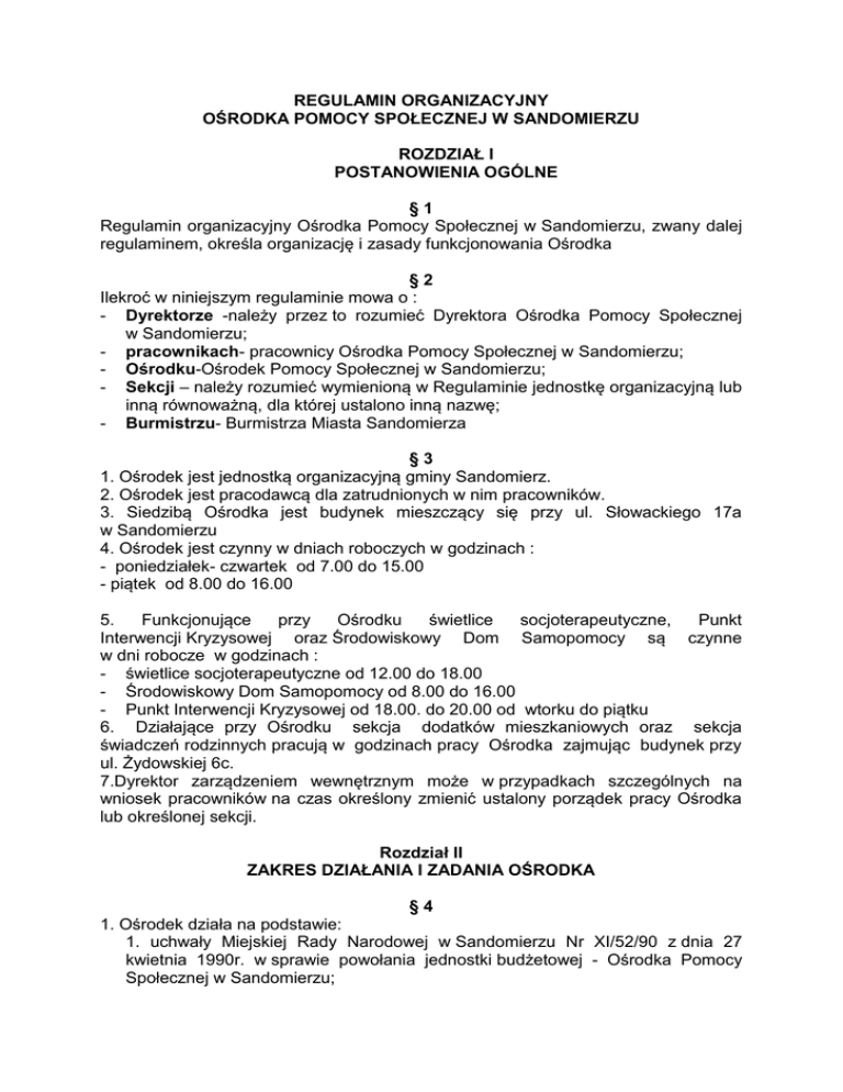 REGULAMIN ORGANIZACYJNY OŚRODKA POMOCY SPOŁECZNEJ W SANDOMIERZU ROZDZIAŁ I POSTANOWIENIA OGÓLNE §1 Regulamin organizacyjny Ośrodka Pomocy Społecznej w Sandomierzu, zwany dalej regulaminem, określa organizację i zasady funkcjonowania Ośrodka §2 Ilekroć w niniejszym regulaminie mowa o : - Dyrektorze -należy przez to rozumieć Dyrektora Ośrodka Pomocy Społecznej w Sandomierzu; - pracownikach- pracownicy Ośrodka Pomocy Społecznej w Sandomierzu; - Ośrodku-Ośrodek Pomocy Społecznej w Sandomierzu; - Sekcji – należy rozumieć wymienioną w Regulaminie jednostkę organizacyjną lub inną równoważną, dla której ustalono inną nazwę; - Burmistrzu- Burmistrza Miasta Sandomierza §3 1. Ośrodek jest jednostką organizacyjną gminy Sandomierz. 2. Ośrodek jest pracodawcą dla zatrudnionych w nim pracowników. 3. Siedzibą Ośrodka jest budynek mieszczący się przy ul. Słowackiego 17a w Sandomierzu 4. Ośrodek jest czynny w dniach roboczych w godzinach : - poniedziałek- czwartek od 7.00 do 15.00 - piątek od 8.00 do 16.00 5. Funkcjonujące przy Ośrodku świetlice socjoterapeutyczne, Punkt Interwencji Kryzysowej oraz Środowiskowy Dom Samopomocy są czynne w dni robocze w godzinach : - świetlice socjoterapeutyczne od 12.00 do 18.00 - Środowiskowy Dom Samopomocy od 8.00 do 16.00 - Punkt Interwencji Kryzysowej od 18.00. do 20.00 od wtorku do piątku 6. Działające przy Ośrodku sekcja dodatków mieszkaniowych oraz sekcja świadczeń rodzinnych pracują w godzinach pracy Ośrodka zajmując budynek przy ul. Żydowskiej 6c. 7.Dyrektor zarządzeniem wewnętrznym może w przypadkach szczególnych na wniosek pracowników na czas określony zmienić ustalony porządek pracy Ośrodka lub określonej sekcji. Rozdział II ZAKRES DZIAŁANIA I ZADANIA OŚRODKA §4 1. Ośrodek działa na podstawie: 1. uchwały Miejskiej Rady Narodowej w Sandomierzu Nr XI/52/90 z dnia 27 kwietnia 1990r. w sprawie powołania jednostki budżetowej - Ośrodka Pomocy Społecznej w Sandomierzu; 2. ustawy z dnia 8 marca 1990r. o samorządzie gminnym (t.j.Dz.U. z 2013r. poz. 594 z późn. zm.); 3. ustawy z dnia 27 sierpnia 2009 r. o finansach publicznych (t.j.Dz.U. z 2013r. poz. 885 z późn. zm.); 4. ustawy z dnia 12 marca 2004 r. o pomocy społecznej (t.j.Dz.U. z 2013r. poz. 182 z późn. zm.); 5. Statutu Ośrodka §5 1. Do zakresu zadań działania Ośrodka należy realizacja zadań własnych gminy z zakresu pomocy społecznej oraz zadań własnych i zleconych gminie przekazanych do realizacji przez Ośrodek. 2. Ośrodek wykonuje zadania wynikające, m.in. z : a) ustawy z dnia 27 sierpnia 2009 r. o finansach publicznych (Dz.U. z 2013r. poz. 885 ze zm.) b) ustawy z dnia 12 marca 2004 r. o pomocy społecznej (t.j. Dz.U. z 2013r. poz. 182 ze zm.) oraz przepisów wydanych na jej podstawie; c) ustawy z dnia 21 czerwca 2001r. o dodatkach mieszkaniowych (t.j. Dz.U z 2013r. poz. 966 ze zm.); d) ustawy z dnia 28 listopada 2003r. o świadczeniach rodzinnych (tj. Dz.U.z 2013r. poz. 1456 ze zm.); e) ustawy z dnia 07.09.2007 r. o pomocy osobom uprawnionym do alimentów (t.j Dz. U. z 2012r. poz. 1228 ze zm. ); f)zadania wynikające z ustawy z dnia 09 czerwca 2011 r. o wspieraniu rodziny i systemie pieczy zastępczej (Dz. U z 2013r. poz. 135 ze zm.); g) Ustawy z dnia 4 kwietnia 2014 r. o ustaleniu i wypłacie zasiłków dla opiekunów (Dz. U z 2014 poz 567) h) ustawy z dnia 24 stycznia 1991 r. o kombatantach oraz niektórych osobach będących ofiarami represji wojennych i okresu powojennego ( Dz. U z 2012 poz 400 z późn. zm. ) i) szczegółowy wykaz realizowanych przez Ośrodek zadań określony został w Statucie Ośrodka Pomocy Społecznej w Sandomierzu. §6 Regulamin pracy, wprowadzony odrębnym zarządzeniem wewnętrznym określa m. in porządek wewnętrzny w Ośrodku oraz obowiązki pracowników i pracodawcy. Rozdział III ZASADY WYKONYWANIA FUNKCJI KIEROWNICZYCH §7 1. Ośrodkiem Pomocy Społecznej w Sandomierzu kieruje i zarządza Dyrektor Ośrodka. 2. Dyrektor zapewnia sprawne funkcjonowanie Ośrodka i organizuje pracę Ośrodka stwarzając warunki do realizacji zadań statutowych. 3. Wykonując wyznaczone przez Dyrektora zadania, kierownicy sekcji zapewniają, w powierzonym im zakresie, kompleksowe rozwiązanie problemów wynikających z zadań realizowanych przez Ośrodek i kontrolują działalność podległej sekcji. 4. Organizację wewnętrzną Ośrodka Pomocy Społecznej określa schemat organizacyjny, stanowiący każdorazowo załącznik do zarządzenia Dyrektora OPS w sprawie nadania regulaminu organizacyjnego Ośrodka ustalającego zależność służbową poszczególnych stanowisk pracy oraz przedmiotowy podział funkcji kierownictwa w zakresie kierowania, zarządzania, nadzoru, koordynacji wewnętrznej i odpowiedzialności. 5. Sprawy zastrzeżone do osobistej aprobaty Dyrektora określa załącznik Nr 2 do regulaminu. 6. Komórkami organizacyjnymi Ośrodka są komórki organizacyjne, sekcje i samodzielne stanowiska. Pracą sekcji oraz podległych komórek organizacyjnych kierują kierownicy lub inne osoby , którym nadzór nad sekcją został powierzony w zakresie czynności. 7. W przypadku nieobecności Dyrektora zastępuje go upoważniony przez niego pracownik. 8. W przypadku nieobecności kierowników i osób nadzorujących wprowadza się następujące zastępstwa merytoryczne: Lp 1 2 3 4 5 6 7 8 Kierownicy i samodzielne stanowiska Kierownik sekcji świadczeń Kierownik sekcji organizacyjnej Główny księgowy Zastępstwo w przypadku nieobecności Kierownik sekcji organizacyjnej Główna księgowa Wyznaczony i upoważniony pracownik Koordynator ds. Informatyk komputeryzacji pomocy społecznej Kierownik ŚDS Wyznaczony przez Kierownika i zaakceptowany przez Dyrektora pracownik merytoryczny Kierownik świetlic Wyznaczony przez kierownika i zaakceptowany przez Dyrektora pracownik świetlicy Starszy specjalista pracy socjalnej Wyznaczony i upoważniony przez Dyrektora pracownik sekcji usług opieku
