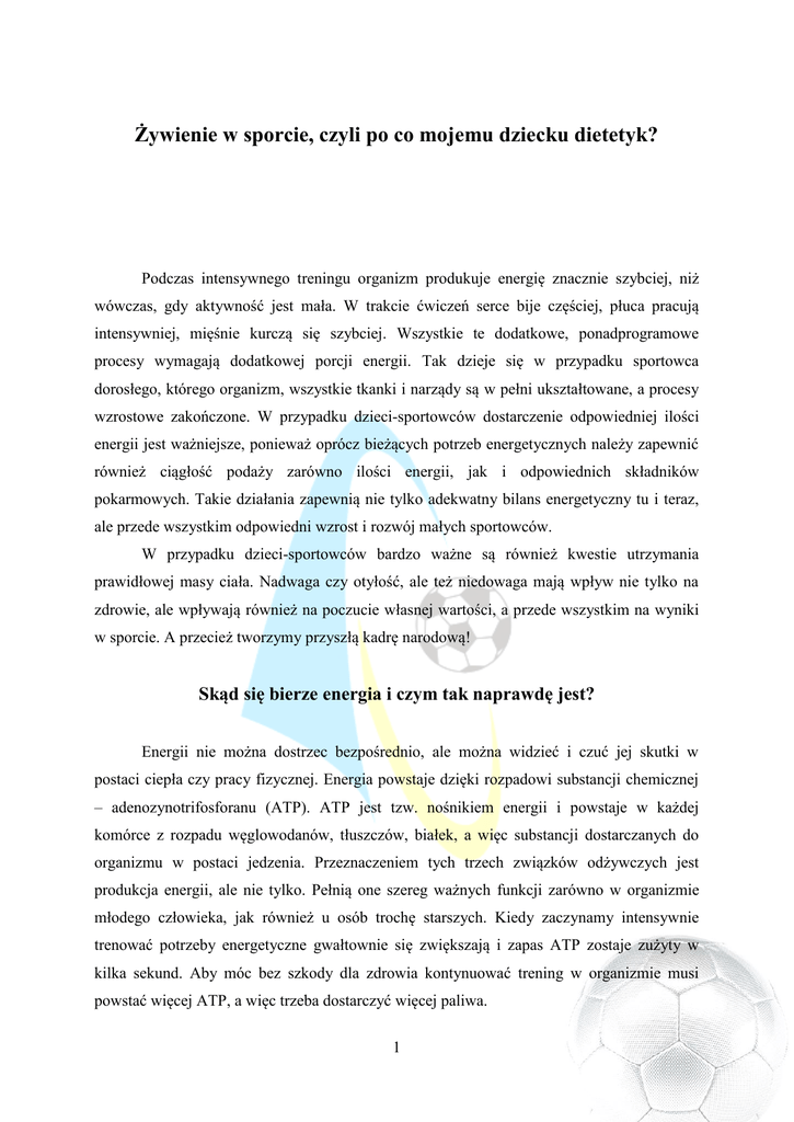 Żywienie w sporcie, czyli po co mojemu dziecku dietetyk? Podczas intensywnego treningu organizm produkuje energię znacznie szybciej, niż wówczas, gdy aktywność jest mała. W trakcie ćwiczeń serce bije częściej, płuca pracują intensywniej, mięśnie kurczą się szybciej. Wszystkie te dodatkowe, ponadprogramowe procesy wymagają dodatkowej porcji energii. Tak dzieje się w przypadku sportowca dorosłego, którego organizm, wszystkie tkanki i narządy są w pełni ukształtowane, a procesy wzrostowe zakończone. W przypadku dzieci-sportowców dostarczenie odpowiedniej ilości energii jest ważniejsze, ponieważ oprócz bieżących potrzeb energetycznych należy zapewnić również ciągłość podaży zarówno ilości energii, jak i odpowiednich składników pokarmowych. Takie działania zapewnią nie tylko adekwatny bilans energetyczny tu i teraz, ale przede wszystkim odpowiedni wzrost i rozwój małych sportowców. W przypadku dzieci-sportowców bardzo ważne są również kwestie utrzymania prawidłowej masy ciała. Nadwaga czy otyłość, ale też niedowaga mają wpływ nie tylko na zdrowie, ale wpływają również na poczucie własnej wartości, a przede wszystkim na wyniki w sporcie. A przecież tworzymy przyszłą kadrę narodową! Skąd się bierze energia i czym tak naprawdę jest? Energii nie można dostrzec bezpośrednio, ale można widzieć i czuć jej skutki w postaci ciepła czy pracy fizycznej. Energia powstaje dzięki rozpadowi substancji chemicznej – adenozynotrifosforanu (ATP). ATP jest tzw. nośnikiem energii i powstaje w każdej komórce z rozpadu węglowodanów, tłuszczów, białek, a więc substancji dostarczanych do organizmu w postaci jedzenia. Przeznaczeniem tych trzech związków odżywczych jest produkcja energii, ale nie tylko. Pełnią one szereg ważnych funkcji zarówno w organizmie młodego człowieka, jak również u osób trochę starszych. Kiedy zaczynamy intensywnie trenować potrzeby energetyczne gwałtownie się zwiększają i zapas ATP zostaje zużyty w kilka sekund. Aby móc bez szkody dla zdrowia kontynuować trening w organizmie musi powstać więcej ATP, a więc trzeba dostarczyć więcej paliwa. 1 Dlaczego różne produkty spożywcze dostarczają różnej ilości energii? Białka, tłuszcze i węglowodany różnią się wartością energetyczną – węglowodany, czyli pieczywo, kasze, makarony i chleb są zużywane głównie do produkcji energii w krótkim czasie, tłuszcze stanowią o zapasie energii na dłuższy czas. Białka są nośnikiem energii tylko w razie, gdy wyczerpują się zapasy, są źródłem awaryjnym. Każdy produkt żywieniowy dostarcza różnej ilości składników odżywczych (białek, tłuszczów i węglowodanów), każdy dostarcza zatem różnej ilości energii – 1 g węglowodanów i białek to 4 kcal, podczas gdy 1 gram tłuszczu to aż 9 kcal. Tłuszcze są najbardziej skondensowaną formą energii - zawierają ponad dwa razy tyle energii co białka, czy węglowodany. Nie jest to jednak najlepsza forma energii, jaką może przyjmować młody sportowiec. Podobnie jak dorośli, dzieci - sportowcy muszą stosować zbilansowaną dietę, jeśli chcą zachować dobre zdrowie i zapewnić odpowiedni wzrost i rozwój organizmu. Ilość kalorii, jakie powinny spożywać dzieci jest częściowo zależna od ich wieku, ale przede wszystkim od masy ciała. Poniższa tabela przedstawia orientacyjne dane na temat kaloryczności dziennej racji pokarmowej aktywnych fizycznie dzieci. Masa ciała Podstawowa Poziom aktywności fizycznej (kg) Przemiana 1,6 1,8 2,0 Materii (ćwiczenia (ćwiczenia (ćwiczenia (kcal/dzień) umiarkowane) umiarkowanie intensywne) intensywne) Chłopcy 30 1189 1914 2153 2368 35 1278 2057 2297 2559 40 1366 2177 2464 2727 45 1455 2320 2632 2919 50 1543 2464 2775 3086 55 1632 2608 2943 3253 60 1720 2751 3086 3445 Masa ciała Podstawowa Poziom aktywności fizycznej 2 (kg) Przemiana 1,6 1,8 2,0 Materii (ćwiczenia (ćwiczenia (ćwiczenia (kcal/dzień) umiarkowane) umiarkowanie intensywne) intensywne) Dziewczęta 30 1095 1746 1962 2201 35 1163 1866 2081 2321 40 1229 1962 2001 2464 45 1297 2081 2344 2584 50 1364 2177 2464 2727 55 1430 2297 2584 2871 60 1498 2392 2703 2990 Departament zdrowia, Dietary reference values for ford energy and nutrient for the Unitek Kingom, Londym: HMSO (1991) Jak młodzi sportowcy spalają kalorie? Odpowiedź jest prosta - inaczej niż dorośli. Osoby dorosłe oraz młodzież podczas wysiłku fizycznego zużywają stosunkowo mniej tłuszczów, a więcej węglowodanów, odwrotna sytuacja następuje u trenujących dzieci – zużywają one więcej tłuszczów, a mniej węglowodanów. BIAŁKO Białko jest bardzo ważnym składnikiem odżywczym w diecie każdego dziecka. Młody organizm wciąż rośnie i rozwija się, dlatego potrzebuje więcej protein w stosunku do masy ciała, niż osoby dorosłe. Większość dzieci powinna otrzymywać około 1 g białek na kilogram masy ciała, dla porównania podaż białka dla osoby dorosłej wynosi 0,75 g na kilogram masy ciała. Dla przykładu dziecko o masie ciała 40 kg powinno dziennie spożyć 40 gramów białek. Taka wartość protein jest odpowiednia dla dzieci umiarkowanie aktywnych. Podczas intensywnych treningów młodzi sportowcy mogą potrzebować nawet 1,1 – 1,2 gramów białek na kilogram masy ciała na dobę. 3 Jak zapewnić dziecku taką ilość białka? Poprzez włączenie do codziennej racji pokarmowej 2-4 porcji produktów zawierających proteiny, a więc mięsa (najlepiej drób, ewentualnie wołowina), ryb (również tłustych ze względu na występujące w nich kwasy tłuszczowe), roślin strączkowych (groch, fasola, soja, soczewica, ciecierzyca), orzechów, jaj (najlepsze jakościowo białko występujące w przyrodzie!), nabiału, a więc mleka i wszelkich jego przetworów (sery, jogurty, kefiry, maślanki, - należy zwrócić uwagę na dosładzanie tego typu produktów, najlepiej wybierać jogurty i kefiry naturaln