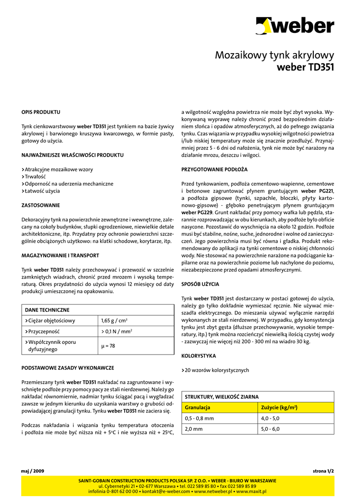 Mozaikowy tynk akrylowy weber TD351 Opis produktu Tynk cienkowarstwowy weber TD351 jest tynkiem na bazie żywicy akrylowej i barwionego kruszywa kwarcowego, w formie pasty, gotowy do użycia. Najważniejsze właściwości produktu >>Atrakcyjne mozaikowe wzory >>Trwałość >>Odporność na uderzenia mechaniczne >>Łatwość użycia Zastosowanie Dekoracyjny tynk na powierzchnie zewnętrzne i wewnętrzne, zalecany na cokoły budynków, słupki ogrodzeniowe, niewielkie detale architektoniczne, itp. Przydatny przy ochronie powierzchni szczególnie obciążonych użytkowo: na klatki schodowe, korytarze, itp. Magazynowanie i transport Tynk weber TD351 należy przechowywać i przewozić w szczelnie zamkniętych wiadrach, chronić przed mrozem i wysoką temperaturą. Okres przydatności do użycia wynosi 12 miesięcy od daty produkcji umieszczonej na opakowaniu. Dane techniczne >>Ciężar objętościowy 1,65 g / cm3 >>Przyczepność > 0,1 N / mm2 >>Współczynnik oporu dyfuzyjnego μ = 78 a wilgotność względna powietrza nie może być zbyt wysoka. Wykonywaną wyprawę należy chronić przed bezpośrednim działaniem słońca i opadów atmosferycznych, aż do pełnego związania tynku. Czas wiązania w przypadku wysokiej wilgotności powietrza i/lub niskiej temperatury może się znacznie przedłużyć. Przynajmniej przez 5 - 6 dni od nałożenia, tynk nie może być narażony na działanie mrozu, deszczu i wilgoci. Przygotowanie podłoża Przed tynkowaniem, podłoża cementowo-wapienne, cementowe i betonowe zagruntować płynem gruntującym weber PG221, a podłoża gipsowe (tynki, szpachle, bloczki, płyty kartonowo-gipsowe) - głęboko penetrującym płynem gruntującym weber PG229. Grunt nakładać przy pomocy wałka lub pędzla, starannie rozprowadzając w obu kierunkach, aby podłoże było obficie nasycone. Pozostawić do wyschnięcia na około 12 godzin. Podłoże musi być stabilne, nośne, suche, jednorodne i wolne od zanieczyszczeń. Jego powierzchnia musi być równa i gładka. Produkt rekomendowany do aplikacji na tynki cementowe o niskiej chłonności wody. Nie stosować na powierzchnie narażone na podciąganie kapilarne oraz na powierzchnie poziome lub nachylone do poziomu, niezabezpieczone przed opadami atmosferycznymi. Sposób użycia Tynk weber TD351 jest dostarczany w postaci gotowej do użycia, należy go tylko dokładnie wymieszać ręcznie. Nie używać mieszadła elektrycznego. Do mieszania używać wyłącznie narzędzi wykonanych ze stali nierdzewnej. W przypadku, gdy konsystencja tynku jest zbyt gęsta (dłuższe przechowywanie, wysokie temperatury, itp.) tynk można rozcieńczyć niewielką ilością czystej wody - zazwyczaj nie więcej niż 200 - 300 ml na wiadro 30 kg. Kolorystyka Podstawowe zasady wykonawcze Przemieszany tynk weber TD351 nakładać na zagruntowane i wyschnięte podłoże przy pomocy pacy ze stali nierdzewnej. Należy go nakładać równomiernie, nadmiar tynku ściągać pacą i wygładzać zawsze w jednym kierunku do uzyskania warstwy o grubości odpowiadającej granulacji tynku. Tynku weber TD351 nie zaciera się. Podczas nakładania i wiązania tynku temperatura otoczenia i podłoża nie może być niższa niż + 5oC i nie wyższa niż + 25oC, >>20 wzorów kolorystycznych Struktury, wielkość ziarna Granulacja Zużycie (kg/m2) 0,5 - 0,8 mm 4,0 - 5,0 2,0 mm 5,0 - 6,0 maj / 2009 strona 1/2 Saint-Gobain Construction Products Polska Sp. z o.o. • Weber - Biuro w Warszawie ul. Cybernetyki 21 • 02-677 Warszawa • tel. 022 589 85 80 • fax 022 589 85 89 infolinia 0-801 62 00 00 • [email protected] • www.netweber.pl • www.maxit.pl Mozaikowy tynk akrylowy weber TD351 Uwagi się z Działem Technicznym Weber. Wraz z ukazaniem się tej karty technicznej tracą ważność karty wcześniejsze. Po wygładzeniu na powierzchni pojawi się mleczny nalot, który po pewnym czasie zaniknie. Pod wpływem dużej wilgotności (deszcz, mgła) może pojawić się ponownie, lecz z czasem zniknie całkowicie. Jest to zjawisko naturalne dla tego materiału. Producent gwarantuje jakość wyrobu, lecz nie ma wpływu na sposób jego zastosowania. Przedstawione informacje nie mogą zastąpić fachowego przygotowania wykonawcy i nie zwalniają go ze stosowania się do zasad sztuki budowlanej i BHP. W przypadku wątpliwości zaleca się wykonać własne próby lub skontaktować Opakowanie >>wiadro 15 i 30 kg >>paleta - 480 kg >>Atest higieniczny 200/PB/251/290/2003 >>Aprobata techniczna AT-15-3062/2007 >>Certyfikat Zakładowej Kontroli Produkcji maj / 2009 strona 2/2 Saint-Gobain Construction Products Polska Sp. z o.o. • Weber - Biuro w Warszawie ul. Cybernetyki 21 • 02-677 Warszawa • tel. 022 589 85 80 • fax 022 589 85 89 infolinia 0-801 62 00 00 • [email protected] • www.netweber.pl • www.maxit.pl