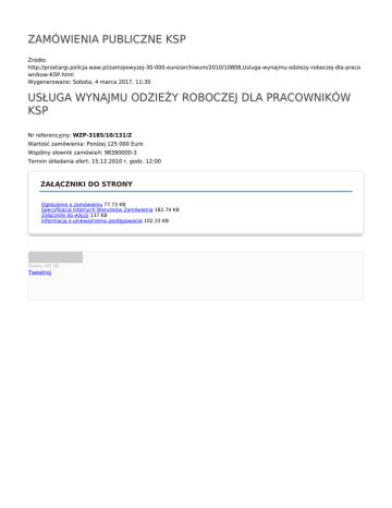 ZAMÓWIENIA PUBLICZNE KSP Źródło: http://przetargi.policja.waw.pl/zam/powyzej-30-000-euro/archiwum/2010/10808,Usluga-wynajmu-odziezy-roboczej-dla-praco wnikow-KSP.html Wygenerowano: Sobota, 4 marca 2017, 11:30 USŁUGA WYNAJMU ODZIEŻY ROBOCZEJ DLA PRACOWNIKÓW KSP Nr referencyjny: WZP-3185/10/131/Z Wartość zamówienia: Poniżej 125 000 Euro Wspólny słownik zamówień: 98390000-3 Termin składania ofert: 15.12.2010 r. godz. 12:00 ZAŁĄCZNIKI DO STRONY Ogłoszenie o zamówieniu 77.73 KB Specyfikacja Istotnych Warunków Zamówienia 182.74 KB Załączniki do edycji 137 KB Informacja o unieważnieniu postępowania 102.33 KB Ocena: 0/5 (0) Tweetnij