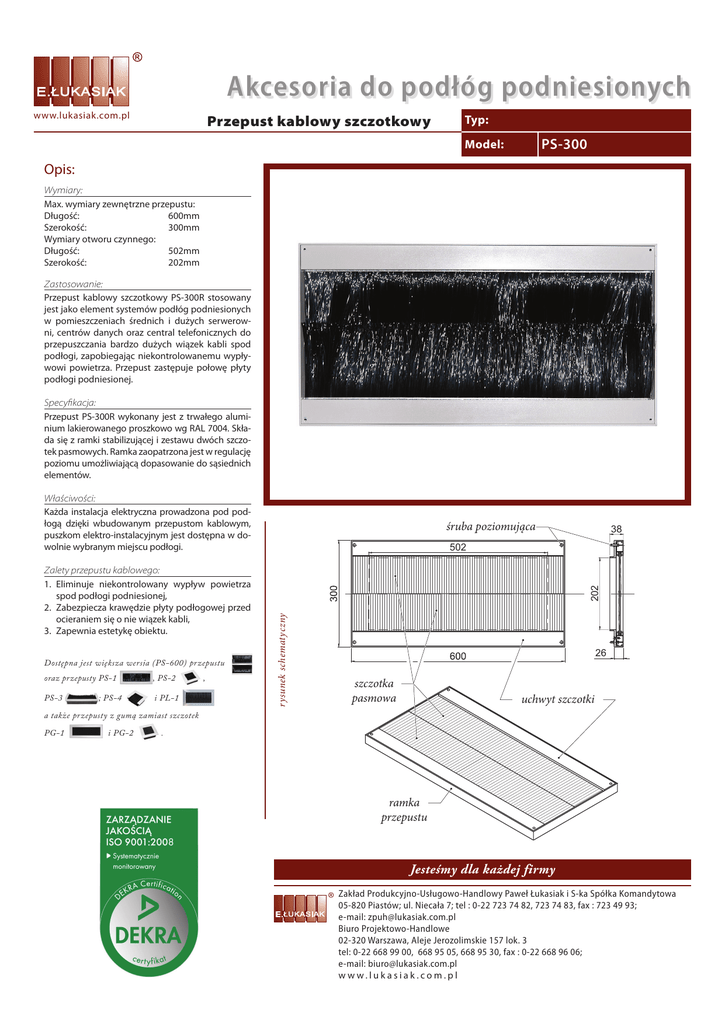 Akcesoria do podłóg podniesionych www.lukasiak.com.pl Przepust kablowy szczotkowy Typ: PS-300 Model: Opis: Wymiary: Max. wymiary zewnętrzne przepustu: Długość:600mm Szerokość:300mm Wymiary otworu czynnego: Długość:502mm Szerokość:202mm Zastosowanie: Przepust kablowy szczotkowy PS-300R stosowany jest jako element systemów podłóg podniesionych w pomieszczeniach średnich i dużych serwerowni, centrów danych oraz central telefonicznych do przepuszczania bardzo dużych wiązek kabli spod podłogi, zapobiegając niekontrolowanemu wypływowi powietrza. Przepust zastępuje połowę płyty podłogi podniesionej. Specyfikacja: Przepust PS-300R wykonany jest z trwałego aluminium lakierowanego proszkowo wg RAL 7004. Składa się z ramki stabilizującej i zestawu dwóch szczotek pasmowych. Ramka zaopatrzona jest w regulację poziomu umożliwiającą dopasowanie do sąsiednich elementów. Właściwości: Każda instalacja elektryczna prowadzona pod podłogą dzięki wbudowanym przepustom kablowym, puszkom elektro-instalacyjnym jest dostępna w dowolnie wybranym miejscu podłogi. Dostępna jest większa wersja (PS-600) przepustu oraz przepusty PS-1 PS-3 ; PS-4 , PS-2 i PL-1 , 38 202 502 rysunek schematyczny Zalety przepustu kablowego: 1. Eliminuje niekontrolowany wypływ powietrza spod podłogi podniesionej, 2. Zabezpiecza krawędzie płyty podłogowej przed ocieraniem się o nie wiązek kabli, 3. Zapewnia estetykę obiektu. śruba poziomująca 26 szczotka pasmowa uchwyt szczotki a także przepusty z gumą zamiast szczotek PG-1 i PG-2 . ramka przepustu Jesteśmy dla każdej firmy Zakład Produkcyjno-Usługowo-Handlowy Paweł Łukasiak i S-ka Spółka Komandytowa 05-820 Piastów; ul. Niecała 7; tel : 0-22 723 74 82, 723 74 83, fax : 723 49 93; e-mail: [email protected] Biuro Projektowo-Handlowe 02-320 Warszawa, Aleje Jerozolimskie 157 lok. 3 tel: 0-22 668 99 00, 668 95 05, 668 95 30, fax : 0-22 668 96 06; e-mail: [email protected] w w w.luk asiak .com.pl