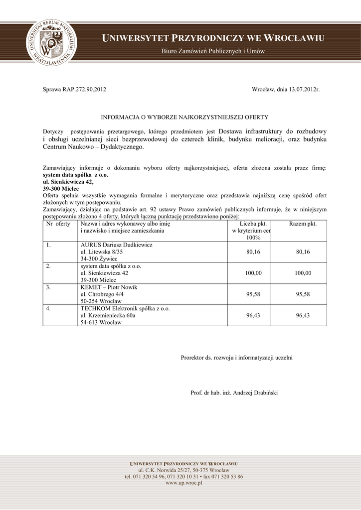 UNIWERSYTET PRZYRODNICZY WE WROCŁAWIU Biuro Zamówień Publicznych i Umów Sprawa RAP.272.90.2012 Wrocław, dnia 13.07.2012r. INFORMACJA O WYBORZE NAJKORZYSTNIEJSZEJ OFERTY postępowania przetargowego, którego przedmiotem jest Dostawa infrastruktury do rozbudowy i obsługi uczelnianej sieci bezprzewodowej do czterech klinik, budynku melioracji, oraz budynku Centrum Naukowo – Dydaktycznego. Dotyczy Zamawiający informuje o dokonaniu wyboru oferty najkorzystniejszej, oferta złożona została przez firmę: system data spółka z o.o. ul. Sienkiewicza 42, 39-300 Mielec Oferta spełnia wszystkie wymagania formalne i merytoryczne oraz przedstawia najniższą cenę spośród ofert złożonych w tym postępowaniu. Zamawiający, działając na podstawie art. 92 ustawy Prawo zamówień publicznych informuje, że w niniejszym postępowaniu złożono 4 oferty, których łączną punktację przedstawiono poniżej: Razem pkt. Nr oferty Nazwa i adres wykonawcy albo imię Liczba pkt. w kryterium cena i nazwisko i miejsce zamieszkania 100% 1. AURUS Dariusz Dudkiewicz ul. Litewska 8/35 80,16 80,16 34-300 Żywiec 2. system data spółka z o.o. ul. Sienkiewicza 42 100,00 100,00 39-300 Mielec 3. KEMET – Piotr Nowik ul. Chrobrego 4/4 95,58 95,58 50-254 Wrocław 4. TECHKOM Elektronik spółka z o.o. ul. Krzemieniecka 60a 96,43 96,43 54-613 Wrocław Prorektor ds. rozwoju i informatyzacji uczelni Prof. dr hab. inż. Andrzej Drabiński UNIWERSYTET PRZYRODNICZY WE WROCŁAWIU ul. C.K. Norwida 25/27, 50-375 Wrocław tel. 071 320 54 96, 071 320 10 31 • fax 071 320 53 86 www.up.wroc.pl