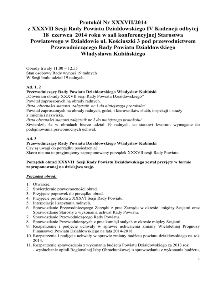 Protokołu Nr XXXVII - Starostwo Powiatowe w Działdowie