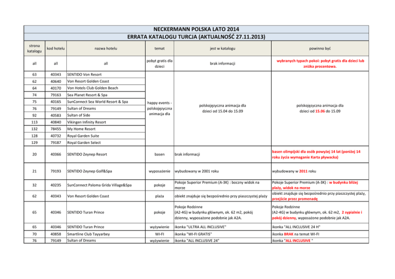 NECKERMANN POLSKA LATO 2014 ERRATA KATALOGU TURCJA (AKTUALNOŚĆ 27.11.2013) strona katalogu kod hotelu nazwa hotelu temat jest w katalogu powinno być all all all pobyt gratis dla dzieci brak informacji wybranych typach pokoi: pobyt gratis dla dzieci lub zniżka procentowa. 63 40343 SENTIDO Von Resort 62 40640 Von Resort Golden Coast 64 40170 Von Hotels Club Golden Beach 74 79163 Sea Planet Resort & Spa 75 40165 SunConnect Sea World Resort & Spa 76 79149 Sultan of Dreams happy events polskojęzyczna animacja dla polskojęzyczna animacja dla dzieci od 15.04 do 15.09 polskojęzyczna animacja dla dzieci od 15.06 do 15.09 92 40583 Sultan of Side 113 40840 Vikingen Infinity Resort 132 78455 My Home Resort 128 40732 Royal Garden Suite 129 79187 Royal Garden Select 20 40366 SENTIDO Zeynep Resort 21 79193 SENTIDO Zeynep Golf&Spa 32 40235 SunConnect Paloma Grida Village&Spa 62 40343 Von Resort Golden Coast 65 40346 SENTIDO Turan Prince pokoje 65 40346 SENTIDO Turan Prince wyżywienie 70 40858 Smartline Club Tayyarbey 76 79149 Sultan of Dreams basen wyposażenie pokoje plaża WI-FI wyżywienie brak informacji basen olimpijski dla osób powyżej 14 lat (poniżej 14 roku życia wymaganie Karta pływacka) wybudowany w 2001 roku wybudowany w 2011 roku Pokoje Superior Premium (A-3K) : boczny widok na morze Pokoje Superior Premium (A-3K) : w budynku bliżej plaży, widok na morze obiekt znajduje się bezpośrednio przy piaszczystej plaży, przejście przez promenadę obiekt znajduje się bezpośrednio przy piaszczystej plaży Pokoje Rodzinne (A2-4G) w budynku głównym, ok. 62 m2, pokój dzienny, wyposażone podobnie jak A2A. Pokoje Rodzinne (A2-4G) w budynku głównym, ok. 62 m2, 2 sypialnie i pokój dzienny, wyposażone podobnie jak A2A. ikonka "ULTRA ALL INCLUSIVE" ikonka "ALL INCLUSIVE 24 H" ikonka "WI-FI GRATIS" ikonka BRAK na temat WI-FI ikonka "ALL INCLUSIVE 24" ikonka "ALL INCLUSIVE " 76 79149 Sultan of Dreams Napoje bezalkoholowe i alkoholowe lokalne dostępne są bezpłatnie przez całą dobę w lobby barze. Napoje bezalkoholowe i alkoholowe lokalne dostępne są od 10:00 do 24:00 92 40583 Sultan of Side Napoje bezalkoholowe i alkoholowe lokalne dostępne są bezpłatnie przez całą dobę w lobby barze. Napoje bezalkoholowe i alkoholowe lokalne dostępne są od 10:00 do 24:00 92 40583 Sultan of Side wyżywienie 103 40625 SENTIDO Golden Bay wyżywienie 113 40840 Vikingen Infinity Resort plaża 115 40840 Vikingen Quality plaża 119 40115 Yalihan ikonka "ALL INCLUSIVE 24" Napoje bezalkoholowe i alkoholowe lokalne dostępne są bezpłatnie przez całą dobę w lobby barze. Po godz. 24 wszystkie napoje w lobby barze płatne. obiekt znajduje się ok. 350 m od piaszczysto– żwirowej plaży obiekt znajduje się ok. 350 m od piaszczysto– żwirowej plaży DNI GRATIS: 21=18, 14=12, 7=6 w terminach 13.05.20.05.13, 23.10.-31.10.13. ikonka "ALL INCLUSIVE " Napoje bezalkoholowe i alkoholowe lokalne dostępne są bezpłatnie przez całą dobę w lobby barze. Po godz. 24 wszystkie napoje w lobby barze płatne. obiekt znajduje się ok. 200 m od piaszczysto– żwirowej plaży obiekt znajduje się bezpośrednio przy piaszczysto– żwirowej plaży DNI GRATIS: 21=18, 14=12, 7=6 w terminach 13.05.20.05.14, 23.10.-31.10.14. 132 78455 My Home Resort bar na plaży bezpłatny bar na plaży bezpłatny , napoje alkoholowe płatne dni gratis bar na plaży