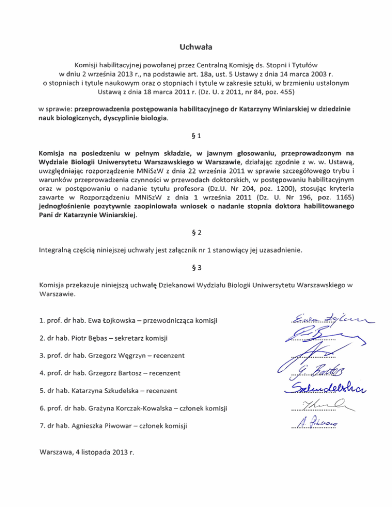 Uchwata Komisji habilitacyjnej powoianej przez Centralnq Komisjq ds. Stopni i Tytutow w dniu 2 wrzeinia 2013 r., na podstawie art. 18a, ust. 5 Ustawy z dnia 14 marca 2003 r. o stopniach i tytule naukowym oraz o stopniach i tytule w zakresie sztuki, w brzmieniu ustalonym Ustawq z dnia 18 marca 2011 r. (Dz. U. z 2011, nr 84, poz. 455) w sprawie: przeprowadzenia postqpowania habilitacyjnego dr Katarzyny Winiarskiej w dziedzinie nauk biologicznych, dyscyplinie biologia. Komisja na posiedzeniu w petnym sktadzie, w jawnym gtosowaniu, przeprowadzonym na Wydziale Biologii Uniwersytetu Warszawskiego w Warszawie, dziaiajqc zgodnie z w. w. Ustawq, uwzglqdniajqc rozporzqdzenie MNiSzW z dnia 22 wrzeinia 2011 w sprawie szczegotowego trybu i warunkow przeprowadzenia czynnoici w przewodach doktorskich, w postqpowaniu habilitacyjnym oraz w postqpowaniu o nadanie tytutu profesora (Dz.U. Nr 204, poz. 1200), stosujqc kryteria zawarte w Rozporzqdzeniu MNiSzW z dnia 1 wrzeinia 2011 (Dz. U. Nr 196, poz. 1165) jednogtojnienie pozytywnie zaopiniowata wniosek o nadanie stopnia doktora habilitowanego Pani' dr Katarzynie Winiarskiej. lntegralnq czeiciq niniejszej uchwaty jest zatqcznik nr 1stanowiqcy jej uzasadnienie. Komisja przekazuje niniejszq uchwaiq Dziekanowi Wydziaiu Biologii Uniwersytetu Warszawskiego w Warszawie. 1.prof. dr hab. Ewa tojkowska - przewodniczqca komisji 2. dr hab. Piotr Bqbas - sekretarz komisji 3. prof. dr hab. Grzegorz Wqgrzyn - recenzent 4. prof. dr hab. Grzegorz Bartosz - recenzent 5. dr hab. Katarzyna Szkudelska - recenzent 6. prof. dr hab. Grazyna Korczak-Kowalska- cztonek komisji 7. dr hab. Agnieszka Piwowar - czionek komisji Warszawa, 4 listopada 2013 r. Zatqcznik nr 1. Do Uchwaty podjqtej przez Komisjq Habilitacyjnq powotanq w dniu 2 wrzeinia 2013 roku, przez Centralnq Komisjq do Spraw Sto'pni i Tytutow Naukowych w celu przeprowadzenia postqpowania o nadanie dr Katarzynie Winiarskiej doktora habilitowanego nauk biologicznych w dyscyplinie biologia. Svlwetka Habilitantki Dr Katarzyna Winiarska ukonczyta studia magisterskie na Wydziale Biologii Uniwersytetu Warszawskiego w 1997 roku. W latach 1997-1998 pracowata na stanowisku asystenta w Zaktadzie Regulacji Metabolizmu, lnstytutu Biochemii UW, gdzie przez kolejne 5 byta doktorantkq. Pracq doktorskq o tytule "Zaleinoid miqdzy syntezq glukozy a stanem zredukowania glutationu w kanalikach kory nerki krolika" wykonata pod kierownictwem Pani prof. dr hab. Jadwigi Bryty i obronita jq z sukcesem w 2003 roku. Wkrotce po obronie rozprawy doktorskiej zostata zatrudniona w macierzystym Zaktadzie na stanowisku adiunkta, ktore zajmuje do dnia dzisiejszego. Ocena dorobku naukowego Cztonkowie komisji pozytywnie ocenili dorobek naukowy dr Katarzyny Winiarskiej. Jest ona wspotautorkq 18 publikacji naukowych, z ktorych 14 ukazato siq w czasopismach z listy JCR, a 4 w czasopismach polskojqzycznych nie uwzglqdnionych w bazie JCR. Po obronie rozprawy doktorskiej opublikowata 12 prac, w tym 10 z listy JCR oraz 2 prace w jqzyku polskim, ktore majq charakter publikacji przeglqdowych. Prace z Jej wspotautorstwem publikowane byty w dobrych czasopismach, jak Journal of Pineal Research oraz Biochimie. tqcznie publikacje dr Katarzyny Winiarskiej osiqgajq sumaryczny IF 35,274. Liczba cytowan tych prac wynosi 193, a bez autocytowan 167. lndeks Hirscha osiqgniqd Habilitantki wynosi 8, przy iredniej liczbie 12,47 cytowan na publikacjq. Listq dokonan naukowych dr Winiarskiej dopetnia 15 komunikatow zjazdowych (6 na konferencjach miqdzynarodowych i 9 na krajowych), z ktorych tylko jeden miat formq referatu wygtoszonego przez Habilitantkq. str. 116 Badania dr Katarzyny Winiarskiej koncentrujq sie na obszarze biochemii i moiliwoici wykorzystania antyoksydantow w terapii cukrzycy. W swoich pracach podejmowata probq oceny potencjalnej uiytecznoici wybranych antyoksydantow we wspomaganiu leczenia cukrzycy i nefropatii cukrzycowych. Wyniki uzyskane przez dr Winiarkq (oraz wspotpracujqce z Nip Osoby) sugerujq, ze strategia taka moie przynieid okreilone korzyici terapeutyczne. Wykazata, i e stosujqc egzogenne antyoksydanty, mozna wydatnie zwiqkszyC zawartojC i stan zredukowania glutationu, najwainiejszego drobnoczqsteczkowego przeciwutleniacza w komorkach ssakow, ktorego homeostaza jest drastycznie zaburzona w warunkach stresu oksydacyjnego, towarzyszqcego cukrzycy. Wykazata, i e korzystne dziatanie mogq przejawiai te spojrod przeciwutleniaczy, ktore wtaiciwoici antyoksydacyjne tqczq z dziataniem hipoglikemizujqcym. Sformutowata hipoteze wg ktorej najwieksze nadzieje terapeutyczne powinny byC wiqzane z ograniczeniem wytwarzania reaktywnych form tlenu w organizmie, np. w wyniku selektywnego zahamowania aktywnojci oksydazy NADPH. Wyniki badah Habilitantki z zastosowaniem inhibitora oksydazy NADPH dostarczyty przekonywajqcych przestanek wskazujqcych na wainq rolq reaktywnych form tlenu w regulacji wytwarzania glukozy przez nerki. Obserwacja ta wydaje sic tym istotniejsza, i e mechanizmy regulujqce proces glukoneogenezy, zachodzqcej w tych narzqdach, wciqi nie sq dostatecznie poznane. SpojnoiC problematyki wszystkich prac wskazujq, i e Habilitantka byta nie tylko wykonawcq doiwiadczen oraz obserwacji, ale uczestniczyta w formutowaniu koncepcji badan i przygotowaniu tekstow publikacji. Wszyscy cztonkowie komisji uznali dorobek naukowy dr Katarzyny Winiarskiej za dobry i wystarczajqcy do ubiegania siq o nadanie Jej stopnia naukowego doktora habilitowanego. Wartoiciujaca ocena osiagniecia naukowego Kandvdatki stanowiacego wktad w rozwoi dvscvplinv Jako osiqgniqcie naukowe dr Katarzyna Winiarska przedstawita 4 prace, opatrzone wspolnym tytutem " Ocena uiytecznoici antyoksydantow w terapii cukrzycy". Pan prof. dr hab. Grzegorz Bartosz sugeruje, i e ,,... tutut osiqgniqcia naukowego jest niezbyt wtaiciwy". Pan Profesor zaznacza, i e badania prowadzone przez Habilitantkq wykonywane byty na zwierzetach, podczas gdy tytut osiqgniqcia wskazuje na ich kliniczny charakter. Prace te str. 216 zo