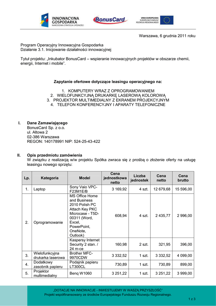 Warszawa, 6 grudnia 2011 roku Program Operacyjny Innowacyjna Gospodarka Działanie 3.1. Inicjowanie działalności innowacyjnej Tytuł projektu: „Inkubator BonusCard – wspieranie innowacyjnych projektów w obszarze chemii, energii, Internet i mobile”. Zapytanie ofertowe dotyczące leasingu operacyjnego na: 1. KOMPUTERY WRAZ Z OPROGRAMOWANIEM 2. WIELOFUNKCYJNĄ DRUKARKĘ LASEROWĄ KOLOROWĄ 3. PROJEKTOR MULTIMEDIALNY Z EKRANEM PROJEKCYJNYM 4. TELEFON KONFERENCYJNY I APARATY TELEFONICZNE I. Dane Zamawiającego BonusCard Sp. z o.o. ul. Altowa 2 02-386 Warszawa REGON: 140178991 NIP: 524-25-43-422 II. Opis przedmiotu zamówienia W związku z realizacją w/w projektu Spółka zwraca się z prośbą o złożenie oferty na usługę leasingu nowego sprzętu: Lp. 1. 2. 3. 4. 5. Kategoria Laptop Oprogramowanie Wielofunkcyjna drukarka laserowa Dodatkowy zasobnik papieru Projektor multimedialny Model Sony Vaio VPCF23M1E/B MS Office Home and Business 2010 Polish PC Attach Key PKC Microcase - T5D00311 (Word, Excel, PowerPoint, OneNote, Outlook) Kaspersy Internet Security 2 stan. / 24 m-ce Brother MFC9970CDW Podajnik papieru LT300CL Benq W1060 Cena jednostkowa netto Liczba jednostek 3 169,92 Cena netto Cena brutto 4 szt. 12 679,68 15 596,00 608,94 4 szt. 2 435,77 2 996,00 160,98 2 szt. 321,95 396,00 3 332,52 1 szt. 3 332,52 4 099,00 730,89 1 szt. 730,89 899,00 3 251,22 1 szt. 3 251,22 3 999,00 „DOTACJE NA INNOWACJE - INWESTUJEMY W WASZĄ PRZYSZŁOŚĆ” Projekt współfinansowany ze środków Europejskiego Funduszu Rozwoju Regionalnego. 1z3 6. Ekran projekcyjny 7. Telefon konferencyjny Aparat telefoniczny Razem 8. 1. 2. 3. 4. 5. 6. Reflecta CrystalLine 87716 Polycom SoundStation 2 Mid Siemens Gigaset A580IP 1 218,70 1 szt. 1218,7 1 499,00 2 113,01 1 szt. 2 113,01 2 599,00 202,44 4 szt. 809,76 996,00 26 893,50 33 079,00 Rodzaj Leasingu – operacyjny; Waluta – PLN; Okres Leasingu – 28 miesięcy, od grudnia 2011 r. do marca 2014 r.; Termin wpłaty początkowej – grudzień 2011 r.; Raty Leasingu – równe; Termin wykupu – nie wcześniej niż w kwietniu 2014 r.; III. 1. 2. 3. Warunki składania ofert Oferta powinna być przygotowana na załączonym formularzu. Zamawiający nie dopuszcza możliwości składania ofert częściowych. Wszelkie parametry określone przez Spółkę, mają charakter orientacyjny i informacyjny. Spółka nie odpowiada za prawidłowe skonfigurowanie oferty. IV. Kryteria oceny ofert Cena - 100%. V. Termin i miejsce składania ofert 1. Oferty należy składać w formie pisemnej na załączonym formularzu: a) na adres spółki: BonusCard Sp. z o.o. ul. Altowa 2 02-386 Warszawa b) lub wysłać na adres e-mail: [email protected] 2. Termin składania ofert mija dnia 09.12.2011. 3. Oferta powinna być ważna do dnia 30.12.2011. VI. Termin rozstrzygnięcia i forma informacji o wyborze najkorzystniejszej oferty 1. Najlepsza oferta zostanie wyłoniona do dnia 12.12.2011. 2. Wybór najkorzystniejszej oferty zostanie ogłoszony na stronie internetowej www.bonuscard.pl. VII. Kontakt Adres korespondencyjny: BonusCard Sp. z o.o. ul. Altowa 2 02-386 Warszawa e-mail: [email protected] „DOTACJE NA INNOWACJE - INWESTUJEMY W WASZĄ PRZYSZŁOŚĆ” Projekt współfinansowany ze środków Europejskiego Funduszu Rozwoju Regionalnego. 2z3 „DOTACJE NA INNOWACJE - INWESTUJEMY W WASZĄ PRZYSZŁOŚĆ” Projekt współfinansowany ze środków Europejskiego Funduszu Rozwoju Regionalnego. 3z3