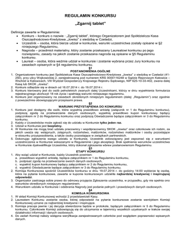 REGULAMIN KONKURSU „Zgarnij tablet” Definicje zawarte w Regulaminie: Konkurs – konkurs o nazwie : „Zgarnij tablet”, którego Organizatorem jest Spółdzielcza Kasa Oszczędnościowo-Kredytowa „Jowisz” z siedzibą w Czeladzi, Uczestnik – osoba, która bierze udział w konkursie, warunki uczestnictwa zostały opisane w §2 niniejszego Regulaminu, Nagroda – przedmiot materialny, który zostanie przekazany Laureatowi konkursu po jego rozwiązaniu, zasady na jakich zostanie przekazana nagroda są opisane w §5 Regulaminu konkursu. Laureat – osoba, która weźmie udział w konkursie i zostanie wybrana przez Jury konkursu na zasadach opisanych w §4 regulaminu konkursu. 1. 2. 3. 4. 1. 2. 3. 4. 5. 1. 2. 3. 4. 1. 2. 3. 4. §1 POSTANOWIENIA OGÓLNE Organizatorem konkursu jest Spółdzielcza Kasa Oszczędnościowo-Kredytowa „Jowisz” z siedzibą w Czeladzi (41250), przy ulicy Wojkowickiej 2, zarejestrowaną pod numerem KRS 0000116248 w Sądzie Rejonowym Katowice – Wschód w Katowicach, VIII Wydział Gospodarczy Krajowego Rejestru Sądowego, NIP 625-10-33-402, zwana dalej Kasą lub SKOK „Jowisz”. Konkurs odbędzie się w dniach od 16.07.2014 r. do 19.07.2014 r. Konkurs kierowany jest do osób pełnoletnich zwanych dalej Uczestnikami, którzy w dniu wypełnienia formularza rejestracyjnego ukończyli 18 rok życia i spełniają warunki niniejszego regulaminu. Konkurs jest organizowany na zasadach określonych niniejszym regulaminem (dalej: „Regulamin”) oraz zgodnie z powszechnie obowiązującymi przepisami prawa. §2 WARUNKI PRZYSTĄPIENIA DO KONKURSU Konkurs jest dostępny dla osób, które wypełnią prawidłowo ankietę (załącznik nr 1 do Regulaminu konkursu), podpiszą zgodę na przetwarzanie danych osobowych, wypełnią prawidłowo kupon konkursowy będący załącznikiem nr 2 do Regulaminu konkursu oraz podpiszą Oświadczenie będące załącznikiem nr 3 do Regulaminu konkursu. Każdy z Uczestników może zgłosić się do udziału w Konkursie tylko jeden raz. Udział w Konkursie jest bezpłatny. W Konkursie nie mogą brać udziału pracownicy i współpracownicy SKOK „Jowisz” oraz członkowie ich rodzin, za jakich uważa się: wstępnych, zstępnych, rodzeństwo, małżonków, rodzeństwo małżonków i osoby pozostające w stosunku przysposobienia, a także osoby pozostające w związkach partnerskich. Dokonując zgłoszenia swego udziału w Konkursie, Uczestnik zobowiązany jest zapoznać się z warunkami uczestniczenia w Konkursie wskazanymi w Regulaminie i jego akceptacji. Brak spełnienia warunków uczestnictwa w Konkursie dyskwalifikuje Uczestnika, który dokonał zgłoszenia wbrew postanowieniom Regulaminu. §3 ETAPY KONKURSU Aby wziąć udział w Konkursie, każdy Uczestnik powinien: a. prawidłowo wypełnić ankietę, będąca załącznikiem nr 1 do Regulaminu konkursu, b. podpisać zgodę na przetwarzanie swoich danych osobowych, c. wypełnić kupon konkursowy będący załącznikiem nr 2 do Regulaminu konkursu, d. wypełnić Oświadczenie będące załącznikiem nr 3 do Regulaminu konkursu. Komisja Konkursowa spośród Uczestników konkursu w dniu 19.07.2014 r. do godziny 14:00 wybierze tę osobę, która na pytanie konkursowe, zawarte w kuponie konkursowym udzieliła najbardziej kreatywnej i inspirującej odpowiedzi. Organizator zastrzega sobie prawo do odmowy przyjęcia Zgłoszenia uczestnika, w przypadku, gdy nie spełnia ono warunków określonych niniejszym regulaminem. Warunkiem udziału w Konkursie i odebrania Nagrody jest podanie pełnych i prawdziwych danych osobowych. §4 KOMISJA KONKURSOWA W skład Komisji Konkursowej wchodzi 2 przedstawicieli Kasy. Laureatem Konkursu zostanie osoba, której odpowiedź na pytanie konkursowe zostanie werdyktem Komisji Konkursowej uznane za najbardziej kreatywne i inspirujące. Komisja pracuje jawnie i jej decyzja stwierdzona będzie w protokole, będącym załącznikiem nr 5 do Regulaminu konkursu. Członkowie Komisji zobowiązują się do utrzymania w tajemnicy wszelkich uzyskanych w trakcie swojej działalności informacji i danych osobowych. Do zadań Komisji należy wstępna weryfikacja zarejestrowanych członków pod względem poprawności wpisanych danych. 5. Decyzja Komisji jest ostateczna i nie przysługuje od niej odwołanie. §5 NAGRODA 1. Fundatorem Nagrody jest SKOK „Jowisz”. W konkursie przewidziano Nagrodę w postaci tabletu multimedialnego „SAMSUNG GALAXY TAB 3” o wartości 399 PLN. 2. Warunkiem odbioru Nagrody jest podpisanie przez Laureata konkursu zgody na wykorzystanie wizerunku, będącej załącznikiem nr 7 do Regulaminu konkursu. 3. Laureat Konkursu ma prawo do otrzymania tylko jednej Nagrody, o której mowa powyżej. 4. Nagroda, o której mowa w § 5 ust. 1 nie podlega zamianie na inną nagrodę lub na jej równowartość pieniężną. 5. Uczestnik, któremu została przyznana Nagroda nie może przenieść praw do przyznanej mu Nagrody na osoby trzecie. 6. Uczestnik, któremu została przyznana nagroda, ma prawo zrzec się prawa do przyznanej mu Nagrody, składając organizatorowi stosowne oświadczenie na piśmie. 7. Organizator nie ponosi odpowiedzialności za brak możliwości przekazania nagrody uczestnikowi z przyczyn leżących po stronie uczestnika, w tym przypadku podania przez uczestnika błędnych lub nieprawdziwych danych osobowych lub niemożności skontaktowania się z Laureatem. 8. Nagroda zostanie Laureatowi przekazana osobiście po kontakcie telefonicznym i stawieniu się Laureata w dniach od 21.07.2014 r. do 25.07.2014 r. w oddziale Kasy Jowisz przy ul. Krakowskiej 98 w godzinach od 8:00 do 16:00. 9. Laureat, któremu została wręczona nagroda jest zobowiązany podpisać potwierdzenie odbioru nagrody, będące załącznikiem nr 4 do Regulaminu konkursu. 10. Laureat konkursu jest obowiązany zapłacić podatek w wysokości 10% od wartości nagrody, nie później niż w dniu wydania nagrody. Jest to warunek konieczny do odbioru nagrody. Odpowiedzialnym za