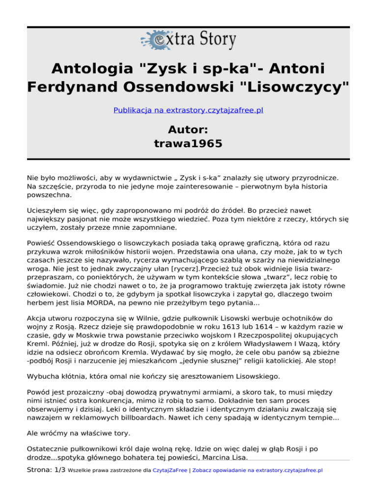 Antologia "Zysk i sp-ka"- Antoni Ferdynand Ossendowski "Lisowczycy" Publikacja na extrastory.czytajzafree.pl Autor: trawa1965 Nie było możliwości, aby w wydawnictwie „ Zysk i s-ka” znalazły się utwory przyrodnicze. Na szczęście, przyroda to nie jedyne moje zainteresowanie – pierwotnym była historia powszechna. Ucieszyłem się więc, gdy zaproponowano mi podróż do źródeł. Bo przecież nawet największy pasjonat nie może wszystkiego wiedzieć. Poza tym niektóre z rzeczy, których się uczyłem, zostały przeze mnie zapomniane. Powieść Ossendowskiego o lisowczykach posiada taką oprawę graficzną, która od razu przykuwa wzrok miłośników historii wojen. Przedstawia ona ułana, czy może, jak to w tych czasach jeszcze się nazywało, rycerza wymachującego szablą w szarży na niewidzialnego wroga. Nie jest to jednak zwyczajny ułan [rycerz].Przecież tuż obok widnieje lisia twarzprzepraszam, co poniektórych, że używam w tym kontekście słowa „twarz”, lecz robię to świadomie. Już nie chodzi nawet o to, że ja programowo traktuję zwierzęta jak istoty równe człowiekowi. Chodzi o to, że gdybym ja spotkał lisowczyka i zapytał go, dlaczego twoim herbem jest lisia MORDA, na pewno nie przeżyłbym tego pytania... Akcja utworu rozpoczyna się w Wilnie, gdzie pułkownik Lisowski werbuje ochotników do wojny z Rosją. Rzecz dzieje się prawdopodobnie w roku 1613 lub 1614 – w każdym razie w czasie, gdy w Moskwie trwa powstanie przeciwko wojskom I Rzeczpospolitej okupujących Kreml. Później, już w drodze do Rosji, spotyka się on z królem Władysławem I Wazą, który idzie na odsiecz obrońcom Kremla. Wydawać by się mogło, że cele obu panów są zbieżne -podbój Rosji i narzucenie jej mieszkańcom „jedynie słusznej” religii katolickiej. Ale stop! Wybucha kłótnia, która omal nie kończy się aresztowaniem Lisowskiego. Powód jest prozaiczny -obaj dowodzą prywatnymi armiami, a skoro tak, to musi między nimi istnieć ostra konkurencja, mimo iż robią to samo. Dokładnie ten sam proces obserwujemy i dzisiaj. Leki o identycznym składzie i identycznym działaniu zwalczają się nawzajem w reklamowych billboardach. Nawet ich ceny spadają w identycznym tempie... Ale wróćmy na właściwe tory. Ostatecznie pułkownikowi król daje wolną rękę. Idzie on więc dalej w głąb Rosji i po drodze...spotyka głównego bohatera tej powieści, Marcina Lisa. Strona: 1/3 Wszelkie prawa zastrzeżone dla CzytajZaFree | Zobacz opowiadanie na extrastory.czytajzafree.pl Dopiero od tego momentu rozpoczyna się właściwa akcja. Pan Marcin Lis jest, jak na owe czasy, wybitnym demokratą. Do swego wojska przyjmuje wszystkich bez różnicy stanu, wieku czy narodowości. W swym płomiennym przemówieniu podkreśla, że każdy służący w jego oddziale może zapisać się na kartach historii. Ale aby tak się stało, każdy musi wykazać się szaleńczą odwagą i pogardą śmierci. Być może z tego właśnie powodu nikt nigdy lisowczyków nie pokonał, choć wszystkie armie w tej części świata były w owym czasie prywatne. Lisowczycy bezkarnie grasowali więc po całej Rosji, docierając nawet nad rzekę Ob. Ich waleczność szła w parze z bezwzględnością i okrucieństwem, gdyż, w odróżnieniu od innych prywatnych armii, sami musieli postarać się o żołd. A to oznaczało konieczność rabunku. Pan Marcin Lis był aż do bólu wiarygodny w tym, co robił. Dwukrotnie został ciężko ranny na polu bitwy. A potem, w drodze powrotnej z Rosji, jak grom z jasnego nieba, spadła na niego miłość. I tym razem z jej powodu jeszcze raz znalazł się na granicy życia i śmierci. Zazdrosny rywal nie zamierzał się z nim o ukochaną pojedynkować, bo wiedział, że z silnym jak tur Marcinem nie ma szans. Dlatego nasłał na niego mordercę. To jednak tylko spowodowało oddalenie w czasie jego zguby. W uczciwym pojedynku, który nieuchronnie się odbył, pan Marcin szybko rozpłatał mu czaszkę. Ostatnią wygraną batalią pana Marcina był proces sądowy, w którym musiał udowodnić, że nie zabił swego przeciwnika z premedytacją. Antoni Ferdynand Ossendowski był potomkiem lisowczyków. Mimo iż żył w okresie międzywojennym, nadal kipiała w nim sarmacka krew. Swój utwór napisał więc w języku, który ze współczesną polszczyzną nie miał nic wspólnego. Należałoby ten język nazwać językiem sarmackim. Łączył on w sobie elementy języka staropolskiego, ruskiego i łaciny. Gdyby nie liczne przypisy, niewiele bym z niego rozumiał. Analogie tego utworu z „Trylogią” Sienkiewicza, a zwłaszcza z „ Panem Wołodyjowskim”, narzucają się same. Język obu utworów jest identyczny, bardzo zbliżone są też ideały wyznawane przez głównych bohaterów. Zasadnicze różnice między obu tymi utworami wynikają z odmienności opisywanych epok. W odróżnieniu od „ Trylogii” Sienkiewicza, „Lisowczycy” opisują I Rzeczpospolitą jako triumfujące imperium, przed którym klękała cała ówczesna Europa. Główni bohaterowie tego utworu walczą nie dlatego, że muszą bronić Ojczyzny, ale dlatego, że CHCĄ to robić. Walka sprawia im przyjemność, jest ich pasją, bez której nie potrafią żyć. Z tego powodu dochodzi do paradoksu: oddział Marcina Lisa morduje rdzennych Sybiraków, którzy dopiero co dostali się pod moskiewskie jarzmo! Utwór Ossendowskiego, mimo iż opisuje zamierzchłe czasy, nic nie stracił ze swojej aktualności. Również i dziś na podobnych zasadach działają prywatne armie. A jest ich wiele- począwszy od słynnej Legii Cudzoziemskiej a na Hesbollahu kończąc. Akcja tego historyczno – przygodowego utworu początkowo rozwija się niemrawo. Dopiero gdy na scenie pojawia się Marcin Lis, ulega gwałtownemu przyspieszeniu. Od tej pory liczne sceny batalistyczne z nawiązką wynagradzają miłośnikom mocnych wrażeń niemalże Strona: 2/3 Wszelkie prawa zastrzeżone dla CzytajZaFree | Zobacz opow