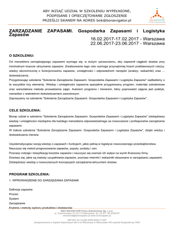 ZARZĄDZANIE Zapasów ZAPASAMI. Gospodarka Zapasami i Logistyka 16.02.2017-17.02.2017 - Warszawa 22.06.2017-23.06.2017 - Warszawa O SZKOLENIU: Od menedżera zarządzającego zapasami wymaga się, w dużym uproszczeniu, aby zapewnił ciągłość dostaw przy minimalnym koszcie utrzymania zapasów. Zrealizowanie tego celu wymaga przynajmniej trzech podstawowych rzeczy: wiedzy ekonomicznej o funkcjonowaniu zapasów, umiejętności i odpowiednich narzędzi (analizy, wskaźniki) oraz ... doświadczenia. Przygotowując szkolenie "Szkolenie Zarządzanie Zapasami. Gospodarka Zapasami i Logistyka Zapasów" zadbaliśmy o te wszystkie trzy elementy. Wiedzę i umiejętności zapewnia specjalnie przygotowany program, materiały szkoleniowe oraz warsztatowa metoda prowadzenia zajęć. Autorem programu i trenerem, który poprowadzi zajęcia jest praktyk, menedżer z wieloletnim doświadczeniem zawodowym. Zapraszamy na szkolenie "Szkolenie Zarządzanie Zapasami. Gospodarka Zapasami i Logistyka Zapasów" . CELE SZKOLENIA: Biorąc udział w szkoleniu "Szkolenie Zarządzanie Zapasami. Gospodarka Zapasami i Logistyka Zapasów" zdobędziesz wiedzę i umiejętności niezbędne dla każdego menedżera odpowiedzialnego za nowoczesne i profesjonalne zarządzanie zapasami. W trakcie szkolenia "Szkolenie Zarządzanie Zapasami. Gospodarka Zapasami i Logistyka Zapasów", dzięki wiedzy i doświadczeniu trenera: Usystematyzujesz swoją wiedzę o zapasach i funkcjach, jakie pełnią w logistyce nowoczesnego przedsiębiorstwa. Nauczysz się metod prognozowania zapasów, popytu, podaży i cen. Poznasz rodzaje i klasyfikację kosztów zapasów i nauczysz się oceniać ich wpływ na wynik finansowy firmy. Dowiesz się, jakie są metody uzupełniania zapasów, poznasz mierniki i wskaźniki stosowane w zarządzaniu zapasami. Zdobędziesz wiedzę o nowoczesnych koncepcjach zarządzania łańcuchem dostaw. PROGRAM SZKOLENIA: 1. WPROWADZENIE DO ZARZĄDZANIA ZAPASAMI Definicje zapasów Proces System Zarządzanie Kryteria i metody wyboru produktów i dostawców B&O NAVIGATOR Firma Szkoleniowa Sp. z o.o. ul. Czarnocińska 31 03-110 Warszawa, tel. 22 877 38 43/44/47 email:[email protected] www.bonavigator.pl NIP:527-24-12-682 KRS:0000171497 Zarejestrowana w Sądzie Rejonowym dla m.st Warszawy w Warszawie XIII wydział Gospodarczy KRS 2. ZAPASY I ICH FUNKCJE W SYSTEMACH LOGISTYCZNYCH Logistyka a system logistyczny Popyt efektywny, zależny i niezależny Strategie zaopatrywania i reagowania na potrzeby klientów Cykl uzupełniania zapasów Lokalizacja zapasów w łańcuchach dostaw Centra logistyczne - centra dystrybucyjne 3. KLASYFIKACJE ZAPASÓW Algorytm zadania logistycznego Funkcje zapasów Konflikty w obszarze zarządzania zapasami Kryteria klasyfikacji zapasów Reguła 80/20 4. PROGNOZOWANIE W ZARZĄDZANIU ZAPASAMI Metody prognozowania - wykorzystanie arkusza kalkulacyjnego Prognozowanie popytu krótko i długookresowego Prognozowanie podaży i cen 5. KOSZTY ZAPASÓW Pojęcie kosztów zapasów FIFO Klasyfikacja kosztów zapasów Koszty a wynik finansowy firmy 6. METODY UZUPEŁNIANIA ZAPASÓW Klasyfikacja ABC/XYZ - wykorzystanie arkusza kalkulacyjnego Stały punkt zamawiania - wykorzystanie arkusza kalkulacyjnego Stały okres zamawiania Zapas jednookresowy 7. MIERNIKI I WSKAŹNIKI ZARZĄDZANIA ZAPASAMI B&O NAVIGATOR Firma Szkoleniowa Sp. z o.o. ul. Czarnocińska 31 03-110 Warszawa, tel. 22 877 38 43/44/47 email:[email protected] www.bonavigator.pl NIP:527-24-12-682 KRS:0000171497 Zarejestrowana w Sądzie Rejonowym dla m.st Warszawy w Warszawie XIII wydział Gospodarczy KRS Inwentaryzacja zapasów magazynowych Wskaźnik rotacji Inne wskaźniki zarządzania zapasami Prawo pierwiastka kwadratowego 8. KONCEPCJE ZARZĄDZANIA ŁAŃCUCHAMI DOSTAW Koncepcja łańcucha dostaw Lean Management (Szczupłe Zarządzanie) Nowoczesne koncepcje zarządzania łańcuchami dostaw TRENER: Dr Bogdan Kroker Menedżer w korporacjach międzynarodowych, doradca w firmach konsultingowych, specjalista w zakresie zarządzania procesami logistycznymi i łańcuchem dostaw. Karierę zawodową rozpoczynał w japońskim koncernie ITOCHU Corporation, gdzie odpowiadał m.in. za planowanie zakupów i sprzedaży, zarządzanie zapasami oraz organizację transportu i spedycji. W latach 1997–1999 Production Control & Logistics Manager w Delphi Automotive Systems zakres jego odpowiedzialności obejmował całe spektrum działań związanych z organizacją produkcji, zarządzaniem zapasami, pracą magazynów. Brał udział we wdrożeniach systemu SAP/R3 i systemu zarządzania jakością QS9000. Od końca 1999 roku Kierownik Działu Logistyki i Zakupów w TRW Steering Polska S.A. kierował projektami: zorganizowania działu logistyki wg. standardów amerykańskich oraz wdrożenia systemu ISO9000. W roku 2000 związany z Cussons Polska S.A. na stanowisku Kierownika Planowania Materiałowego gdzie wdrażał moduły Distribution Requirements Planning, Master Production Schedule i Capacity Planning w systemie MFG PRO.Następnie pracował w jako Office & Logistics Manager w TYCO Electronics gdzie kierował działem logistyki. W latach 2003–2007 Senior Consultant w KPMG w dziale Risk and Advisory Services doradzał klientom KPMG w zakresie analizy i usprawnienia procesów logistycznych (analiza procesów zakupowych, transportowych magazynowych, racjonalizacja sieci magazynów, ocena efektywności procesów i analiza ryzyka, wdrażanie lean management w łańcuchach dostaw). Absolwent Szkoły Głównej Handlowej (d. SGPiS), studiów podyplomowych na Wydziale Transportu Politechniki Warszawskiej oraz w Instytucie Logistyki Wojskowej Akademii Technicznej. W Katedrze Logistyki SGH obronił pracę doktorską na temat zastosowania koncepcji lean management w łańcuchach dostaw w polskim przemyśle.Posiada certyfikat kompetencji zawodowych "European Senior Logistician" wydany przez ELA (European Logistics Association). B&O NAVIGATOR Firma Szkoleniowa Sp. z o.o. ul. Czarnocińska