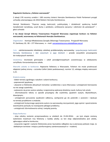 Regulamin Konkursu „Felieton warszawski” Z okazji 170 rocznicy urodzin i 100 rocznicy śmierci Henryka Sienkiewicza Polski Parlament przyjął uchwałę ustanawiającą rok 2016 Rokiem Henryka Sienkiewicza. Henryk Sienkiewicz "Poprzez swoją twórczość, publicystykę i działalność społeczną budził świadomość narodową, uczył dumy z polskości, umiłowania ojczyzny i zdolności do poświęceń” – głosi uchwała Z tej okazji Zarząd Główny Towarzystwa Przyjaciół Warszawy organizuje konkurs na felieton warszawski, wzorowany na felietonach Henryka Sienkiewicza. Organizator: Komisja Młodzieżowa Zarządu Głównego Towarzystwa Przyjaciół Warszawy Pl. Zamkowy 10; 00 – 277 Warszawa; e – mail: [email protected] Cele: zainteresowanie młodzieży szkolnej problematyką warszawską i popularyzacja twórczości Henryka Sienkiewicza i idei zawartych w jego dziełach – przede wszystkim przywiązania do tradycyjnych wartości. Uczestnicy: Uczniowie gimnazjów i szkół ponadgimnazjalnych uczestniczący w zdobywaniu certyfikatu Varsavianistyczna szkoła. Warunki udziału w konkursie: Napisanie felietonu o Warszawie. Felieton nie może przekraczać objętości jednej strony – czcionka Calibri (tekst podstawowy), rozmiar 12, odstępy między wierszami 1,15. Kryteria oceny: - dobór tematu zgodnego z tytułem i celami konkursu; - poprawność językowa; - ukazanie w felietonie aktualnych tematów i problemów z życia Warszawy i umiejętność kierowania na nie uwagi czytelnika; - wykazanie się przez autora wiedzą i znajomością wybranej dziedziny nauki, kultury lub sztuki; - sformułowanie tekstu w sposób przystępny dla czytelnika, językiem żywym, błyskotliwym, dowcipnym; - umiejętność poruszenia wyobraźni odbiorcy, zachęcenie go do polemiki z autorem i dyskusji na tematy przybliżone a artykule; - umiejętność krytycznego spojrzenia autora na warszawską rzeczywistość, jego opinie i spostrzeżenia ewentualnie pomysły na rozwiązanie jakiegoś problemu; - umiejętność sformułowania celnej i zwięzłej puenty. Etapy konkursu: - etap szkolny zostanie przeprowadzony w szkołach do 15.04.2016r. - po tym etapie zostaną wyłonione maximum trzy felietony z każdej szkoły; za ten etap odpowiedzialna jest szkoła, zgłaszająca udział w konkursie; - wręczenie nagród i czytanie felietonów przez laureatów odbędzie się w pierwszej połowie maja. (o dokładnym terminie i miejscu poinformujemy zainteresowanych e – mailem). Nagrody: Na etapie szkolnym nagrody funduje szkoła, zaś nagrody dla finalistów przygotowuje organizator. Sprawy organizacyjne: Felietony wraz z kartami zgłoszenia muszą być wysłane e-mailem po przeprowadzeniu etapu szkolnego do 15 kwietnia 2016 r. Spośród nadesłanych prac Komisja Konkursowa wybierze najlepsze prace w kategoriach: gimnazjum i szkoły ponadgimnazjalne. Prace te zostaną opublikowane na stronie internetowej Towarzystwa Przyjaciół Warszawy Do Konkursu mogą być zgłaszane tylko felietony autorskie, nie naruszające praw osób trzecich. Zgłaszane reportaże nie mogą opisywać treści pornograficznych, scen brutalnych, propagujących zachowania nieetyczne lub sprzeczne z prawem. Przesłanie felietonu i karty zgłoszenia jest równocześnie zgodą na nagrywanie, filmowanie i fotografowanie podczas uroczystości zakończenia - wręczania nagród połączonego z czytaniem najlepszych prac oraz zamieszczanie wizerunku autora, jego imienia, nazwiska i nazwy szkoły na stronie internetowej Towarzystwa Przyjaciół Warszawy i na facebooku. Decyzje komisji konkursowej są ostateczne. Sprawy, które nie zostały ujęte w regulaminie rozstrzyga organizator konkursu, natomiast informacji udziela Małgorzata Wojtatowicz ( najlepiej e – mailem: [email protected]).