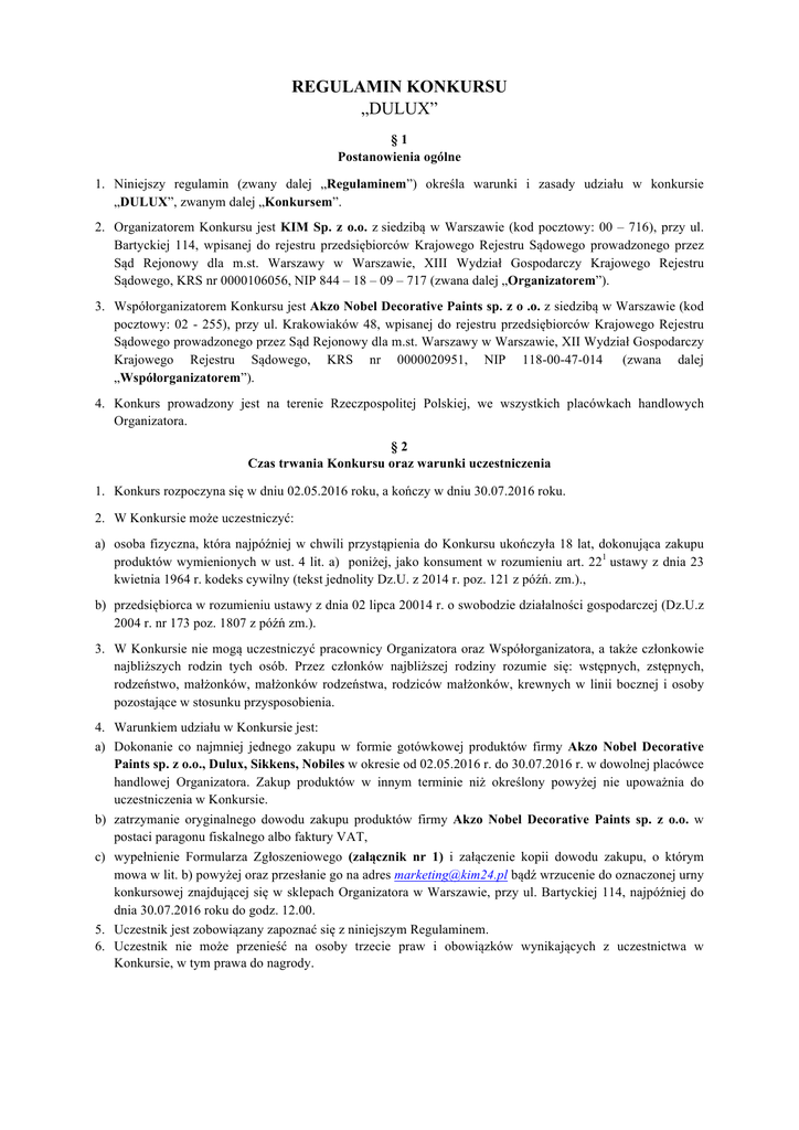 REGULAMIN KONKURSU „DULUX” §1 Postanowienia ogólne 1. Niniejszy regulamin (zwany dalej „Regulaminem”) określa warunki i zasady udziału w konkursie „DULUX”, zwanym dalej „Konkursem”. 2. Organizatorem Konkursu jest KIM Sp. z o.o. z siedzibą w Warszawie (kod pocztowy: 00 – 716), przy ul. Bartyckiej 114, wpisanej do rejestru przedsiębiorców Krajowego Rejestru Sądowego prowadzonego przez Sąd Rejonowy dla m.st. Warszawy w Warszawie, XIII Wydział Gospodarczy Krajowego Rejestru Sądowego, KRS nr 0000106056, NIP 844 – 18 – 09 – 717 (zwana dalej „Organizatorem”). 3. Współorganizatorem Konkursu jest Akzo Nobel Decorative Paints sp. z o .o. z siedzibą w Warszawie (kod pocztowy: 02 - 255), przy ul. Krakowiaków 48, wpisanej do rejestru przedsiębiorców Krajowego Rejestru Sądowego prowadzonego przez Sąd Rejonowy dla m.st. Warszawy w Warszawie, XII Wydział Gospodarczy Krajowego Rejestru Sądowego, KRS nr 0000020951, NIP 118-00-47-014 (zwana dalej „Współorganizatorem”). 4. Konkurs prowadzony jest na terenie Rzeczpospolitej Polskiej, we wszystkich placówkach handlowych Organizatora. §2 Czas trwania Konkursu oraz warunki uczestniczenia 1. Konkurs rozpoczyna się w dniu 02.05.2016 roku, a kończy w dniu 30.07.2016 roku. 2. W Konkursie może uczestniczyć: a) osoba fizyczna, która najpóźniej w chwili przystąpienia do Konkursu ukończyła 18 lat, dokonująca zakupu produktów wymienionych w ust. 4 lit. a) poniżej, jako konsument w rozumieniu art. 221 ustawy z dnia 23 kwietnia 1964 r. kodeks cywilny (tekst jednolity Dz.U. z 2014 r. poz. 121 z późń. zm.)., b) przedsiębiorca w rozumieniu ustawy z dnia 02 lipca 20014 r. o swobodzie działalności gospodarczej (Dz.U.z 2004 r. nr 173 poz. 1807 z późń zm.). 3. W Konkursie nie mogą uczestniczyć pracownicy Organizatora oraz Współorganizatora, a także członkowie najbliższych rodzin tych osób. Przez członków najbliższej rodziny rozumie się: wstępnych, zstępnych, rodzeństwo, małżonków, małżonków rodzeństwa, rodziców małżonków, krewnych w linii bocznej i osoby pozostające w stosunku przysposobienia. 4. Warunkiem udziału w Konkursie jest: a) Dokonanie co najmniej jednego zakupu w formie gotówkowej produktów firmy Akzo Nobel Decorative Paints sp. z o.o., Dulux, Sikkens, Nobiles w okresie od 02.05.2016 r. do 30.07.2016 r. w dowolnej placówce handlowej Organizatora. Zakup produktów w innym terminie niż określony powyżej nie upoważnia do uczestniczenia w Konkursie. b) zatrzymanie oryginalnego dowodu zakupu produktów firmy Akzo Nobel Decorative Paints sp. z o.o. w postaci paragonu fiskalnego albo faktury VAT, c) wypełnienie Formularza Zgłoszeniowego (załącznik nr 1) i załączenie kopii dowodu zakupu, o którym mowa w lit. b) powyżej oraz przesłanie go na adres [email protected] bądź wrzucenie do oznaczonej urny konkursowej znajdującej się w sklepach Organizatora w Warszawie, przy ul. Bartyckiej 114, najpóźniej do dnia 30.07.2016 roku do godz. 12.00. 5. Uczestnik jest zobowiązany zapoznać się z niniejszym Regulaminem. 6. Uczestnik nie może przenieść na osoby trzecie praw i obowiązków wynikających z uczestnictwa w Konkursie, w tym prawa do nagrody. §3 Przebieg Konkursu i Nagroda 1. W Konkursie zostaną przyznane następujące nagrody: − Nagroda 1 miejsce – maszyna natryskowa firmy Graco GX21 o wartości rynkowej 3.250 zł netto, − Nagroda 2 miejsce – torba sportowa Hi-Tec o wartości rynkowej 100 zł netto − Nagroda 3 miejsce – zestaw: spodnie malarskie i t-shirt marki DULUX o wartości rynkowej 80 zł netto zwane dalej „Nagrodą”. 2. Fundatorem Nagród jest Współorganizator. 3. W Konkursie zostanie wyłoniony zwycięstwa, który w okresie trwania Konkursu dokona o najwyższej wartości zakupów produktów Akzo Nobel Decorative Paints sp. z o.o., Dulux, Sikkens, Nobiles przeznaczonych do systemu mieszalnikowego firmy Akzo Nobel. 4. Zwycięzca, który otrzyma Nagrodę 1 miejsce, o której jest mowa w § 3 ust. 1 powyżej, zobowiązany będzie do zapłaty podatku dochodowego z tytułu uzyskanej wygranej. a) Jeśli konkurs wygra uczestnik, o którym mowa w § 2 ust. 2 lit. a) niniejszego regulaminu, jest obowiązany wpłacić Organizatorowi jako płatnikowi 10% zryczałtowanego podatku dochodowego od osób fizycznych od wartości przekazanej Nagrody (art. 30 ust. 1 pkt 2 w zw. z art. 41 ust. 7 ustawy z dnia 26 lipca 1991 r. Dz.U. z 2012 r. poz. 361 z późn. zm.) na konto bankowe o numerze: 05 1050 1025 1000 0023 1941 0649, ING Bank Śląski S.A w tytule należy wpisać „Konkurs DULUX”, niezwłocznie od otrzymania informacji o wygranej w trybie przewidzianym w pkt 6 poniżej, co warunkuje późniejsze udostępnienie przez Organizatora Nagrody. Następnie kwota powyższa zostanie przekazana przez Organizatora do właściwego dla zwycięzcy urzędu skarbowego. b) Jeśli konkurs wygra uczestnik, o którym mowa w § 2 ust. 2 lit. b), nagroda, którą otrzyma w związku z prowadzoną przez siebie działalnością gospodarczą stanowi przychód z tej działalności podlegający opodatkowaniu podatkiem dochodowym, zgodnie ze stosowaną przez podatnika formą opodatkowania. 5. Organizator, w terminie 3 dni roboczych od dnia zakończenia Konkursu, to jest dnia 03.08.2016 r. ustali wynik Konkursu i wyłoni zwycięzców, oraz poinformuje ich o wygranej za pośrednictwem maila lub telefonicznie zgodnie z danymi wskazanymi w Formularzu Zgłoszeniowym. 6. Nagroda zostanie wręczona Zwycięzcy konkursu podczas tzw. „Śniadania czwartkowego”, które odbędzie się dnia 04.08.2016 r. w godz. 6 - 11 w siedzibie Organizatora. 7. Jeśli Zwycięzca konkursu nie może odebrać Nagrody w terminie wskazanym w pkt 7 powyżej, powinien o tym poinformować Organizatora telefonicznie pod numerem: Kierownik Sklepu z farbami: Dariusz Postek 22 55 96 528 lub Marketing: 22 55 96 272 lub e-mailem na adres: [email protected]. W przypadku braku jakiegokolwiek kontaktu