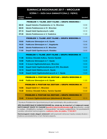 ELIMINACJE REGIONALNE 2017 – WROCŁAW SCENA 1 – DUŻA SALA GIMNASTYCZNA [1. PIĘTRO] Godzina występu Drużyna Spontan* PROBLEM 1: TAJNE JEST FAJNE :: GRUPA WIEKOWA I 08:30 Zespół Szkolno-Przedszkolny nr 16, Wrocław 12:30 08:50 Szkoła Podstawowa nr 51, Wrocław 11:40 09:10 Zespół Szkół Społecznych, Lubin 12:10 09:30 Szkoła Podstawowa nr 3, Trzebnica 11:20 PROBLEM 1: TAJNE JEST FAJNE :: GRUPA WIEKOWA II 10:05 Publiczne Gimnazjum nr 8, Opole 12:45 10:25 Publiczne Gimnazjum nr 1, Bogatynia 13:35 10:45 Szkoła Podstawowa nr 21, Wrocław 13:05 11:05 Zespół Szkół Społecznych, Kłodzko 13:55 PROBLEM 1: TAJNE JEST FAJNE :: GRUPA WIEKOWA III 11:40 Gminny Ośrodek Kultury, Tarnów Opolski 14:10 12:00 Publiczne Gimnazjum nr 7, Opole 15:30 12:20 X Liceum Ogólnokształcące, Wrocław 13:50 12:50 Zespół Szkół Ogólnokształcących STO, Kluczbork 15:50 13:10 Zespół Szkół Elektrycznych, Opole 14:40 13:30 Zespół Szkół Ogólnokształcących nr 1, Opole 15:00 PROBLEM 4: POSTAW NA ZESTAW :: GRUPA WIEKOWA II 14:40 Publiczne Gimnazjum nr 8, Opole 11:05 PROBLEM 4: POSTAW NA ZESTAW :: GRUPA WIEKOWA III 15:00 Zespół Szkół nr 1, Wrocław 10:30 15:20 Gminny Ośrodek Kultury, Tarnów Opolski 10:50 PROBLEM 4: POSTAW NA ZESTAW :: GRUPA WIEKOWA IV 12:45 X Liceum Ogólnokształcące [absolwenci], Wrocław 10:10 * Konkurs Problemów Spontanicznych jest zamknięty dla publiczności. JEŚLI ZNAJDZIESZ BŁĄD W HARMONOGRAMIE (np. okaże się, że masz być w 2 miejscach naraz), NATYCHMIAST ZGŁOŚ TO PAULINIE [[email protected]]! Bezzasadne uwagi w rodzaju „Wolelibyśmy wystąpić o innej godzinie” nie będą uwzględniane. Na spostrzeżenia i prośby odnośnie harmonogramu czekamy tylko do piątku, 17.02.2017. Harmonogram może ulegać zmianom! Jeśli poprawki dotyczyć będą waszej drużyny – mailowo powiadomimy o tym trenera zespołu. Strona 1 z 5 ELIMINACJE REGIONALNE 2017 – WROCŁAW SCENA 2 – MAŁA SALA GIMNASTYCZNA [1. PIĘTRO] Godzina występu Drużyna Spontan* PROBLEM 5: BOHATER BARDZO SUPER… CDN. :: GRUPA WIEKOWA IV 08:30 X Liceum Ogólnokształcące [absolwenci], Wrocław 11:25 PROBLEM 5: BOHATER BARDZO SUPER… CDN. :: GRUPA WIEKOWA II 08:50 Zespół Szkół EKOLA, Wrocław 13:10 09:10 Szkoła Podstawowa nr 2, Trzebnica 13:30 09:30 Gimnazjum nr 1 [A], Nysa 14:05 10:05 Klub dla Dzieci ISKIERKA NADZIEI, Nysa 14:25 10:25 Publiczne Gimnazjum nr 7, Opole 15:40 10:45 Młodzieżowy Ośrodek Socjoterapii w Dobrodzieniu 14:45 11:05 Centrum Wspierania Talentów, Wrocław 16:00 11:40 Zespół Szkół w Brzeziej Łące 15:20 12:00 Gimnazjum nr 3, Oleśnica 08:50 12:20 Zespół Szkół Społecznych, Lubin 10:45 13:30 Namysłowski Ośrodek Kultury, Namysłów 09:10 13:50 Gimnazjum w Lubinie 09:30 14:10 Publiczna Szkoła Podstawowa nr 15, Wałbrzych 10:05 14:30 Zespół Szkół w Chróścinie 10:25 15:05 Zespół Szkół Gminy Izbicko 11:40 15:25 Publiczne Gimnazjum nr 1, Bogatynia 11:20 15:45 Publiczne Gimnazjum nr 8, Opole 12:50 PROBLEM DLA JUNIORÓW: DEBEŚCIACKA PRZEPROWADZKA 16:20 Zespół Szkół Społecznych, Lubin --- 16:40 Dolnośląskie Centrum Edukacji Montessori, Zabrodzie --- 17:00 Dolnośląskie Centrum Edukacji Montessori, Zabrodzie --- PROBLEM 5: BOHATER BARDZO SUPER… CDN. :: WYSTĘP SPECJALNY 17:20 Zespół Szkół Społecznych, Lubin [trenerzy – poza konkursem] --- * Konkurs Problemów Spontanicznych jest zamknięty dla publiczności. JEŚLI ZNAJDZIESZ BŁĄD W HARMONOGRAMIE (np. okaże się, że masz być w 2 miejscach naraz), NATYCHMIAST ZGŁOŚ TO PAULINIE [[email protected]]! Bezzasadne uwagi w rodzaju „Wolelibyśmy wystąpić o innej godzinie” nie będą uwzględniane. Na spostrzeżenia i prośby odnośnie harmonogramu czekamy tylko do piątku, 17.02.2017. Harmonogram może ulegać zmianom! Jeśli poprawki dotyczyć będą waszej drużyny – mailowo powiadomimy o tym trenera zespołu. Strona 2 z 5 ELIMINACJE REGIONALNE 2017 – WROCŁAW SCENA 3 – AULA [2. PIĘTRO] Godzina występu Drużyna Spontan* PROBLEM 5: BOHATER BARDZO SUPER… CDN. :: GRUPA WIEKOWA I 08:30 Zespół Szkolno-Przedszkolny nr 19, Wrocław 11:15 09:00 Niepubl. Szkoła Podstawowa LEONARDO DA VINCI, Wrocław 11:35 09:30 Zespół Szkolno-Przedszkolny nr 12, Wrocław 12:45 10:15 Zespół Szkół Ogólnokształcących STO, Kluczbork 14:15 10:45 Zespół Szkół TAK, Opole 13:05 11:15 Zespół Szkół Społecznych, Lubin 13:25 11:45 Zespół Szkolno-Przedszkolny nr 16, Wrocław 14:35 12:15 Szkoła Podstawowa nr 2, Trzebnica 13:55 12:35 Szkoła Podstawowa nr 3, Trzebnica 10:55 PROBLEM 5: BOHATER BARDZO SUPER… CDN. :: GRUPA WIEKOWA III 14:00 Publiczne Gimnazjum nr 6, Wałbrzych 09:55 14:30 Zespół Szkolno-Przedszkolny OXPRESS, Bolesławiec 10:15 14:50 Szkoła Podstawowa nr 3, Trzebnica 11:10 15:10 Gimnazjum w Lubinie 09:20 15:40 Szkoła Podstawowa nr 8 [absolwenci], Wrocław 08:40 16:00 Zespół Szkół Społecznych, Lubin 09:00 16:20 Publiczne Gimnazjum nr 7, Opole 11:30 16:40 Zespół Szkół nr 1, Wrocław 10:35 * Konkurs Problemów Spontanicznych jest zamknięty dla publiczności. JEŚLI ZNAJDZIESZ BŁĄD W HARMONOGRAMIE (np. okaże się, że masz być w 2 miejscach naraz), NATYCHMIAST ZGŁOŚ TO PAULINIE [[email protected]]! Bezzasadne uwagi w rodzaju „Wolelibyśmy wystąpić o innej godzinie” nie będą uwzględniane. Na spostrzeżenia i prośby odnośnie harmonogramu czekamy tylko do piątku, 17.02.2017. Harmonogram może ulegać zmianom! Jeśli poprawki dotyczyć będą waszej drużyny – mailowo powiadomimy o tym trenera zespołu. Strona 3 z 5 ELIMINACJE REGIONALNE 2017 – WROCŁAW SCENA 3 – AULA [2. PIĘTRO] Godzina występu Drużyna Spontan* PROBLEM 2: ROBOTA DLA DZIWNO-BOTA :: GRUPA WIEKOWA I 08:45 Zespół Szkolno-Przedszkolny nr 12, Wrocław 15:10 09:15 Zespół Szkół w Brzeziej Łące 15:30 PROBLEM 2: ROBOTA DLA DZIWNO-BOTA :: GRUPA WIEKOWA II 10:00 Gimnazjum nr 2 z Oddziałami Dwujęzycznymi, Namysłów 15:05 10:30 Namysłowski Ośrodek Kultury, Namysłów 
