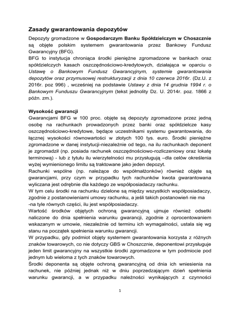 Zasady gwarantowania depozytów Depozyty gromadzone w Gospodarczym Banku Spółdzielczym w Choszcznie są objęte polskim systemem gwarantowania przez Bankowy Fundusz Gwarancyjny (BFG). BFG to instytucja chroniąca środki pieniężne zgromadzone w bankach oraz spółdzielczych kasach oszczędnościowo-kredytowych, działająca w oparciu o Ustawę o Bankowym Fundusz Gwarancyjnym, systemie gwarantowania depozytów oraz przymusowej restrukturyzacji z dnia 10 czerwca 2016r. (Dz.U. z 2016r. poz 996) , wcześniej na podstawie Ustawy z dnia 14 grudnia 1994 r. o Bankowym Funduszu Gwarancyjnym (tekst jednolity Dz. U. 2014r. poz. 1866 z późn. zm.). Wysokość gwarancji Gwarancjami BFG w 100 proc. objęte są depozyty zgromadzone przez jedną osobę na rachunkach prowadzonych przez banki oraz spółdzielcze kasy oszczędnościowo-kredytowe, będące uczestnikami systemu gwarantowania, do łącznej wysokości równowartości w złotych 100 tys. euro. Środki pieniężne zgromadzone w danej instytucji-niezależnie od tego, na ilu rachunkach deponent je zgromadził (np. posiada rachunek oszczędnościowo-rozliczeniowy oraz lokatę terminową) - lub z tytułu ilu wierzytelności mu przysługują –dla celów określenia wyżej wymienionego limitu są traktowane jako jeden depozyt. Rachunki wspólne (np. należące do współmałżonków) również objęte są gwarancjami, przy czym w przypadku tych rachunków kwota gwarantowana wyliczana jest odrębnie dla każdego ze współposiadaczy rachunku. W tym celu środki na rachunku dzielone są między wszystkich współposiadaczy, zgodnie z postanowieniami umowy rachunku, a jeśli takich postanowień nie ma -na tyle równych części, ilu jest współposiadaczy. Wartość środków objętych ochroną gwarancyjną ujmuje również odsetki naliczone do dnia spełnienia warunku gwarancji, zgodnie z oprocentowaniem wskazanym w umowie, niezależnie od terminu ich wymagalności, ustala się wg stanu na początek spełnienia warunku gwarancji. W przypadku, gdy podmiot objęty systemem gwarantowania korzysta z różnych znaków towarowych, co nie dotyczy GBS w Choszcznie, deponentowi przysługuje jeden limit gwarancyjny na wszystkie środki zgromadzone w tym podmiocie pod jednym lub wieloma z tych znaków towarowych. Środki deponenta są objęte ochroną gwarancyjną od dnia ich wniesienia na rachunek, nie później jednak niż w dniu poprzedzającym dzień spełnienia warunku gwarancji, a w przypadku należności wynikających z czynności 1 bankowych, o ile czynność ta została dokonana przed dniem spełnienia warunku gwarancji. W przypadku, gdy środki lub należności deponenta będącego osobą fizyczną pochodzą z: 1) odpłatnego zbycia: a) nieruchomości zabudowanej budynkiem mieszkalnym jednorodzinnym w rozumieniu przepisów ustawy Prawo budowlane, jej części lub udziału w takiej nieruchomości, b) prawa użytkowania wieczystego gruntu zabudowanego budynkiem mieszkalnym jednorodzinnym w rozumieniu przepisów ustawy Prawo budowlane lub udziału w takim prawie, c) samodzielnego lokalu mieszkalnego w rozumieniu przepisów ustawy o własności lokali stanowiącego odrębną nieruchomość lub udziału w takim lokalu, gruntu lub udziału w gruncie albo prawa użytkowania wieczystego gruntu lub udziału w takim prawie, związanych z tym lokalem, d) spółdzielczego własnościowego prawa do lokalu o przeznaczeniu mieszkalnym lub udziału w takim prawie – jeżeli zbycie to nie nastąpiło w ramach wykonywanej działalności gospodarczej, 2) wykonania na rzecz deponenta umownego lub sądowego podziału majątku po ustaniu małżeńskiej wspólności majątkowej, 3) nabycia przez deponenta spadku, wykonania na jego rzecz zapisu lub otrzymania przez niego zachowku, 4) wypłaty sumy ubezpieczenia z tytułu umowy ubezpieczenia na życie w związku ze śmiercią osoby ubezpieczonej lub dożyciem przez nią oznaczonego wieku, 5) wypłaty sumy ubezpieczenia z tytułu umowy ubezpieczenia następstw nieszczęśliwych wypadków w związku z uszkodzeniem ciała, rozstrojem zdrowia lub śmiercią osoby ubezpieczonej wskutek nieszczęśliwego wypadku, 6) wypłaty odprawy pieniężnej na warunkach i w wysokości określonych w przepisach odrębnych, 7) wypłaty odprawy emerytalnej lub rentowej, o której mowa w art. 92§ 1 ustawy – Kodeks pracy lub odrębnych przepisach, na warunkach i w wysokości określonych w tych przepisach – są one objęte ochroną gwarancyjną, w terminie 3 miesięcy od dnia wpływu środków na rachunek lub powstania należności, do wysokości stanowiącej różnicę pomiędzy dwukrotnością limitu równowartości w złotych 100 000 euro a sumą pozostałych środków i należności deponenta, nie wyższą jednak niż limit równowartości w złotych 100 000 euro. 2 Po tym terminie środki i należności deponenta są objęte obowiązkowym systemem gwarantowania depozytów na zasadach ogólnych, tj. do wysokości równowartości w złotych 100 000 euro. W przypadku, gdy środki lub należności deponenta będącego osobą fizyczną pochodzą z wypłaty odszkodowania za szkodę wyrządzoną przestępstwem lub zadośćuczynienia za doznaną krzywdę, odszkodowania lub zadośćuczynienia, o którym mowa w art. 552 ustawy – Kodeks postępowania karnego, są one objęte ochroną gwarancyjną, w terminie 3 miesięcy od dnia wpływu środków na rachunek lub powstania należności –w całości. Po tym terminie te środki i należności są objęte obowiązkowym systemem gwarantowania depozytów na zasadach ogólnych, tj. do wysokości równowartości w złotych 100 tys. euro. Gwarancjom BFG podlegają imienne depozyty złotowe i walutowe deponentów: osób fizycznych, osób prawnych, jednostek organizacyjnych niebędących osobami prawnymi, którym odrębna ustawa przyznaje zdolność prawną, szkolnych kas oszczędności (SKO), pracowniczych kas zapomogowo - pożyczkowych. Oprócz środków pieniężnych zgromadzonych na wszystkich imie