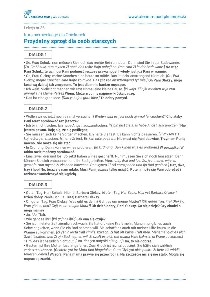 www.aterima-med.pl/niemiecki Lekcja nr 36 Kurs niemieckiego dla Opiekunek Przydatny sprzęt dla osób starszych DIALOG 1 • So, Frau Schulz, nun müssen Sie noch das rechte Bein anheben. Dann sind Sie in der Badewanne. [Zo, Frał Szulc, nun mysen Zi noch das reśte Bajn anhejben. Dan zind Zi in der Badewane.] No więc Pani Schulz, teraz musi Pani podnieść jeszcze prawą nogę. I wtedy jest już Pani w wannie. • Oh, Frau Oleksy, meine Knochen sind heute so müde. Das ist sehr anstrengend für mich. [Oh, Frał Oleksy, majne Knochen zind hojte zo myde. Das yst zea ansztrengend fyr miś.] Oh Pani Oleksy, moje kości są dzisiaj tak zmęczone. To jest dla mnie bardzo męczące. • Ich weiß. Vielleicht machen wir erst einmal eine kleine Pause. [Iś wajs. Filajśt machen wija erst ajnmal ajne klajne Pałze.] Wiem. Może zrobimy najpierw krótką pauzę. • Das ist eine gute Idee. [Das yst ajne gute Idee.] To dobry pomysł. DIALOG 2 • Wollen wir es jetzt noch einmal versuchen? [Wolen wija es ject noch ajnmal fer-zuchen?] Chciałaby Pani teraz spróbować raz jeszcze? • Ich bin nicht sicher. Ich habe Angst, auszurutschen. [Iś bin niśt zisia. Iś habe Angst, ałscuruczen.] Nie jestem pewna. Boję się, że się poślizgnę. • Sie müssen sich keine Sorgen machen. Ich halte Sie fest. Es kann nichts passieren. [Zi mysen ziś kajne Zorgen machen. Iś halte Zi fest. Es kan niśc pasiren.] Nie musi się Pani obawiać. Trzymam Panią mocno. Nie może się nic stać. • In Ordnung. Dann können wir es probieren. [In Ordnung. Dan kynen wija es probiren.] W porządku. W takim razie możemy spróbować. • Eins, zwei, drei und los! So, jetzt haben wir es geschafft. Nun müssen Sie sich noch hinsetzen. Dann können Sie sich entspannen und Ihr Bad genießen. [Ajns, cfaj, draj und los! Zo, ject haben wija es geszaft. Nun mysen Zi ziś noch hinzecen. Dan kynen Zi ziś entszpanen und Ija Bad genisen.] Raz, dwa, trzy i hop! No, teraz się nam udało. Musi Pani jeszcze tylko usiąść. Potem może się Pani odprężyć i rozkoszować/cieszyć się kąpielą. DIALOG 3 • Guten Tag, Herr Schulz. Hier ist Barbara Oleksy. [Guten Tag, Her Szulc. Hija yst Barbara Oleksy.] Dzień dobry Panie Schulz. Tutaj Barbara Oleksy. • Oh guten Tag, Frau Oleksy. Was gibt es denn? Geht es um meine Mutter? [Oh guten Tag, Frał Oleksy. Was gibt es den? Gejt es um majne Muta?] Oh dzień dobry, Pani Oleksy. Co się dzieje? Czy chodzi o moją mamę? • Ja. [Ja.] Tak. • Wie geht es ihr? [Wi gejt es ija?] Jak ona się czuje? • Sie ist in letzter Zeit ziemlich schwach. Sie hat oft keine Kraft mehr. Manchmal gibt es auch Schwierigkeiten, wenn Sie ein Bad nehmen will. Sie schafft es auch mit meiner Hilfe kaum, in die Wanne zu kommen. [Zi yst in lecta Cajt cimliś szwach. Zi hat oft kajne Kraft mea. Manśmal gibt es ałch Szwiriśkajten, wen Zi ajn Bad nejmen wil. Zi szaft es ałch mit majna Hilfe kałm, in di Wane cu komen.] • Hm, das ist natürlich nicht gut. [Hm, das yst natyrliś niśt gut.] Hm, to nie dobrze. • Gestern ist Ihre Mutter fast hingefallen. Zum Glück ist nichts passiert. Sie hätte sich wirklich verletzten können. [Gestern yst Ire Muta fast hingefalen. Cum Glyk yst niśc pasirt. Zi hete ziś wirkliś ferlecen kynen.] Wczoraj Pana mama prawie się przewróciła. Na szczęście nic się nie stało. Mogła się naprawdę zranić. 1 www.aterima-med.pl/niemiecki • Oh je. Dann ist es Zeit, etwas zu ändern. Frau Oleksy, wir brauchen so schnell wie möglich einen Badewannenlift. [Oh je. Dan yst es Cajt, etfas cu endern. Frał Oleksy, wija brałchen zo sznel wi mygliś ajnen Badewanenlift.] Ojej. W takim razie czas coś zmienić. Pani Oleksy, tak szybko jak to tylko możliwe potrzebujemy windę do wanny. • Das ist ein toller Vorschlag. Aber wie können wir das organisieren? [Das yst ajn tola Forszlag. Aba wi kynen wija das organiziren?] To świetna propozycja. Ale jak możemy to zorganizować? • Das ist nicht so schwer. Ich werde mich darum kümmern. Ich rufe noch heute Nachmittag bei der Krankenkasse an. Ich werde dort Bescheid sagen, dass wir diesen Lift brauchen. [Das yst nicht zo szwea. Iś werde miś darum kymern. Iś rufe noch hojte Nachmitag baj der Krankenkase an. Iś werde dort Beszajd zagen, das wija dizen Lift brałchen.] To nie jest takie trudne. Zatroszczę się o to. Jeszcze dzisiaj zadzwonię do kasy chorych. Powiem, że potrzebujemy tej windy. • Sehr gut. Und dann? [Zea gut. Und dan?] Bardzo dobrze. A potem? • Dann informiert die Krankenkasse das Sanitätshaus. Wir vereinbaren anschließend einen Lieferungstermin mit dem Sanitätshaus. [Dan informirt di Krankenkase das Zanitetshałs. Wija ferajnbaren anszlisend ajnen Liferungstermin mit dem Zanitetshałs.] Później kasa chorych poinformuje sklep medyczny. Następnie ustalimy z tym sklepem termin dostawy. • Habe ich es richtig verstanden? Das Sanitätshaus bringt den Lift zu uns nach Hause? [Habe iś es riśtiś fersztanden? Das Zanitetshałs bringt den Lift cu uns nach Hałze?] Czy dobrze zrozumiałam? Sklep medyczny dostarczy windę do domu? • Genau. [Genał.] Dokładnie. • Schön! [Szyn!] Super! DIALOG 4 • Vielleicht sollten wir dann auch noch einen Rollator bestellen? Wenn wir kleine Spaziergänge machen, ist Frau Schulz sehr wackelig auf den Beinen. Sie verliert schnell das Gleichgewicht. Sie braucht immer meinen Arm als Stütze. [Filajśt zolten wija dan ałch noch ajnen Rolator besztelen? Wen wija klajne Szpacirgenge machen, yst Frał Szulc zea wakeliś ałf den Bajnen. Zi ferlirt sznel das Glajśgewiśt. Zi brałcht yma majnen Arm als Sztyce.] Może powinniśmy zamówić również balkonik? Kiedy idziemy na mały spacer pani Schulz bardzo chwieje się na nogach. Szybko traci równowagę. Zawsze potrzebuje mojego ramienia do podparcia. • Sie haben Recht. Eine Gehhilfe wäre sehr nützlich. Ich werde den Rollator und den Badewannenlift besorgen. Ich sage Ihnen natürlich Bescheid, wann beides geliefert wird. [Zi h