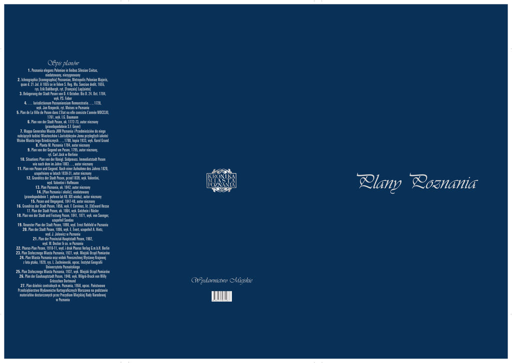 Spis planów 1. Posnania elegans Poloniae in finibus Silesiae Civitas, niedatowany, niesygnowany 2. Ichnographia [Iconographia] Posnaniae, Metropolis Poloniae Majoris, quae d. 21 Jul. A 1655 se in fidem S. Reg. Ma. Sueciae dedit, 1655, rys. Erik Dahlbergh, ryt. [François] Lap[ointe] 3. Belagerung der Stadt Posen von D. 4 October. Bis D. 24. Oct. 1704, wyk. P.S. Faber 4. … Iurisdictionum Posnaniensium Remonstratio…, 1728, wyk. Jan Rzepecki, ryt. Moises w Poznaniu 5. Plan de La Ville de Posen dans L’Etat ou elle consiste L’année MDCCLXI, 1761, wyk. I.G. Daumann 6. Plan von der Stadt Posen, ok. 1772-73, autor nieznany (prawdopodobnie S.F. Geyer) 7. Mappa Generalna Miasta JKM Poznania i Przedmieściów do niego należących tudzież Miasteczków i Jurisdykcyów Jemu przyległych iakoteż Wsiów Miasta tego Dziedzicznych…, 1780, kopia 1933, wyk. Karol Grund 8. Planta M. Poznania 1784, autor nieznany 9. Plan von der Gegend um Posen, 1795, autor nieznany, ryt. Carl Jäck w Berlinie 10. Situations Plan von der Königl. Südpreuss. Immediatstadt Posen wie nach dem im Jahre 1803…, autor nieznany 11. Plan von Posen und Gegend. Nach einer Aufnahme des Jahres 1820, uzupełniony w latach 1830-31, autor nieznany 12. Grundriss der Stadt Posen, przed 1839, wyk. Valentini, wyd. Valentini i Hoffmann 13. Plan Poznania, ok. 1842, autor nieznany 14. [Plan Poznania i okolic], niedatowany (prawdopodobnie 1. połowa lat 40. XIX wieku), autor nieznany 15. Posen und Umgegend, 1847-48, autor nieznany 16. Grundriss der Stadt Posen, 1856, wyk. F. Corvinus, lit. [Ed]ward Hesse 17. Plan der Stadt Posen, ok. 1864, wyk. Gotzhein i Rösler 18. Plan von der Stadt und Festung Posen, 1841, 1871, wyk. von Saenger, uzupełnił Sandau 19. Neuester Plan der Stadt Posen, 1890, wyd. Ernst Rehfeld w Poznaniu 20. Plan der Stadt Posen, 1896, wyk. E. Evert, uzupełnił A. Hintz, wyd. J. Jolowicz w Poznaniu 21. Plan der Provinzial-Hauptstadt Posen, 1902, wyd. W. Decker & co. w Poznaniu 22. Pharus-Plan Posen, 1910-11, wyd. i druk Pharus Verlag G.m.b.H. Berlin 23. Plan Stołecznego Miasta Poznania, 1927, wyk. Miejski Urząd Pomiarów 24. Plan Miasta Poznania oraz widok Powszechnej Wystawy Krajowej z lotu ptaka, 1929, rys. L. Żuchniewski, oprac. Instytut Geografii Uniwersytetu Poznańskiego 25. Plan Stołecznego Miasta Poznania, 1937, wyk. Miejski Urząd Pomiarów 26. Plan der Gauhauptstadt Posen, 1940, wyk. Wilgrö-Druck von Willy Grösschen Dortmund 27. Plan dzielnic centralnych m. Poznania, 1958, oprac. Państwowe Przedsiębiorstwo Wydawnictw Kartograficznych Warszawa na podstawie materiałów dostarczonych przez Prezydium Miejskiej Rady Narodowej w Poznaniu Plany Poznania Wydawnictwo Miejskie 9 788375 031287