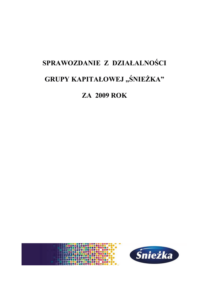 SPRAWOZDANIE Z DZIAŁALNOŚCI GRUPY KAPITAŁOWEJ „ŚNIEŻKA” ZA 2009 ROK Grupa Kapitałowa Śnieżka 1. Wstęp do Sprawozdania skonsolidowanego Grupy Kapitałowej za 2009 rok ..................................................................................................................... 3 2. Strategiczne cele Grupy Kapitałowej .......................................................... 16 3. Rynek farb i lakierów w 2009 roku ............................................................ 17 4. Wpływ sytuacji gospodarczej na wyniki Grupy Kapitałowej w 2009 roku ....................................................................................................... 19 5. Sprzedaż i portfel zamówień ........................................................................ 19 6. Dynamika sprzedaży ..................................................................................... 21 7. Produkcja ....................................................................................................... 25 8. Badania i rozwój............................................................................................ 26 9. Polityka zaopatrzenia.................................................................................... 26 10. Korzystanie ze środowiska ......................................................................... 27 11. Inwestycje..................................................................................................... 27 12. Pracownicy ................................................................................................... 29 13. Finanse.......................................................................................................... 30 14. Podstawowe ryzyka i zagrożenia związane z działalnością na rynku farb i lakierów.................................................................................................... 34 15. Informacje dodatkowe ................................................................................ 38 16. Podsumowanie ............................................................................................. 49 Sprawozdanie z działalności Grupy Kapitałowej Śnieżka za 2009 rok Strona 2 Grupa Kapitałowa Śnieżka 1. Wstęp do Sprawozdania skonsolidowanego Grupy Kapitałowej za 2009 rok Dane Grupy Kapitałowej: W skład Grupy Kapitałowej wchodzą: I. Fabryka Farb i Lakierów „Śnieżka” S.A. - Spółka dominująca Siedziba Zarządu Spółki: 39-102 Lubzina 34 a pow. ropczycko - sędziszowski woj. podkarpackie Rejestracja Spółki: Spółka działa na podstawie Statutu ustanowionego przez Zgromadzenie Akcjonariuszy sporządzonego w formie Aktu Notarialnego Repertorium A nr 121/98 r. uzupełniony Aktem Nr.754/98 z dnia 16.02.1998. Wpis do rejestru handlowego dokonany został przez Sąd Rejonowy w Rzeszowie Wydział V Gospodarczy, dnia 17.02.1998 pod poz. RHB - Dział B nr.1818, natomiast wpis Spółki do KRS pod numerem 0000060537 został dokonany w dniu 12.11.2001 r. w Sądzie Rejonowym w Rzeszowie XII Wydziale Gospodarczym Krajowego Rejestru Sądowego. Spółka została zarejestrowana w GUS i otrzymała NR REGON: 690527477 oraz w ewidencji podatkowej otrzymując NR NIP:818-14-33-438. Przedmiot działalności Spółki: Produkcja farb, lakierów, rozpuszczalników, klei, szpachli itp. Oddziały: 1. Lubzina 34 a 39-102 Lubzina pow. ropczycko – sędziszowski woj. podkarpackie 2. Brzeźnica 18 39-207 Brzeźnica pow. Dębica woj. podkarpackie 3. Pustków 604 39-205 Pustków pow. Dębica woj. podkarpackie 4. Dnia 1 sierpnia 2009 r. FFiL Śnieżka S.A. przejęła od Fabryki Farb i Lakierów Proszkowych PROXIMAL w Bytowie produkcję farb i lakierów proszkowych. Produkcja Sprawozdanie z działalności Grupy Kapitałowej Śnieżka za 2009 rok Strona 3 Grupa Kapitałowa Śnieżka farb i lakierów proszkowych realizowana jest w obiekcie spółki PROXIMAL w Bytowie przy ul. Leśnej 5, woj. pomorskie. Kapitał Zakładowy: W dniu 25 czerwca 2009 r. Walne Zgromadzenie Akcjonariuszy na podstawie art. 359 KSH umorzyło akcje na okaziciela serii C i F w łącznej ilości 296 413 sztuk na kwotę 296 413 zł. tj. • 20 000 sztuk akcji serii C na okaziciela, • 276 413 sztuk akcji serii F na okaziciela. Umorzenie to było umorzeniem dobrowolnym. Podstawą prawną umorzenia był § 6 ust. 8 Statutu Spółki i art. 359 i 360 k.s.h. Umorzenie nastąpiło poprzez obniżenie kapitału zakładowego na podstawie art. 455 § 1 k.s.h. Umorzenie akcji nastąpiło z czystego zysku. Akcje serii C i F w ilości 296 413 zostały umorzone po cenie 24,85 zł każda. Nadwyżka ponad wartość nominalną akcji serii C i F w wysokości 7 069 450,05 zł została pokryta z kapitału zapasowego. Jednocześnie na podstawie art. 360 KSH oraz podjętej uchwały nr 8/2009 ZWZA z dnia 25-06-2009 roku w sprawie umorzenia akcji własnych Walne Zgromadzenie Akcjonariuszy obniżyło kapitał zakładowy Spółki z dotychczasowej kwoty 13 850 000 zł do kwoty 13 553 587 zł tj. o kwotę 296 413 zł. Fakt obniżenia kapitału zakładowego wynika z nabycia przez Spółkę akcji własnych serii C i F celem ich umorzenia na mocy Uchwały Nr 4/2008 Nadzwyczajnego Walnego Zgromadzenia Akcjonariuszy Fabryki Farb i Lakierów „ŚNIEŻKA”S.A. z siedzibą w Lubzinie podjętej w dniu 17 marca 2008 roku w sprawie wyrażenia zgody dla Zarządu Spółki na nabycie akcji własnych w celu umorzenia. Jednocześnie Walne Zgromadzenie Akcjonariuszy upoważniło Zarząd Spółki do nabywania akcji własnych przez Spółkę w celu ich umorzenia na warunkach i w trybie ustalonych w uchwale („Skup akcji własnych”) oraz do podjęcia wszelkich czynności niezbędnych do nabycia akcji Spółki. Spółka nabędzie akcje własne na poniższych warunkach: a) łączna liczba nabywanych akcji nie przekroczy 10% wszystkich akcji Spółki tj. 1 355 358 szt. akcji, b) akcje nabywane będą na Giełdzie Papierów Wartościowych w Warszawie oraz poza rynkiem regulowanym