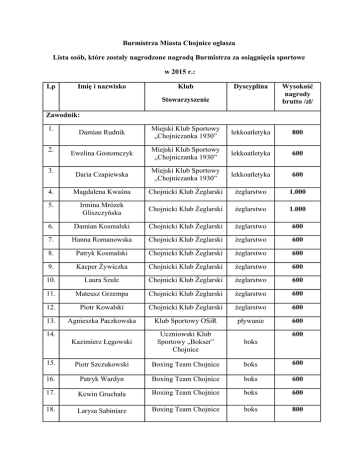 Burmistrza Miasta Chojnice ogłasza Lista osób, które zostały nagrodzone nagrodą Burmistrza za osiągnięcia sportowe w 2015 r.: Lp Imię i nazwisko Klub Dyscyplina Wysokość nagrody brutto /zł/ Stowarzyszenie Zawodnik: 1. Damian Rudnik Miejski Klub Sportowy „Chojniczanka 1930” lekkoatletyka 800 Ewelina Gostomczyk Miejski Klub Sportowy „Chojniczanka 1930” lekkoatletyka 600 Daria Czapiewska Miejski Klub Sportowy „Chojniczanka 1930” lekkoatletyka 600 4. Magdalena Kwaśna Chojnicki Klub Żeglarski żeglarstwo 1.000 5. Irmina Mrózek Gliszczyńska Chojnicki Klub Żeglarski żeglarstwo 1.000 6. Damian Kosmalski Chojnicki Klub Żeglarski żeglarstwo 600 7. Hanna Romanowska Chojnicki Klub Żeglarski żeglarstwo 600 8. Patryk Kosmalski Chojnicki Klub Żeglarski żeglarstwo 600 9. Kacper Żywiczka Chojnicki Klub Żeglarski żeglarstwo 600 10. Laura Szulc Chojnicki Klub Żeglarski żeglarstwo 600 11. Mateusz Grzempa Chojnicki Klub Żeglarski żeglarstwo 600 12. Piotr Kowalski Chojnicki Klub Żeglarski żeglarstwo 600 13. Agnieszka Paczkowska Klub Sportowy OSiR pływanie 600 Kazimierz Łęgowski Uczniowski Klub Sportowy „Bokser” Chojnice boks 15. Piotr Szczukowski Boxing Team Chojnice boks 600 16. Patryk Wardyn Boxing Team Chojnice boks 600 17. Kewin Gruchała Boxing Team Chojnice boks 600 18. Larysa Sabiniarz Boxing Team Chojnice boks 800 2. 3. 14. 600 19. Weronika Zakrzewska Boxing Team Chojnice boks 600 20. Paulina Gruchała Boxing Team Chojnice boks 600 21. Ewa Gibka Boxing Team Chojnice boks 600 22. Roksana Giersz Boxing Team Chojnice boks 600 23. Dziędziela Mariusz Stowarzyszenie „Szukam Drogi” piłka nożna 300 24. Kamiński Arkadiusz Stowarzyszenie „Szukam Drogi” piłka nożna 300 25. Krasojewicz Tomasz Stowarzyszenie „Szukam Drogi” piłka nożna 300 26. Lazer Marek Stowarzyszenie „Szukam Drogi” piłka nożna 300 27. Szamotulski Stanisław Stowarzyszenie „Szukam Drogi” piłka nożna 300 28. Szczęsny Paweł Stowarzyszenie „Szukam Drogi” piłka nożna 300 29. Tankiewicz Jarosław Stowarzyszenie „Szukam Drogi” piłka nożna 300 30. Wisiński Rafał Stowarzyszenie „Szukam Drogi” piłka nożna 300 31. Wnuk Lipiński Bogdan Stowarzyszenie „Szukam Drogi” piłka nożna 300 32. Łangowski Dawid Stowarzyszenie „Szukam Drogi” piłka nożna 300 1. Jarosław Wróblewski Miejski Klub Sportowy „Chojniczanka 1930” Lekkoatletyka 1.000 2. Marcin Gruchała Boxing Team Chojnice boks 1.000 Trener: Wręczenie nagród oraz pamiątkowych dyplomów odbędzie się podczas uroczystego spotkania z Burmistrzem Miasta Chojnice w dniu 11 marca 2016r. (piątek) o godzinie 10:00 w sali obrad Urzędu Miejskiego w Chojnicach, Stary Rynek 1, p. 408 (I piętro).