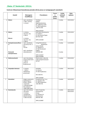 Data: 17 kwiecień 2012r. Centrum Aktywizacji Zawodowej posiada oferty pracy w następujących zawodach: L p . Zawód Wymagane kwalifikacje 1. Dekarz -wyk. zawodowe, -1 500 + premia, -1 zmiana 2. Dekarz -1 zmiana, -staż min. rok, -1 500 zł Murarz 3. Dociepleniowiec/Mura rz Pomocnik dociepleniowca -1 zmiana, -staż min. rok, -1 500 zł -wyk. zawodowe, -staż pracy min. 2 lata, -10 zł/h -wyk. zawodowe, -doświadczenie 4. Elektromechanik -wyk. kierunkowe, -prawo jazdy kat.B, -1 500 zł, -praca w Krapkowicach 5. Gospodyni domowa -1 zmiana, - 1 500 zł, -dokładność, sumienność Pracodawca Tymbud Zakład Ogólnobudowlany Os. 1000 lecia 2/43 47-300 Krapkowice 509 473 459 Ofpr/12/0142 Kauf-Dach-Rusztowania Ul. Krótka 5 47-325 Kamień Śląski 667 954 130 Termi n giełdy pracy Liczba wolnych miejsc 2 osoby 19.03.2012 1 osoba 29.03.2012 OfPr/12/0189 1 osoba Usługi RemontowoBudowlane Adrian Riedel Ul. Wiejska 37 47-364 Strzeleczki Ścigów 504 003 280 2 osoby OfPr/12/0207 OfPr/12/0208 Oferta pracy tylko dla osób zarejestrowanych W PUP Orchidea Ul. Elsnera 47-303 Krapkowice Data wpływu 11.04.2012 2 osoby 1 osoba 03.04.2012 1 osoba 28.03.2012 1 osoba 16.04.2012 1 osoba 28.02.201228.04.2012 501 330 672 7. Konsultant 6. 8 Kosmetyczka 8 -biegła znajomość j. angielskiego w mowie i piśmie -znajomość j. holenderskiego mile widziana -1200-2200 netto -wyk. kierunkowe, -3/4 etatu, -2 zmiany, -umiejętność robienia tipsów -1 500 zł brutto OfPr/12/0187 Europenum Sp. Z o.o. Ul. Opolska 77A 47-300 Krapkowice 602 498 725 Salon FryzjerskoKosmetyczny Gracja Ul. Piastów 24 Zdzieszowice 600 581 368 OfPr/12/0087 7. Konserwator oprzyrządowania -jedna zmiana, -1 750 zł brutto, -wyk. zawodowe stolarskie, -umiejętność spawania mile widziana 8. Lakiernik -wyk. zawodowe, -staż 2 lata, -lakierowanie natryskowe elementów z aluminium i PCV, -1 500 zł brutto+premia -2 zmiany, -upr. na wózek widłowy, -prawo jazdy kat. B 9. Magazynier 10. Magazynier 11. Monter wiązek Operator maszyn Pracownik magazynowy 12. Mechanik samochodowy -wyk. średnie, -1 zmiana, -1 400 zł netto, -prawo jazdy kat. B, -upr. na wózek widłowy, -mile widziana znajomość branży budowlanej -wyk. zawodowe, -1 500 zł, -3 zmiany Com Interieur Polska Ul. Kilińskiego 1 47-303 Krapkowice Kontakt osobisty z Panem Beniaminem Muchą w godz. 11.00-13.00 1 osoba 20.03.201202.05.2012 1 osoba 30.03.2012 Przedsiębiorstwo Systemów RegałowoMeblowych Ul. Limanowskiego Krapkowice 506 906 506 1 osoba 22.03.2012 Domex Construktion Ul. Ligonia 6 Gogolin Arkadiusz Kosicki 77 4666 370 1 osoba 04.04.201230.04.2012 30 osób 04.04.2012 OfPr/12/0194 P.P.U.H. Filplast Ul. 3 Maja 33 48-250 Głogówek 77 406 98 51 OfPr/12/0190 OfPr/12/0195 Coroplast ul Kilińskiego1 47303 Krapkowice 77 44 66 077 -wyk. zawodowe, -1 500 zł, -3 zmiany 10 osób -wyk. zawodowe, -1500 zł brutto -1 zmiana, -1 500 zł -doświadczenie lub szkoła 2 osoby Błysk Łukasz Tobias Ul. Fabryczna 8B 47-330 Zdziszowice 784 562 794 1 osoba 02.04.2012 1 osoba 27.03.2012 Oferta tylko dla osób zarejestrowanych w PUP 13. Obsługa niwelatora - 1 zmiana - 1 600 zł - teren woj. Opolskiego - staż pracy min. 3 lata OfPr/12/0191 PPUH Paga Pro Ul. Piastowska 16 47-303 Krapkowice 512 347 048 77 40 00 246 OfPr/12/0185 14. Elektromechanik samochodowy Spawacz Mechanik samochodowy 15. Pracownik gospodarczy -2 zmiany, -1 500 zł brutto, -staż pracy w zawodzie lub osoby po szkole Magnum Ul. Kościelna 9 Chorula Josek Alfons 608 641 199 -2 zmiany, -1 500 zł brutto, -staż pracy 2 lata lub po szkole OfPr/12/0161 OfPr/12/0162 OfPr/12/0163 OfPr/12/0164 -wyk. zawodowe kierunkowe, -staż pracy 2 lata lub osoby po szkole, -2 zmiany, -1 500 brutto Zarmen FPA sp. z o.o. ul. Filarskiego 39 47-330 Zdzieszowice CV na adres e-mail: marzena.kolibowska@ zarmenfpa.pl 17. Projektant/Konstruktor -wyk. wyższe konstrukcyjnobudowlane, -min. 3 lata doświadczenia, -znajomość AutoCad, 18. Specjalista ds. reklamy i handlu -wyk. średnie zawodowe, -prawo jazdy kat. B, -obsługa komputera, -1 500 zł brutto Montażysta drzwi i paneli 19. Sprzedawca/Księgarz -wyk. budowlane -min. 5 lat w branży budowlanej -wyk. min. średnie, -obsługa komputera, -znajomość jęz. niemieckiego, -znajomość literatury, -dyspozycyjność, - 1 zmiana, 21.03.2012 1 osoba 1 osoba -wyk. min. zawodowe, -mile widziany roczny staż pracy w budownictwie lub na stanowisku pracownika gospodarczego, -12 zł/h brutto+25% premii, -1 zmiana -wyk. zawodowe, -staż pracy mile widziany, -obsługa kosy i kosiarki spalinowej, -1 500 zł 16. Pracownik do zieleni 1 osoba 1 osoba 26.03.2012 Przedsiębiorstwo Handlowo-UsługowoProdukcyjne Wójcik Ul. Pstrowskiego 31 47-300 Krapkowice 2 osoby 13.04.201220.04.2012 Usługi Budowlane Adam Nossol Ul. 1 Maja 13 47-300 Krapkowice Marcin Nossol 505 051 616 1 osoba 23.03.2012 1 osoba 06.04.2012 OfPr/12/0180 OfPr/12/0179 VENGE Danuta Garus Ul. Kozielska 36 47-300 Krapkowice Tel. 722126950 OfPr/12/0205 1 osoba Księgarnia Makama Ul. Opolska 1 Krapkowice 77 4664 888 [email protected] OfPr/12/0197 1 osoba 04.04.2012 -1 500 zł brutto 20. Sprzedawca/Kasjer Kierownik sklepu Robotnik gospodarczy 21. Spawacz MIG/MAG 22. Spawacz MAG/Ślusarz -wyk. zawodowe lub średnie branżowe, -doświadczenie w branży spożywczej, -obsługa kasy, -2 zmiany, -1 500 zł brutto -wyk. średnie lub wyższe branżowe, -doświadczenie min. rok w branży spożywczej, -1 500- 3 000 zł brutto, - 2 zmiany -umowa zlecenie lub o dzieło, -0,17 etatu, -300 zł brutto, -1 zmiana -wyk. zawodowe, -1 zmiana, -2 000 brutto+premia, -uprawnienia MIG/MAG, -spawanie profili stalowych/aluminio wych -1 zmiana, -1 500 zł, -uprawnienia MAG 23. Ślusarz - 1 zmiana, -2 000 zł netto, -wyk. zawodowe, -staż pracy min. rok 24. Ślusarz/Spawacz -uprawnienia MIG/MAG, -1 zmiana, -doświadczenie Gminna Spółdzielnia Samopomoc Chłopska Ul. Góry Św. Anny 6 Zdzieszowice Boś Małgorzta 77 472 60 80 OfPr/12/0158 OfPr/12/0159 1 osoba 20.03.2012 1 osoba 1 osoba Carlo Zb