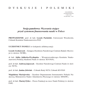 D Y S K U S J E I P O L E M I K177I ZAGADNIENIA NAUKOZNAWSTWA 3 (201), 2014 PL ISSN 0044 – 1619 Sesja panelowa: Wyzwania stojące przed systemem finansowania nauki w Polsce Prowadzenie: prof. dr hab. Leszek Pacholski, Uniwersytet Wrocławski, Członek Komitetu Naukoznawstwa PAN Uczestnicy panelu (w kolejności alfabetycznej): Leszek Grabarczyk – Zastępca Dyrektora Narodowego Centrum Badań i Rozwoju (w skrócie: NCBR), dr hab. Julita Jabłecka-Prysłopska – Wiceprzewodnicząca Komitetu Naukoznawstwa Polskiej Akademii Nauk (w skrócie: KN PAN), prof. dr hab. Andrzej Jajszczyk – Dyrektor Narodowego Centrum Nauki (w skrócie: NCN), prof. dr hab. Janina Jóźwiak – Członek Rady NCN, Członek KN PAN Magdalena Maciejewska – Dyrektor Departamentu Instrumentów Polityki Naukowej, Ministerstwo Nauki i Szkolnictwa Wyższego (w skrócie: MNiSW), prof. dr hab. Maciej Żylicz – Prezes Fundacji na rzecz Nauki Polskiej (w skrócie: FNP) 178 Sesja panelowa: Wyzwania stojące przed systemem finansowania... Wprowadzenie do dyskusji panelowej Leszek Pacholski Rozpocznę od przedstawienia panelistów: Pani Profesor Jabłecka-Prysłopska reprezentuje KN PAN, Pani Profesor Jóźwiak jest członkiem Rady NCN-u, była też Przewodniczącą Rady FNP. Pani Magdalena Maciejewska reprezentuje Panią Minister. Kolejnymi uczestnikami są: Pan Profesor Żylicz, Prezes FNP, oraz gospodarz, Pan Profesor Jajszczyk, który jest Dyrektorem NCN, a także Pan doktor Grabarczyk, który jest zastępcą dyrektora NCBR. Poproszę panelistów o kolejne zabieranie głosu i przedstawienie swoich poglądów na temat podstawowych problemów finansowania nauki w Polsce. Bardzo proszę o rozpoczęcie Panią Profesor Jabłecką. Julita Jabłecka-Prysłopska Rozwinięcie tematu panelu chcę poprzedzić powtórzeniem pewnych pytań, które zostały nam postawione, wtedy kiedy mieliśmy się przygotowywać do uczestnictwa w panelu. W dalszej części mojej wypowiedzi stanie się jasne, dlaczego je przedstawiam. Mianowicie, chciałam zwrócić uwagę na zagadnienie: Czy granty powinny być jedyną formą finansowania badań? Jak wspierać uczonych? Czy brać pod uwagę jakość badań i ich wyników, czy również preferencje tematyczne, badania zamawiane, itd. Jedno z pytań dotyczyło kształtowania polityki naukowej: Kto i na jakiej podstawie ma ją prowadzić? W jaki sposób przeprowadzać porównanie dyscyplin? Te pytania wyznaczają problematykę niniejszego panelu. Zanim rozpocznę prezentację swojego stanowiska, chciałam przypomnieć istotny dokument, dotyczący tematyki, będącej przedmiotem panelu. W 1971 roku profesor L. Rotschild (1971) w Wielkiej Brytanii – warto zwrócić uwagę na fakt, że jest to rok 1971 – przygotował raport dotyczący następujących kwestii: Czy w Wielkiej Brytanii prowadzi się za dużo badań, czy też za mało, czy też wystarczająco? Czy powinno się przeprowadzać więcej badań w laboratoriach rządowych, czy więcej zlecać na zewnątrz?, Jakie powinny być proporcje finansowania badań podstawowych i stosowanych? Jakie badania, które były ówcześnie prowadzone, nie powinny zostać finansowane? Nota bene, jedno z naszych pytań panelowych zostało niemal dosłownie tak samo sformułowanie. Jakie badania, których się nie prowadzi, powinno się prowadzić? Czy istnieje odpowiedni aparat zdolny do oceniana na poziomie centralnym całości prac badawczo-rozwojowych. To są pytania, które zostały postawione w 1971 roku. Muszę przyznać, że pytania, na które my mamy odpowiedzieć, bardzo przypominają mi te poprzednie pytania i zastanawia mnie, dlaczego one się powtarzają. Można wskazać różne powody, dla których one będą Sesja panelowa: Wyzwania stojące przed systemem finansowania... 179 się powtarzać. Po pierwsze, nie ma idealnego rozwiązania, które sugerowałoby, jak te kwestie rozstrzygać. Po drugie, można postawić pytanie, czy nauka może w tej sprawie dać rozstrzygnięcia? Otóż, wydaje mi się, że tylko w pewnym zakresie, ale generalnie, tego typu decyzje, o których mamy dyskutować, mają charakter polityczny i nie da się tego przełożyć na żaden algorytm wypracowany naukowo oraz na żadne uniwersalne zasady. Można jedynie wykorzystywać pewne wyniki badań dotyczących nauki i jej rozwoju, czyli na przykład innowacji. Tak się rzeczywiście działo na przestrzeni historii polityki naukowej, kiedy najpierw zakładano, że istnieje liniowy model innowacji, w związku z czym, jeżeli wspiera się badania podstawowe, to one nieuchronnie będą dawać wyniki praktyczne, co uznawano za uzasadnienie finansowania badań podstawowych. W latach 1980. sytuacja się zmieniła, gdy badacze innowacyjności zaproponowali wprowadzenie alternatywnego modelu rozwoju innowacji, tzw. model związanego łańcucha, który daje inne uzasadnienie finansowania badań podstawowych na tej samej zasadzie i przy takich samych preferencjach, jak badania stosowane. Można więc tylko ewentualnie zwracać uwagę na to, że pewne proporcje się zmieniają, natomiast ogólna zasada jest zachowana. Jak zatem w tym kontekście przedstawiają się pytania, na które mamy odpowiedzieć? Niektóre stwierdzenia wydają mi się oczywiste, ale mimo wszystko je przywołam. Czy granty powinny być jedyną, czy też główną formą finansowania badań, i co z badaniami statutowymi? Otóż, za tym pytaniem kryje się założenie, że po pierwsze, granty są czymś lepszym niż finansowanie podmiotowe (instytucjonalne) i że przynoszą lepsze efekty. Ja nie jestem zwolenniczką takiego podejścia. Granty występują jako jedyna forma wyłącznie w Stanach Zjednoczonych i krajach, w których kultura wolnego rynku i konkurencji jest bardzo rozwinięta. Badania, które przeprowadzono na temat kultur organizacji w różnych krajach, wskazywały na to, że tam indywidualizm jest silniejszy niż kolektywizm, w przeciwieństwie do innych krajów. W Europie nie ma natomiast takich silnyc