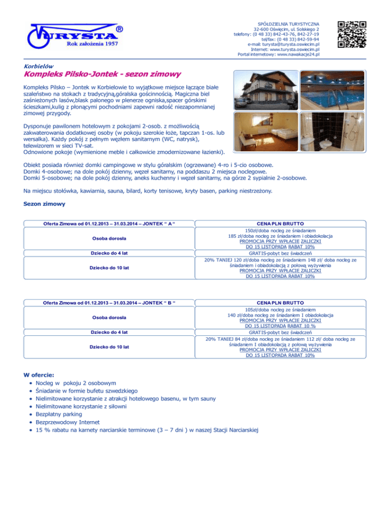 SPÓŁDZIELNIA TURYSTYCZNA 32-600 Oświęcim, ul. Solskiego 2 telefony: (0 48 33) 842-43-76, 842-27-19 tel/fax: (0 48 33) 842-59-94 e-mail: [email protected] Internet: www.turysta.oswiecim.pl Portal internetowy: www.nawakacje24.pl Korbielów Kompleks Pilsko-Jontek - sezon zimowy Kompleks Pilsko – Jontek w Korbielowie to wyjątkowe miejsce łączące białe szaleństwo na stokach z tradycyjną,góralska gościnnością. Magiczna biel zaśnieżonych lasów,blask palonego w plenerze ogniska,spacer górskimi ścieszkami,kulig z płonącymi pochodniami zapewni radość niezapomnianej zimowej przygody. Dysponuje pawilonem hotelowym z pokojami 2-osob. z możliwością zakwaterowania dodatkowej osoby (w pokoju szerokie łoże, tapczan 1-os. lub wersalka). Każdy pokój z pełnym węzłem sanitarnym (WC, natrysk), telewizorem w sieci TV-sat. Odnowione pokoje (wymienione meble i całkowicie zmodernizowane łazienki). Obiekt posiada również domki campingowe w stylu góralskim (ogrzewane) 4-ro i 5-cio osobowe. Domki 4-osobowe; na dole pokój dzienny, węzeł sanitarny, na poddaszu 2 miejsca noclegowe. Domki 5-osobowe; na dole pokój dzienny, aneks kuchenny i węzeł sanitarny, na górze 2 sypialnie 2-osobowe. Na miejscu stołówka, kawiarnia, sauna, bilard, korty tenisowe, kryty basen, parking niestrzeżony. Sezon zimowy Oferta Zimowa od 01.12.2013 – 31.03.2014 – JONTEK “ A “ Osoba dorosła Dziecko do 4 lat Dziecko do 10 lat Oferta Zimowa od 01.12.2013 – 31.03.2014 – JONTEK “ B “ Osoba dorosła Dziecko do 4 lat Dziecko do 10 lat CENA PLN BRUTTO 150zł/doba nocleg ze śniadaniem 185 zł/doba nocleg ze śniadaniem i obiadokolacja PROMOCJA PRZY WPŁACIE ZALICZKI DO 15 LISTOPADA RABAT 10% GRATIS-pobyt bez świadczeń 20% TANIEJ 120 zł/doba nocleg ze śniadaniem 148 zł/ doba nocleg ze śniadaniem i obiadokolacją z połową wyżywienia PROMOCJA PRZY WPŁACIE ZALICZKI DO 15 LISTOPADA RABAT 10% CENA PLN BRUTTO 105zł/doba nocleg ze śniadaniem 140 zł/doba nocleg ze śniadaniem I obiadokolacja PROMOCJA PRZY WPŁACIE ZALICZKI DO 15 LISTOPADA RABAT 10 % GRATIS-pobyt bez świadczeń 20% TANIEJ 84 zł/doba nocleg ze śniadaniem 112 zł/ doba nocleg ze śniadaniem I obiadokolacją z połową wyżywienia PROMOCJA PRZY WPŁACIE ZALICZKI DO 15 LISTOPADA RABAT 10% W ofercie: Nocleg w pokoju 2 osobowym Śniadanie w formie bufetu szwedzkiego Nielimitowane korzystanie z atrakcji hotelowego basenu, w tym sauny Nielimitowane korzystanie z siłowni Bezpłatny parking Bezprzewodowy Internet 15 % rabatu na karnety narciarskie terminowe (3 – 7 dni ) w naszej Stacji Narciarskiej