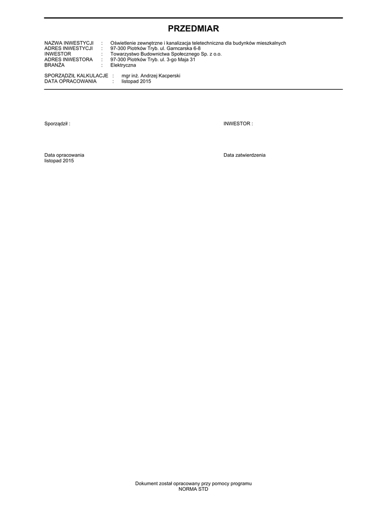 PRZEDMIAR NAZWA INWESTYCJI ADRES INWESTYCJI INWESTOR ADRES INWESTORA BRANŻA : : : : : Oświetlenie zewnętrzne i kanalizacja teletechniczna dla budynków mieszkalnych 97-300 Piotrków Tryb. ul. Garncarska 6-8 Towarzystwo Budownictwa Społecznego Sp. z o.o. 97-300 Piotrków Tryb. ul. 3-go Maja 31 Elektryczna SPORZĄDZIŁ KALKULACJE : DATA OPRACOWANIA : mgr inż. Andrzej Kacperski listopad 2015 Sporządził : INWESTOR : Data opracowania listopad 2015 Data zatwierdzenia Dokument został opracowany przy pomocy programu NORMA STD PRZEDMIAR Oświetlenie zewnętrzne i kanalizacja teletechniczna dla budynków mieszkalnych - ul. Garncarska 6-8 Lp. Opis i wyliczenia j.m. Poszcz Oświetlenie zewnętrzne i kanalizacja teletechniczna dla budynków mieszkalnych - ul. Garncarska 6-8 1 Budowa studni kablowych prefabrykowanych rozdzielczych SK-2 dwuelementowych w stud. gruncie kat.III 3 stud. 3.000 RAZEM 2 Budowa kanalizacji kablowej z rur PCW w gr.kat.III, 1 warstw.w ciągu kan., 1 rur.w wars- m twie, 1 otw.w ciągu kan. 80 m 80.000 RAZEM 3 Kopanie rowów dla kabli w sposób ręczny w gruncie kat. III m3 25.60 m3 25.600 RAZEM 4 Nasypanie warstwy piasku na dnie rowu kablowego o szerokości do 0.4 m m 150 m 150.000 RAZEM 5 Zasypywanie rowów dla kabli wykonanych ręcznie w gruncie kat. III m3 18 m3 18.000 RAZEM 6 Nasypanie warstwy piasku na dnie rowu kablowego o szerokości do 0.4 m m 164 m 164.000 RAZEM 7 Montaż latarń oświetleniowych parkowych (ogrodowych) z ustawieniem fundamentu pre- kpl. fabrykowanego 3 kpl. 3.000 RAZEM 8 Montaż opraw oświetlenia zewnętrznego na słupie szt. 3 szt. 3.000 RAZEM 9 Montaż przewodów do opraw oświetleniowych - wciąganie w słupy, rury osłonowe i wy- kpl.prze sięgniki przy wysokości latarń do 7 m w. 3 kpl.prze 3.000 w. RAZEM 10 Układanie kabli o masie do 0.5 kg/m w rowach kablowych ręcznie m 76 m 76.000 RAZEM 11 Układanie kabli o masie do 0.5 kg/m w rurach, pustakach lub kanałach zamkniętych m 24 m 24.000 RAZEM 12 Ułożenie rur osłonowych z PCW o śr.do 140 mm m 14 m 14.000 RAZEM 13 Podłączenie przewodów kabelkowych o przekroju żyły do 6 mm2 pod zaciski lub bolce szt.żył 18 szt.żył 18.000 RAZEM 14 Mechaniczne pogrążanie uziomów pionowych prętowych w gruncie kat.III m 3 m 3.000 RAZEM 15 Badania i pomiary instalacji uziemiającej (pierwszy pomiar) szt. 1 szt. 1.000 RAZEM 16 Badanie linii kablowej N.N.- kabel 3-żyłowy odc. 1 odc. 1.000 RAZEM 17 Sprawdzenie i pomiar 1-fazowego obwodu elektrycznego niskiego napięcia pomiar 3 pomiar 3.000 RAZEM 18 Sprawdzenie samoczynnego wyłączania zasilania (pierwsza próba) prób. 1 prób. 1.000 RAZEM 19 Sprawdzenie samoczynnego wyłączania zasilania (następna próba) prób. 2 prób. 2.000 RAZEM 20 Uruchomienie i sprawdzenie kpl 1 kpl 1.000 RAZEM -2- Norma STD Wersja 4.21 Razem 3.000 80.000 25.600 150.000 18.000 164.000 3.000 3.000 3.000 76.000 24.000 14.000 18.000 3.000 1.000 1.000 3.000 1.000 2.000 1.000 ZESTAWIENIE ROBOCIZNY Oświetlenie zewnętrzne i kanalizacja teletechniczna dla budynków mieszkalnych - ul. Garncarska 6-8 Lp. 1. robocizna Nazwa Jm r-g Ilość Cena jedn. 276.9583 RAZEM Wartość Słownie: ZESTAWIENIE MATERIAŁÓW Lp. 1. 2. 3. 4. 5. 6. 7. 8. 9. 10. 11. 12. 13. 14. 15. 16. 17. 18. 19. 20. 21. 22. Nazwa lakier asfaltowy Taśma z folii polietyl.do znak.tras kablow Piasek naturalny kopany piasek cement 25 beton zwykły B 17 Rura kanalizacji zewnętrznej kielichowa fi 200 uszczel. gr. ścianki 5mm lampa oświetleniowa kompletna LED 37W w/g opisu w projekcie rura PVC fi 90mm złącze 4-śrubowe pręt D16/bednarka uziom stalowy ocynkowany D16x3000 opaski kablowe typu Oki Przewód YDY-450/750V 3x2,5mm2 Przewód YDY-450/750V 3x6mm2 słup stylowy 5 m – w/g opisu w projekcie fundament betonowy prefabrykowany B-60 Studnia SKR-1 komplet. element łącznikowy tabliczka słupowa 1-bezpiecznikowa wkładka topikowa D01 6A główka bezpiecznikowa D002 materiały pomocnicze Jm dm3 m m3 m3 t m3 m Ilość 10.5000 79.0400 17.5840 0.0300 0.0090 0.0900 81.6000 Il inw. Il wyk. Cena jedn. 10.5000 79.0400 17.5840 0.0300 0.0090 0.0900 81.6000 kpl. 3.0000 3.0000 m szt szt szt. m m kpl. szt. szt szt szt szt szt zł 14.5600 1.0000 1.0000 9.5200 18.7200 104.0000 3.0000 3.0000 3.0000 3.0000 3.0000 3.0000 3.0000 14.5600 1.0000 1.0000 9.5200 18.7200 104.0000 3.0000 3.0000 3.0000 3.0000 3.0000 3.0000 3.0000 Wartość RAZEM Słownie: ZESTAWIENIE SPRZĘTU Lp. 1. 2. 3. 4. 5. 6. 7. 8. 9. 10. 11. Nazwa ubijak spalinowy 50 kg Wibromłot elektryczny 4,5 kW żuraw samochodowy 4 t samochód dostawczy 0.9 t Samochód dostaw.do 0.9t (1) Samochód dostaw.do 0.9t (1)' Samochód dostaw.do 0.9t (1)'' samochód skrzyniowy do 5 t samochód samowyładowczy 5 t Samochód samowyład.do 5t (1) podnośnik montażowy samochodowy hydrauliczny Jm m-g m-g m-g m-g m-g m-g m-g m-g m-g m-g m-g Słownie: -3- Norma STD Wersja 4.21 Ilość Cena jedn. 7.4000 0.6150 4.3200 0.8320 1.4892 1.5000 0.1800 5.2480 11.3020 2.5120 1.9800 RAZEM Wartość